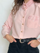 Chosen for its soft pastel shade and its exceptional detailing, this blouse instantly stands out through its delicate embroidery. The collar is the true highlight, refined and intricate, echoed by the beautifully finished chest pocket that adds character without overwhelming the piece. A feminine vintage blouse selected for its elegance, its colour and the craftsmanship visible in every detail.