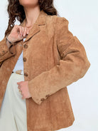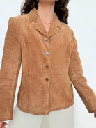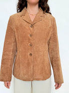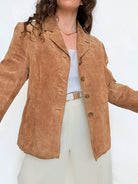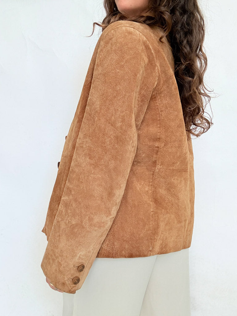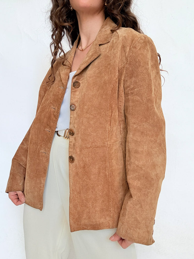 - Special features: Slightly fitted silhouette, soft suede texture, structured shoulders, front button closure, clean tailored lines