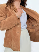 Chosen for its beautifully balanced silhouette that subtly follows the body while keeping a natural ease. The soft beige suede brings a refined warmth, giving the piece both elegance and character without ever feeling too formal. I selected it for its timeless femininity and the quiet confidence it brings, a jacket that enhances your presence with simplicity and strength.