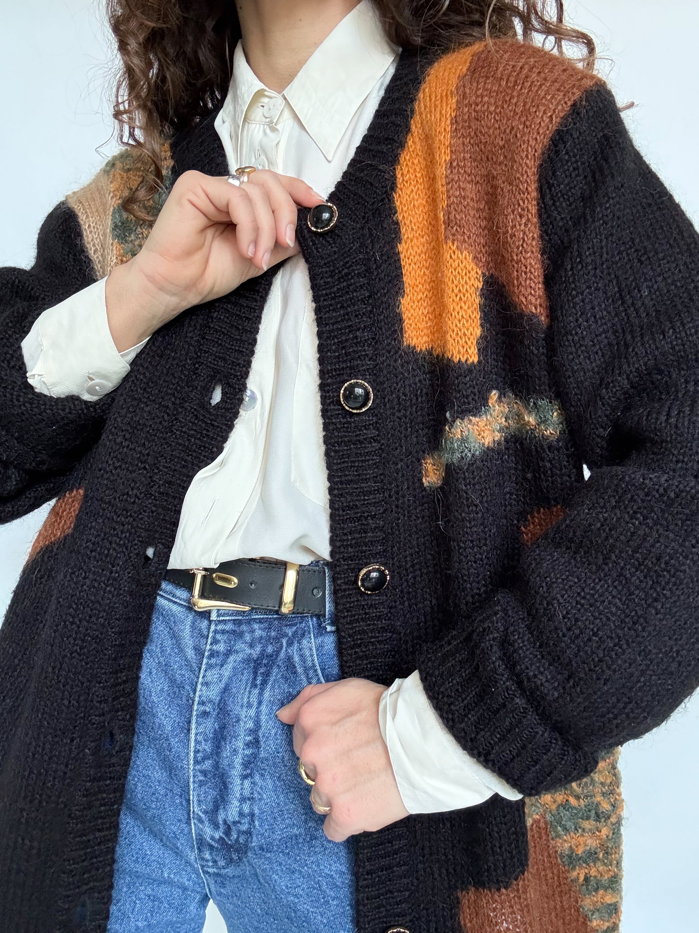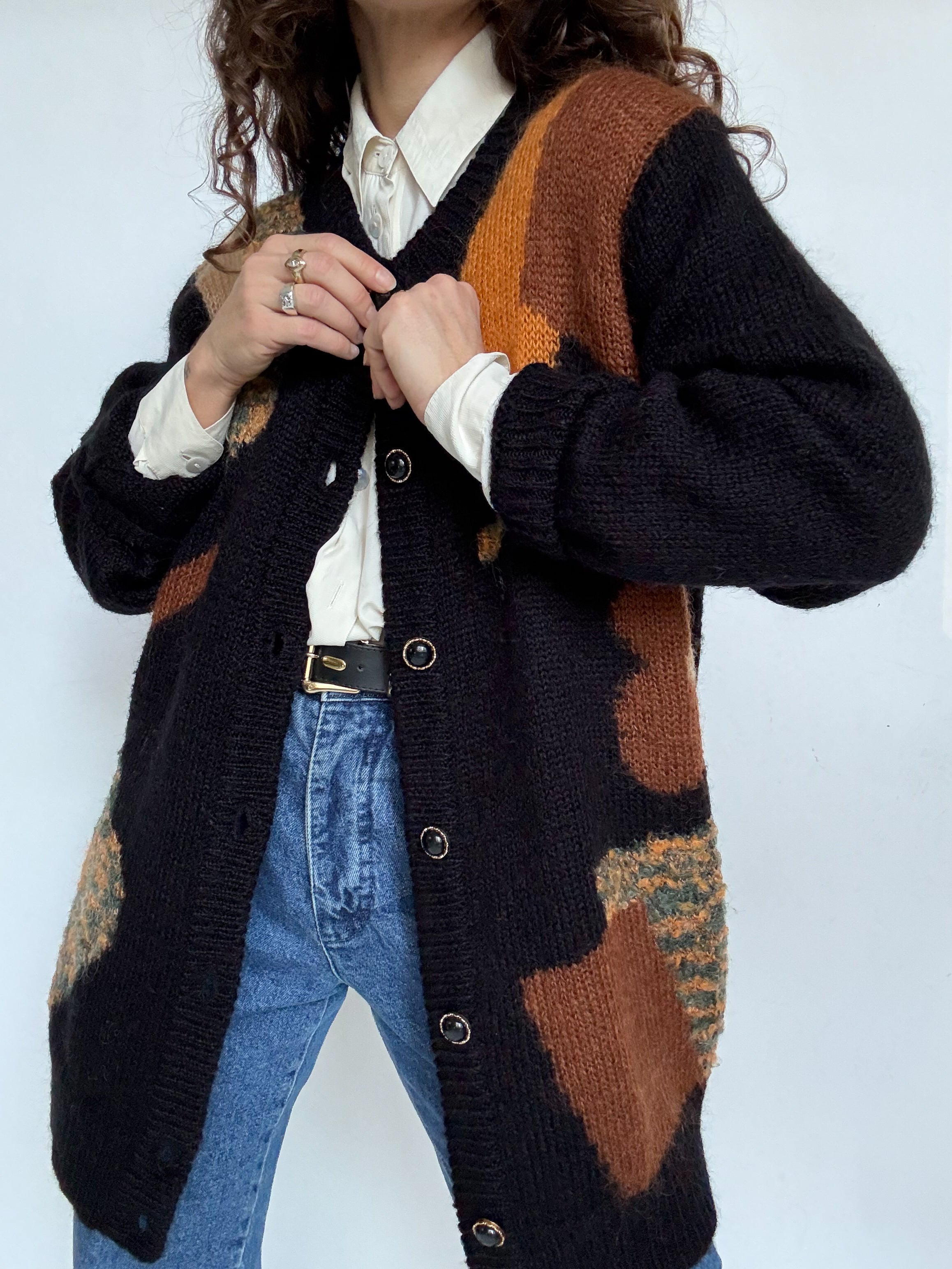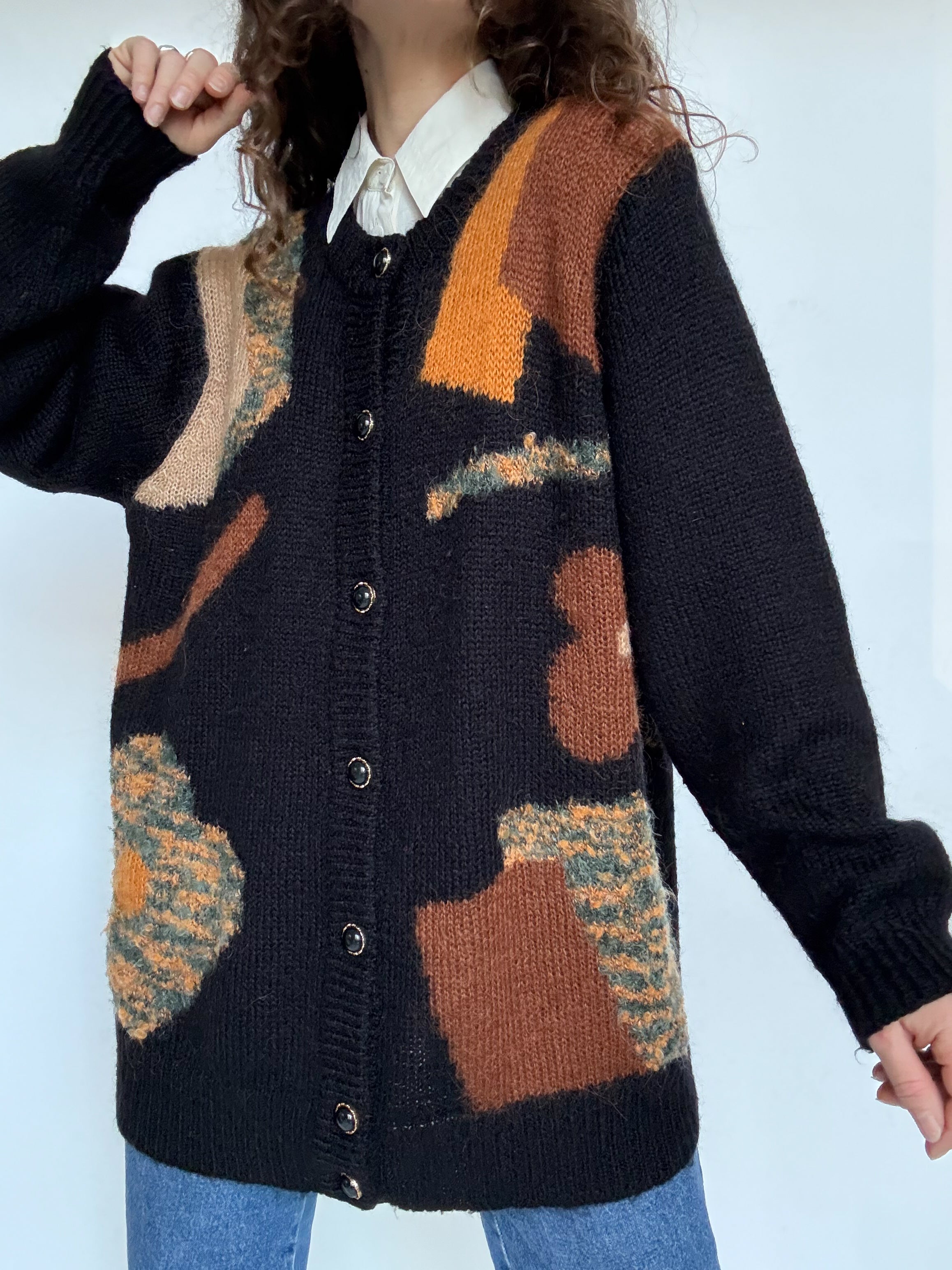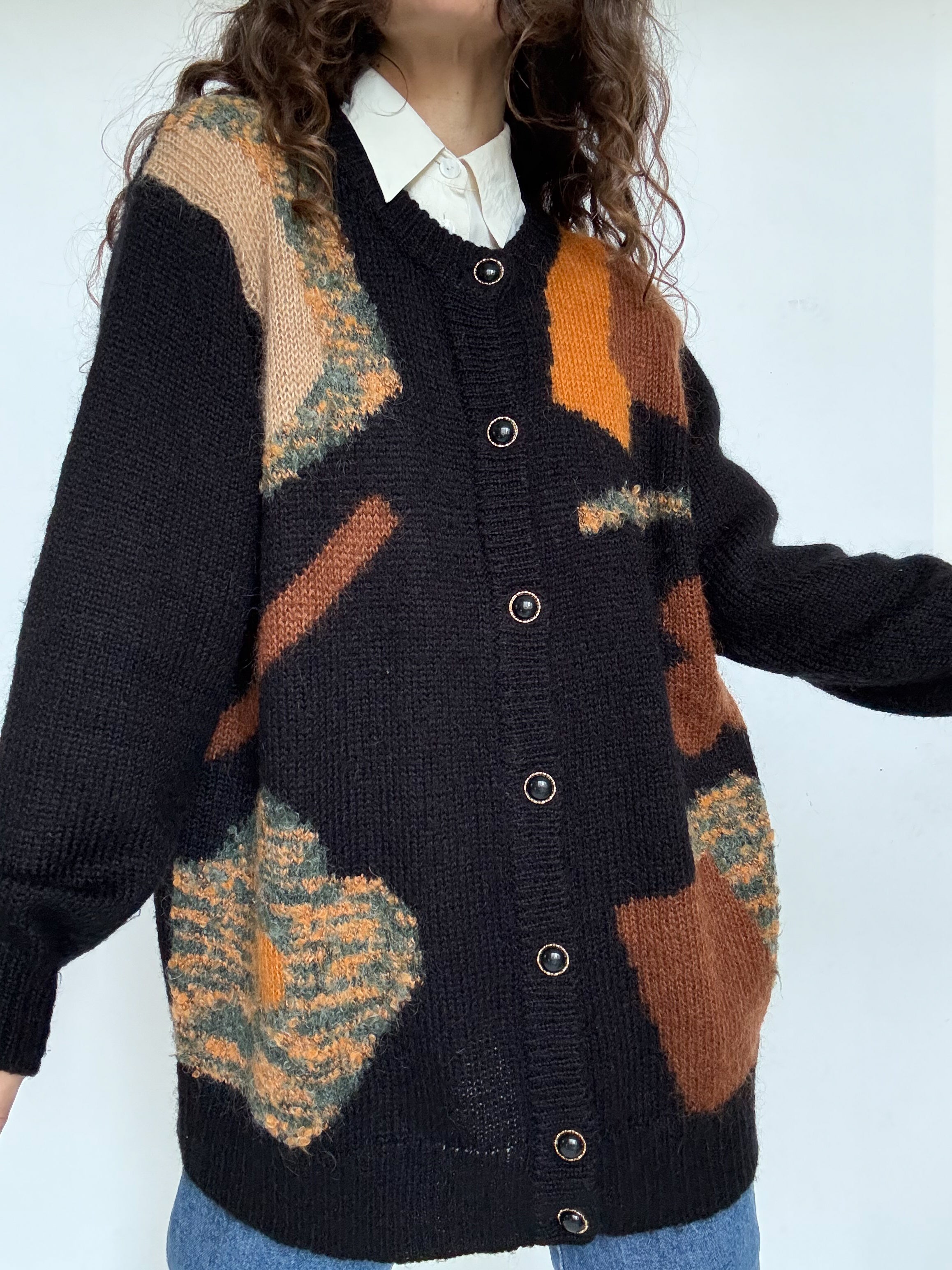 Choosen for its beautiful abstract pattern and rich textured knit. The mix of earthy tones set against the deep black background creates a strong visual contrast while remaining effortlessly elegant. Its soft mohair blend gives it that slightly fluffy feel that makes it incredibly pleasant to wear. A perfect layering piece to throw over a simple T shirt in spring, instantly adding character and depth to a look.