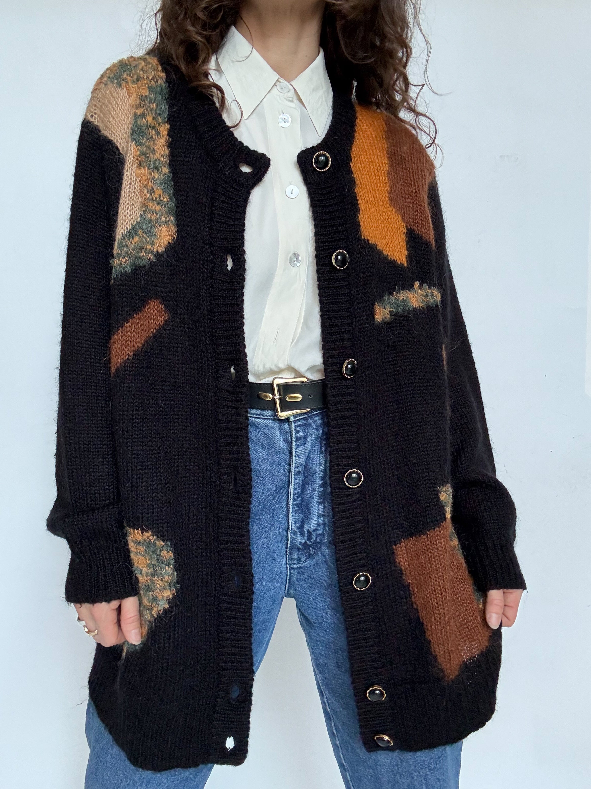- Special features: Soft fluffy mohair blend knit, abstract earthy tone pattern, relaxed silhouette, button front closure, comfortable layering piece