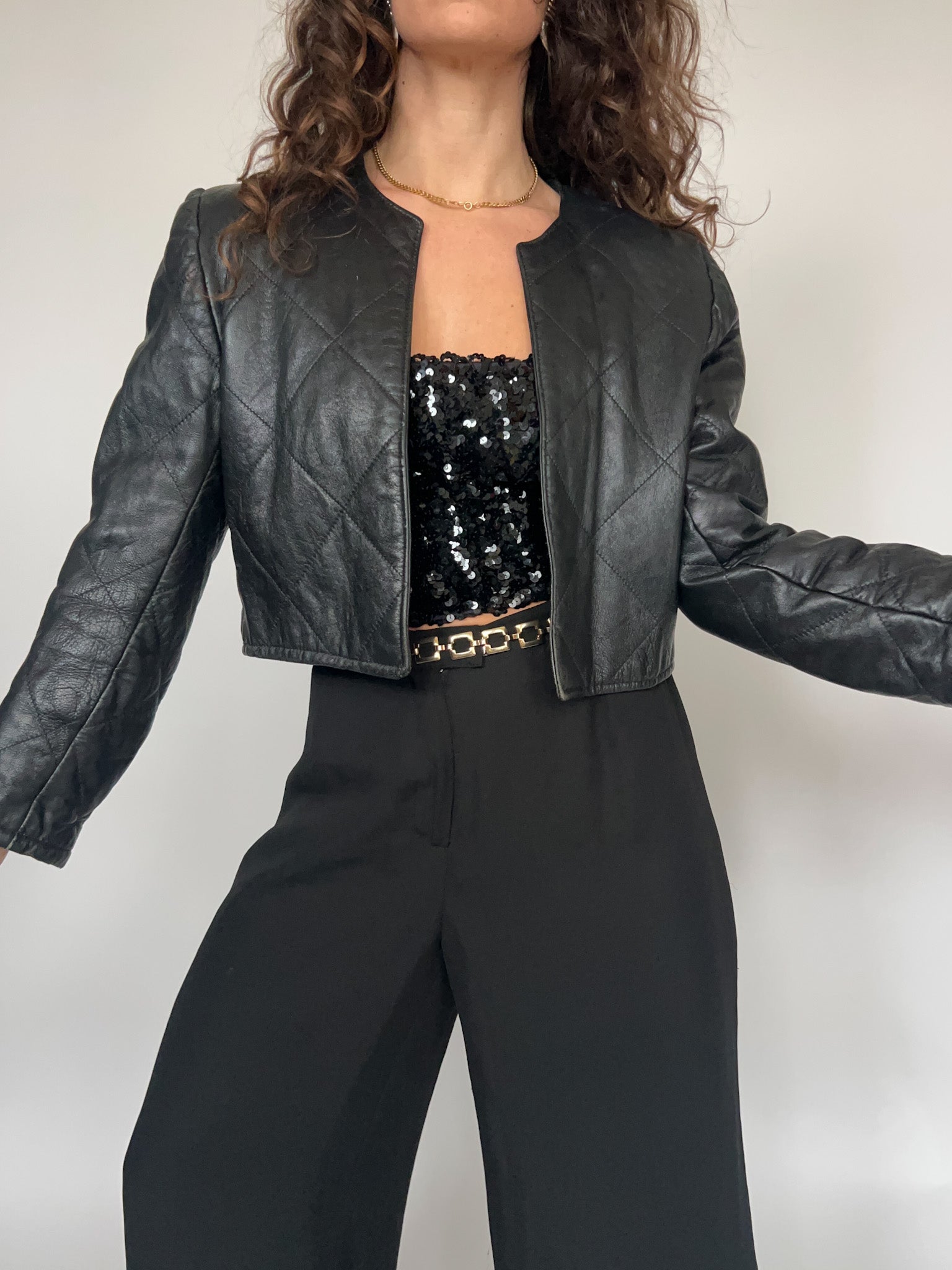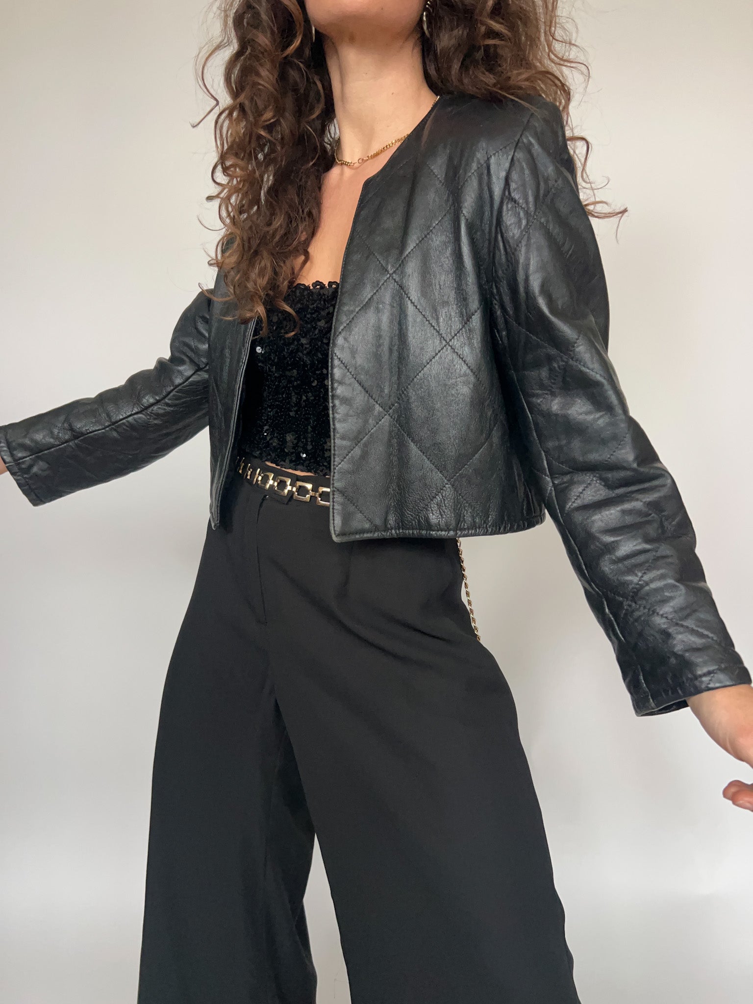 A powerful vintage leather jacket that blends sharp structure with subtle detailing. Crafted in genuine black leather, this cropped piece stands out through its quilted diamond stitching, adding texture and depth while keeping a clean, confident silhouette. The collarless neckline enhances the modern feel, making it an effortless layer that frames the body with precision. Cut close to the waist, this jacket highlights the proportions beautifully and brings a strong 90’s attitude to any look. Worn over a delicate top or styled with high waisted trousers, it delivers contrast, character, and unmistakable presence. Selected in true Skorpiones Vintage spirit, this piece celebrates bold femininity, quality craftsmanship, and timeless strength.