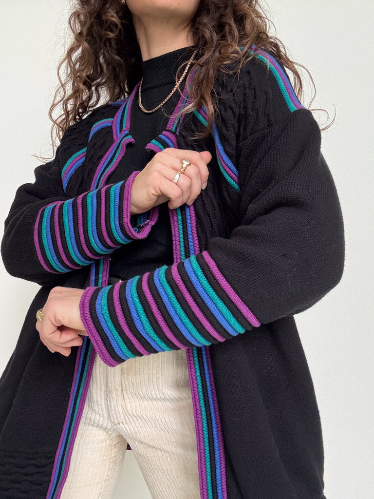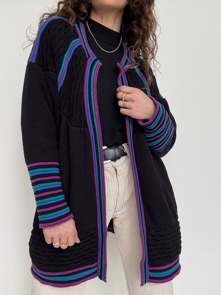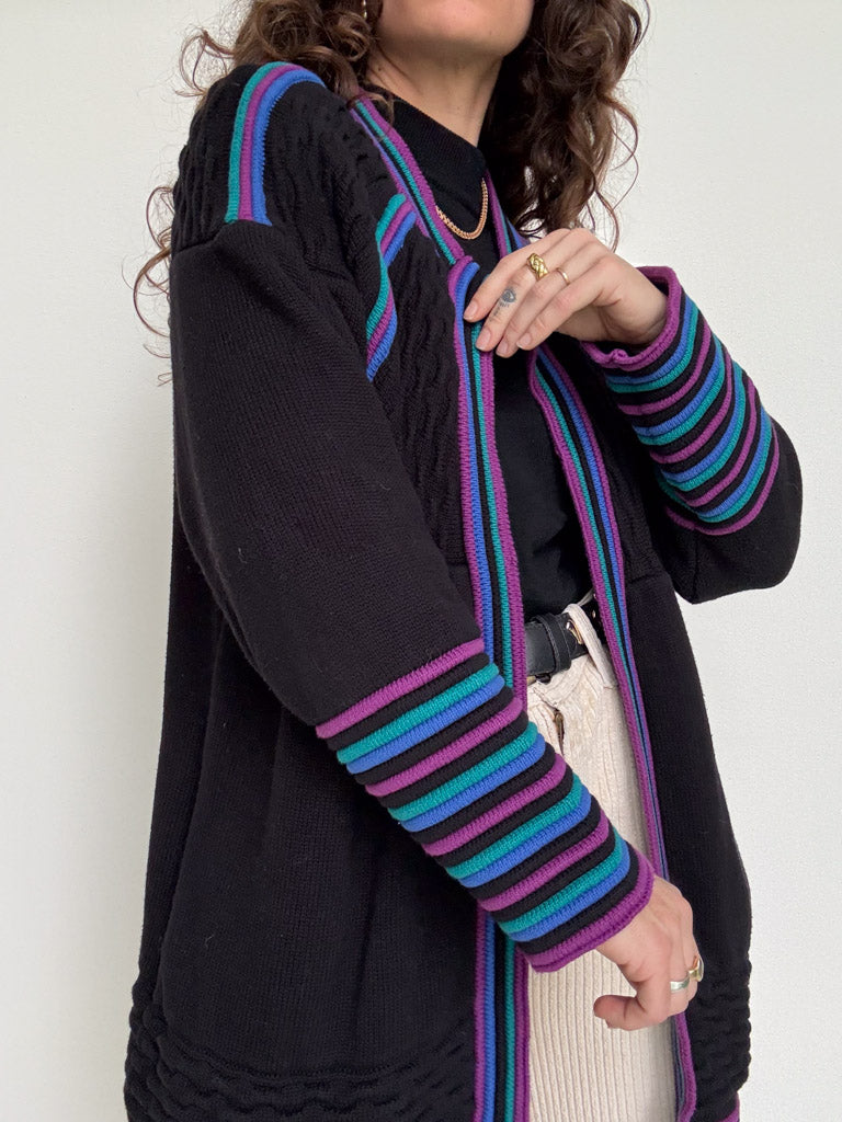 Chosen for its incredible textured details and architectural silhouette, this cardigan is a true statement piece. The structured cotton fabric gives it a beautiful rigidity, allowing the design to hold its shape effortlessly. The contrasting purple, teal and blue striped trims elevate the deep black base, and when closed, the front creates subtle rounded shapes that add a sculptural and almost artistic finish. A bold and expressive knit with undeniable presence.