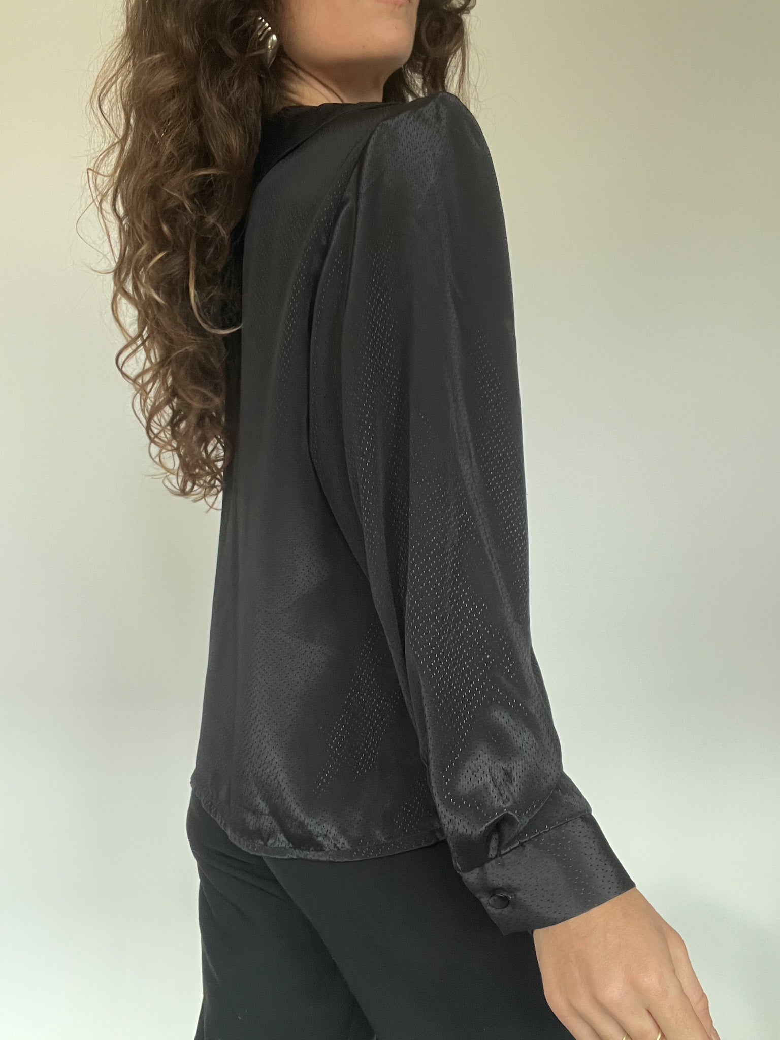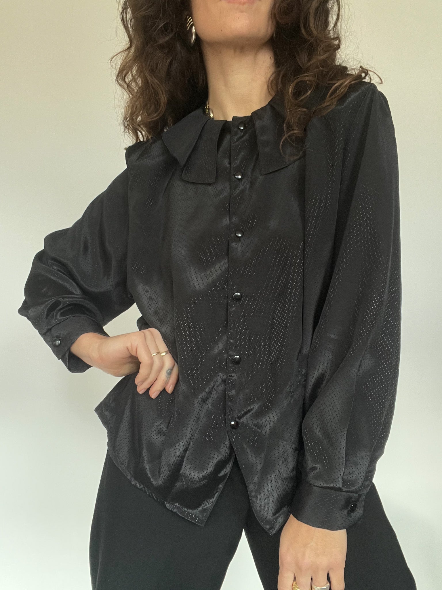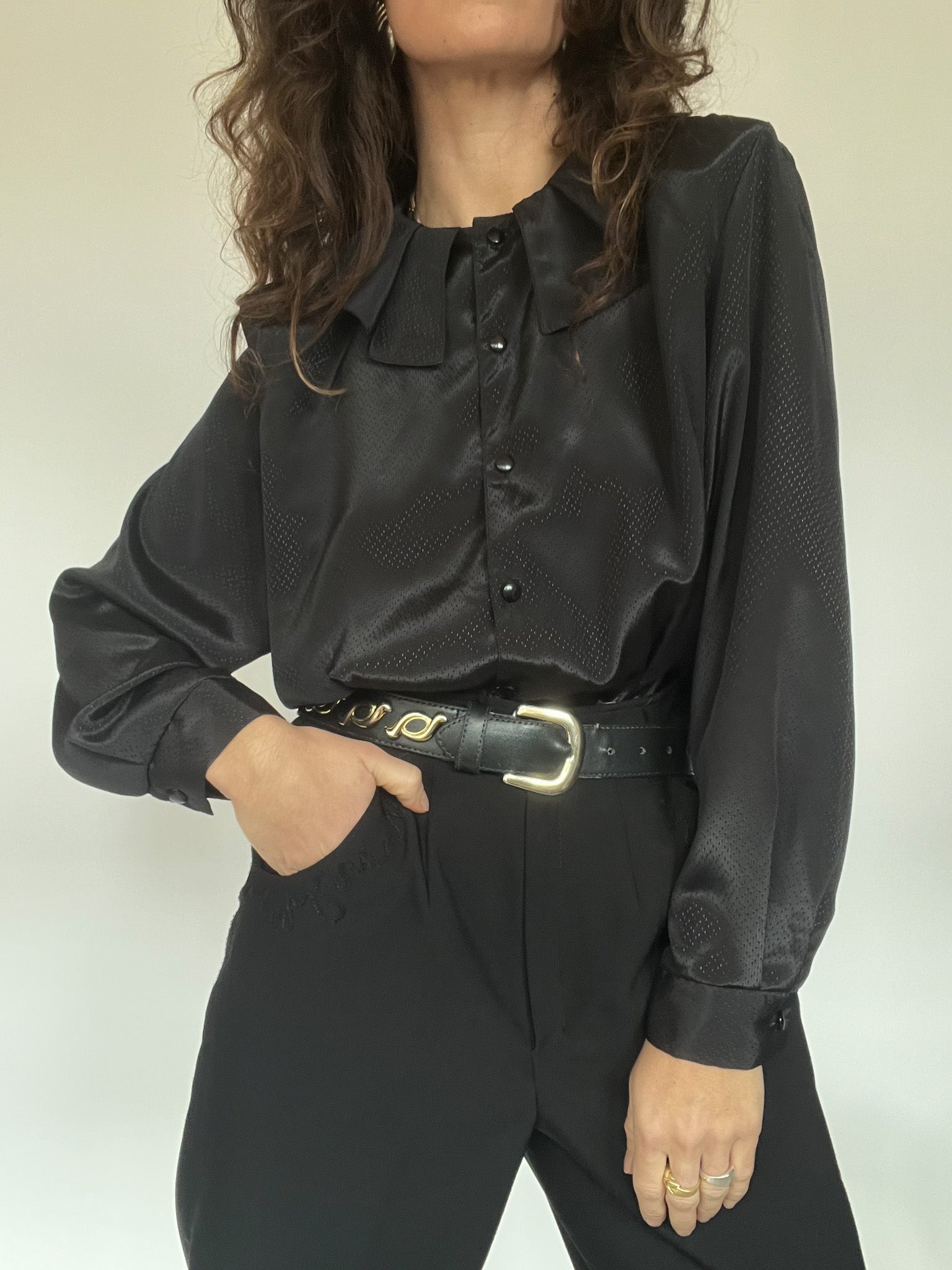 This refined black shirt from the 1990s stands out through its delicate texture and elegant ruffled collar. Crafted in a fluid polyester fabric, it offers a subtle sheen and a lightweight drape that catches the light with every movement. The softly structured cut is elevated by the collar detail, bringing a romantic yet confident touch to an otherwise timeless silhouette.