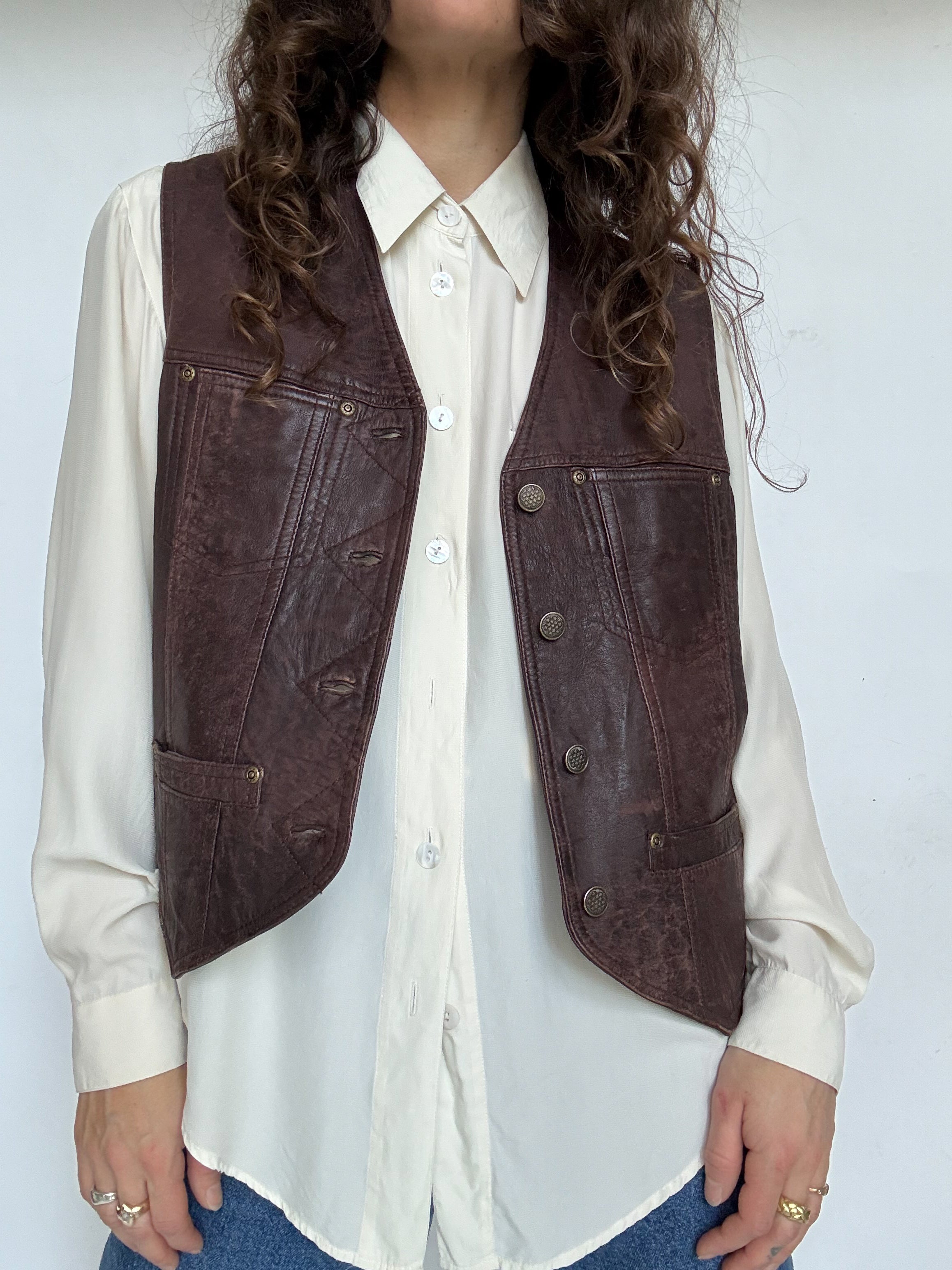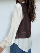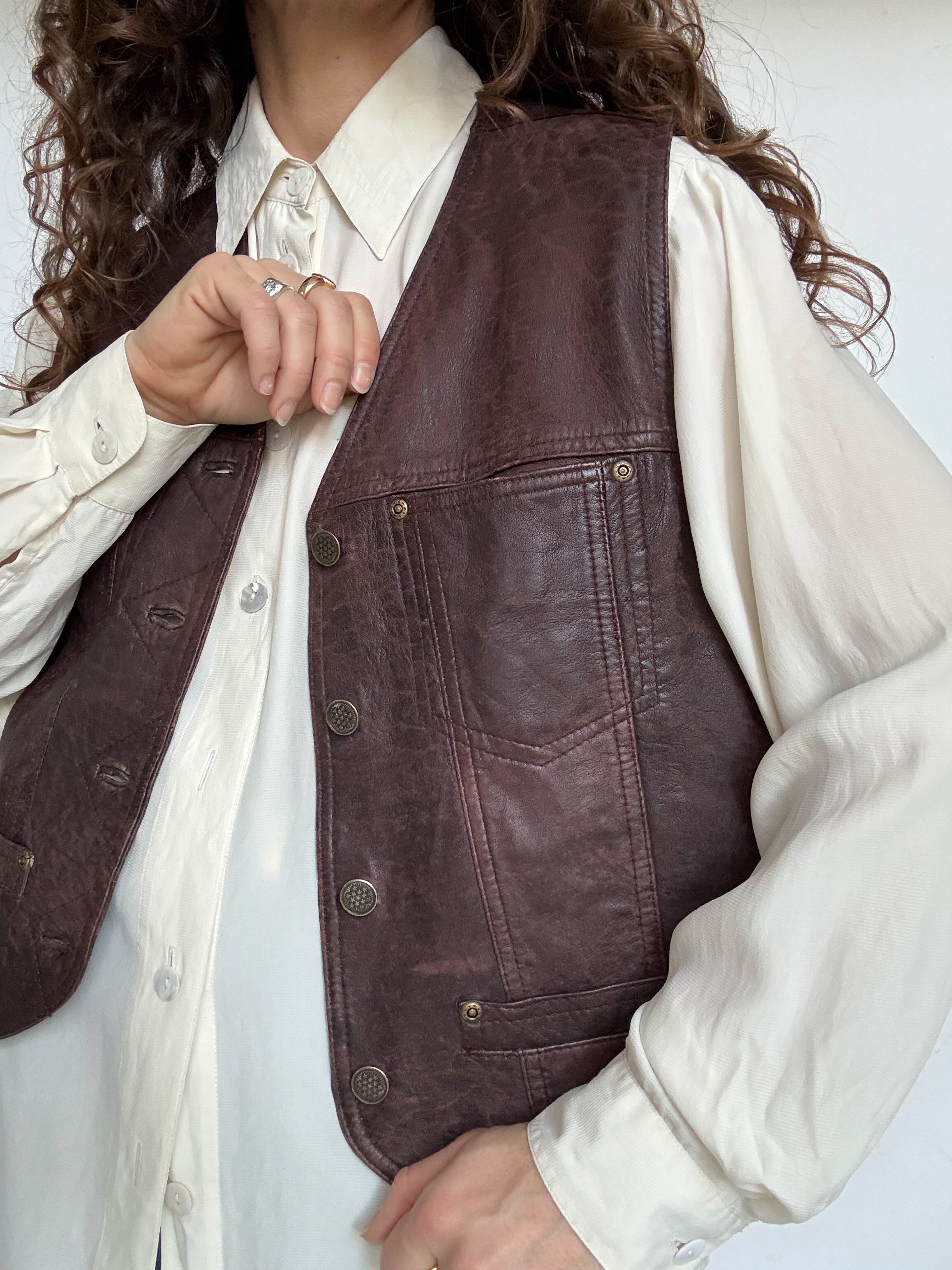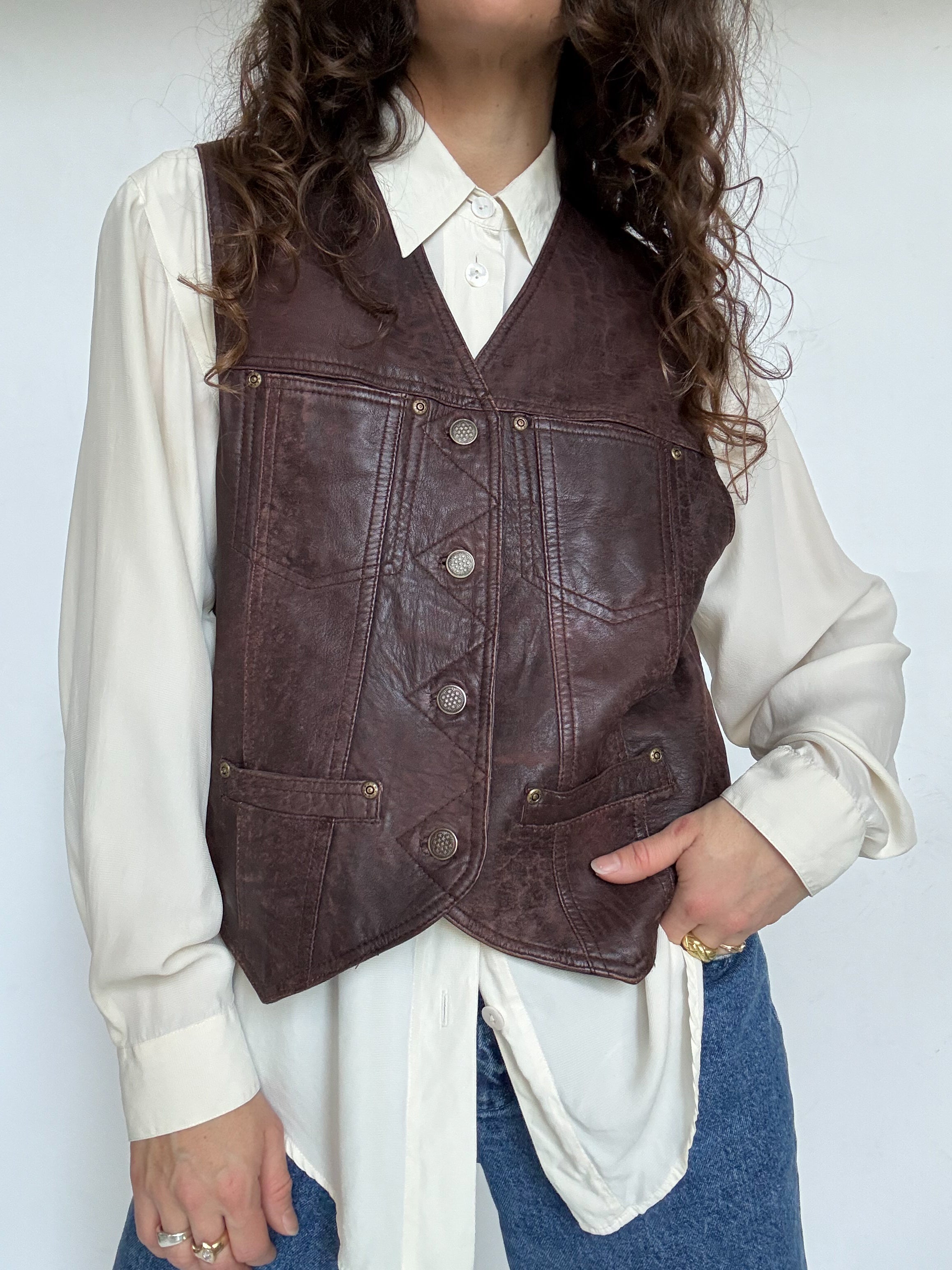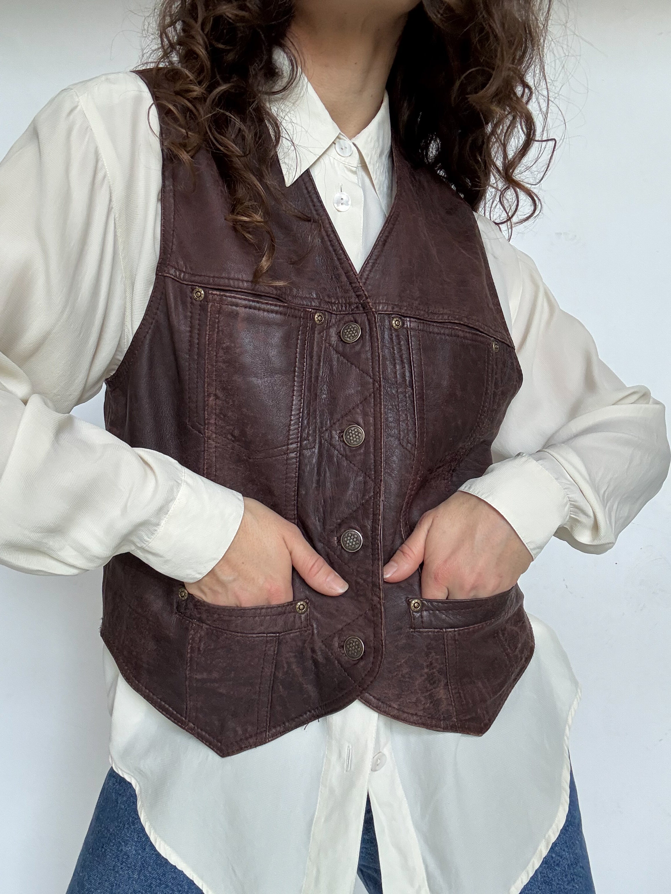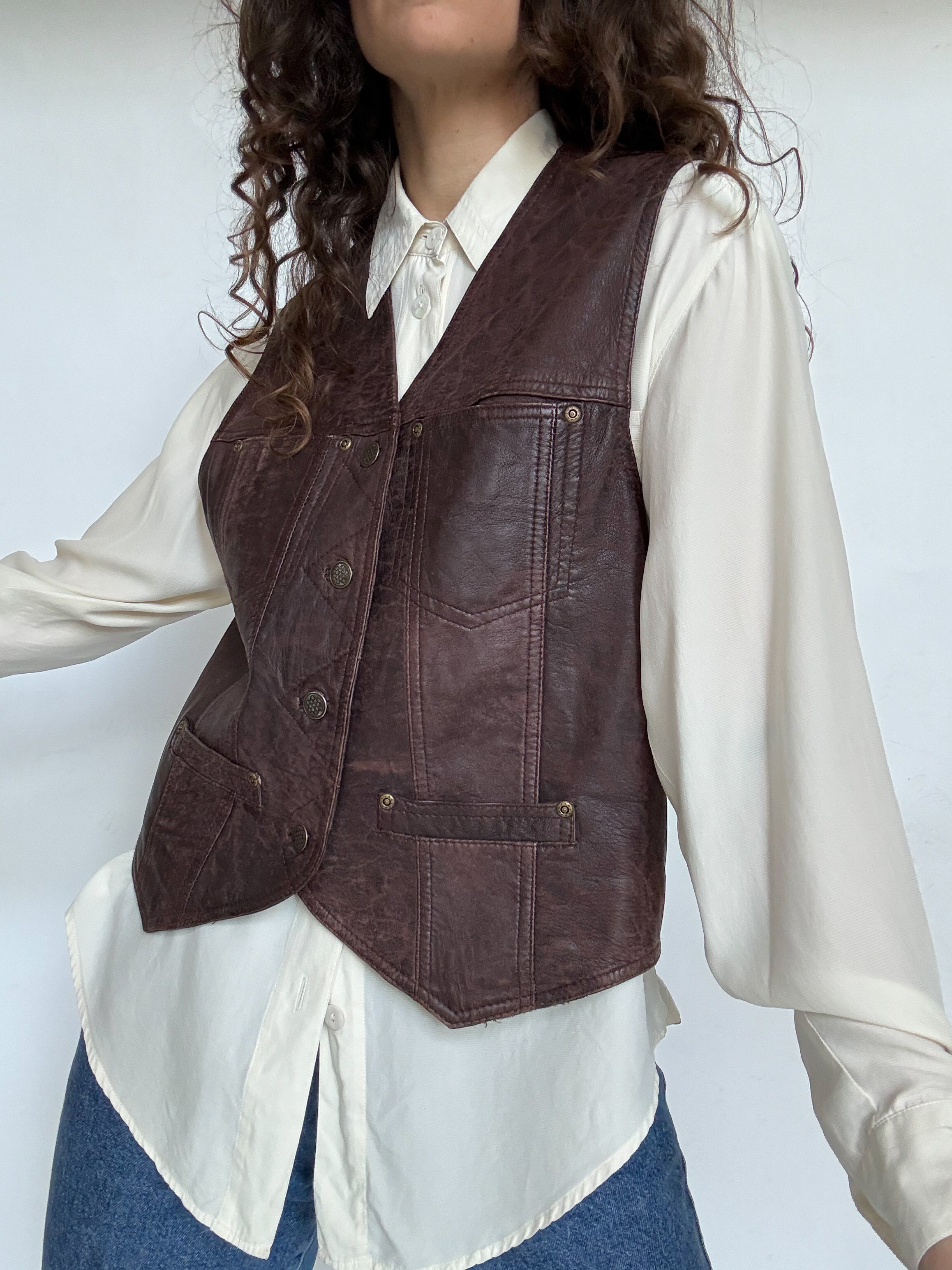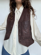 Chosen for its beautifully rich brown leather and the incredible detailing across the entire piece, this vest embodies the character and craftsmanship that make vintage leather so special. The textured patina of the leather gives it depth and personality, while the structured pockets and decorative buttons add that authentic vintage charm. A strong statement layering piece that instantly brings confidence and character to any outfit.