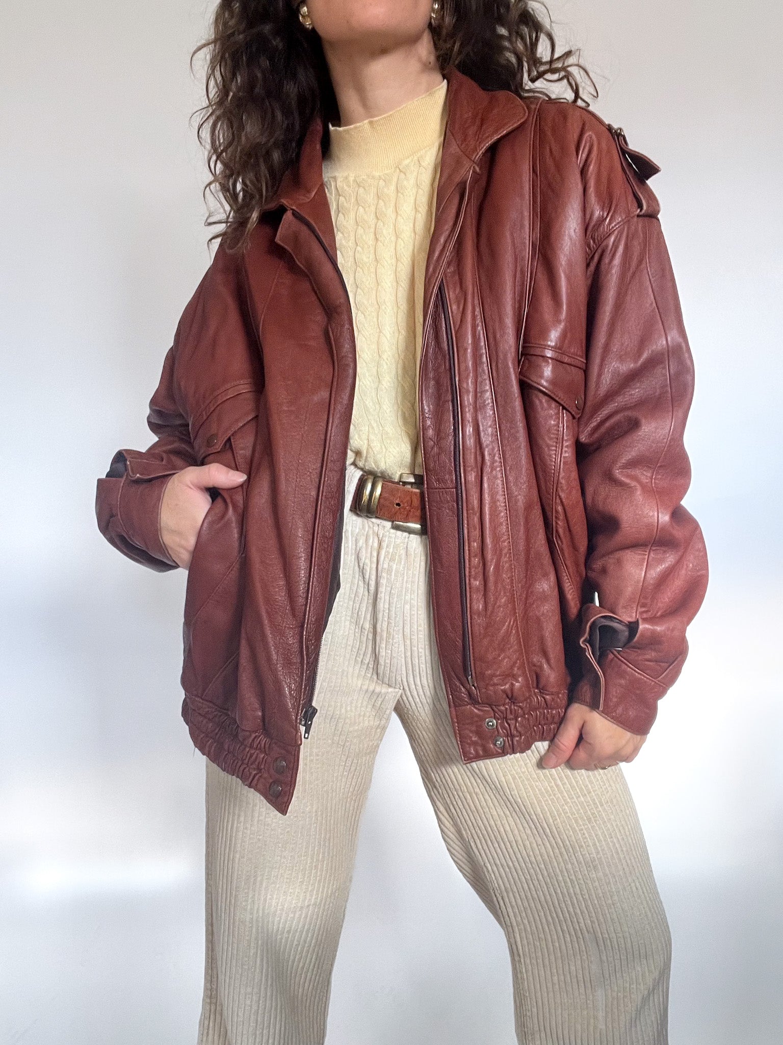 A true 90’s statement piece — bold, structured, and unapologetically powerful. This oversized leather jacket carries that iconic volume and attitude that defines the Skorpiones Vintage selection: strong shoulders, deep chest panels, and a silhouette that instantly transforms any winter look. Crafted from thick, supple chestnut leather, it channels the essence of vintage European outerwear — pieces made to last, to be lived in, and to make you feel unmistakably unique.