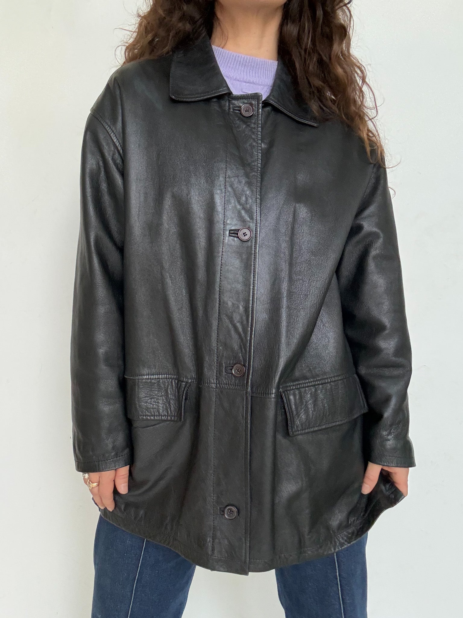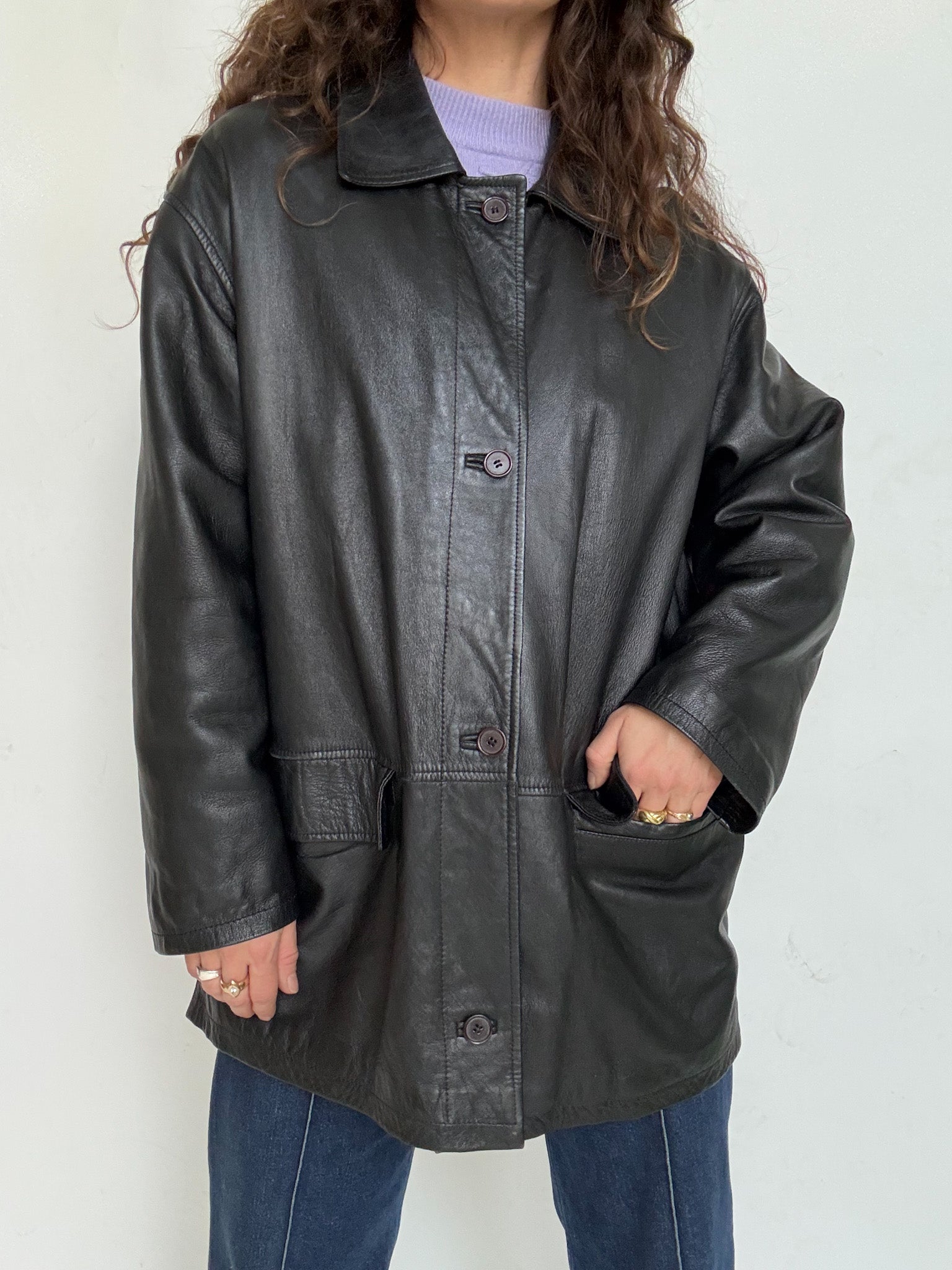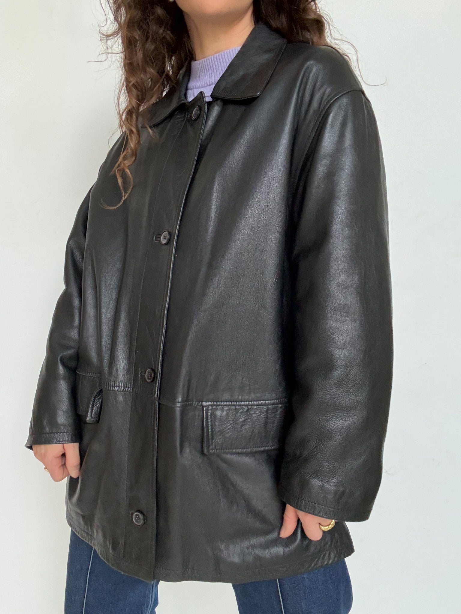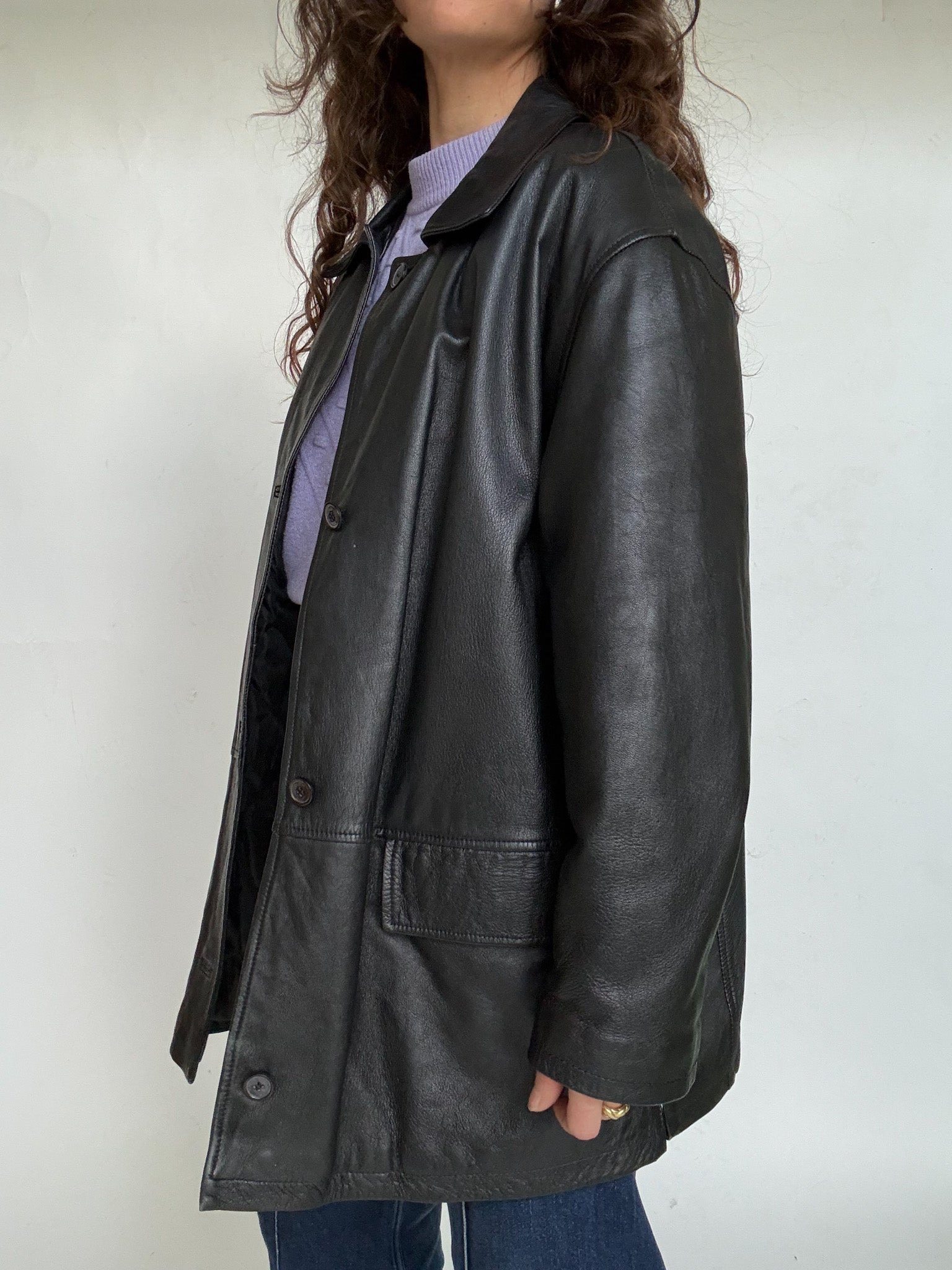 - Special features: Straight 90s cut, classic button closure, relaxed oversized potential, smooth and well preserved leather, timeless silhouette