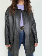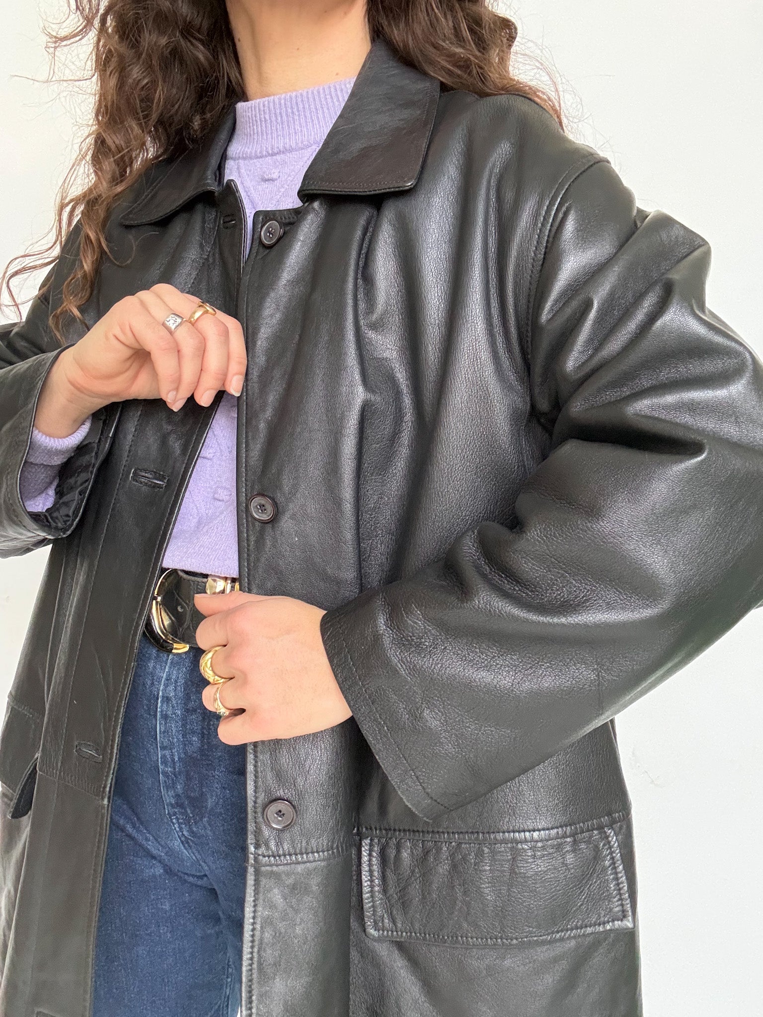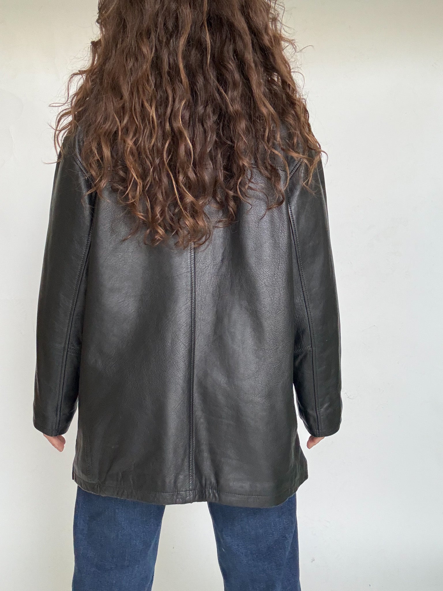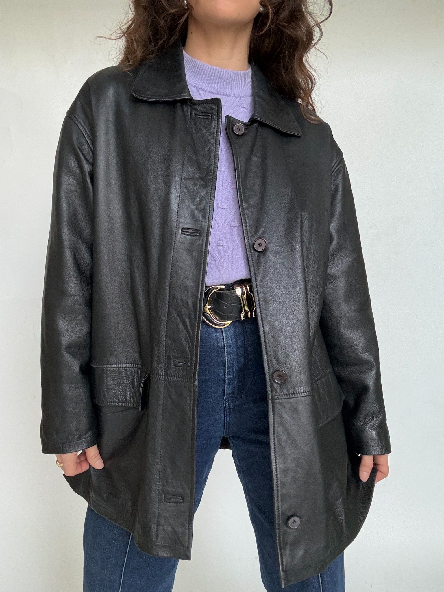 - Special features: Straight 90s cut, classic button closure, relaxed oversized potential, smooth and well preserved leather, timeless silhouette