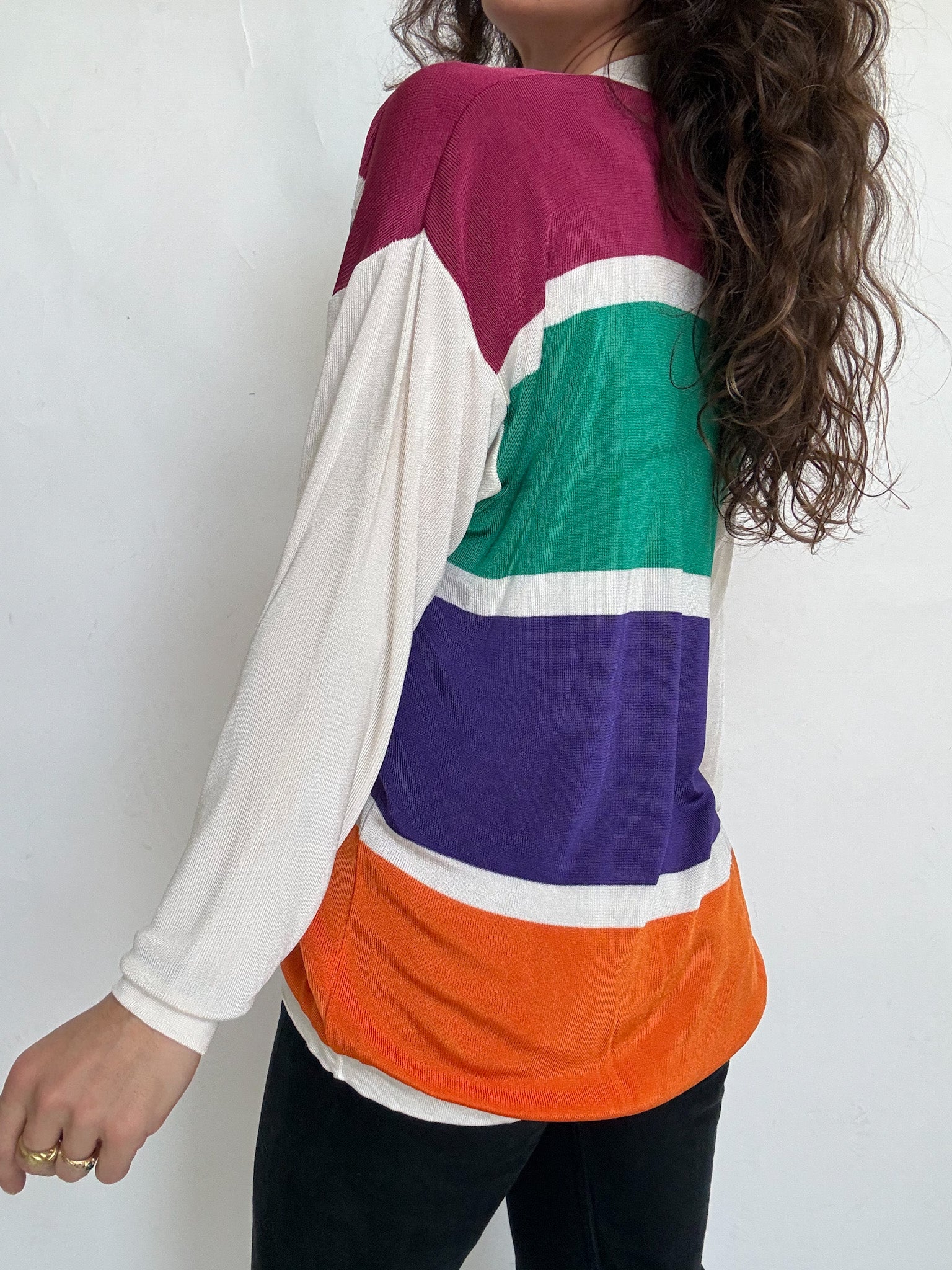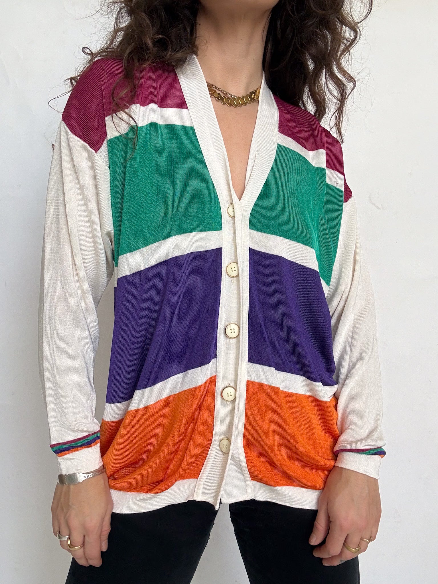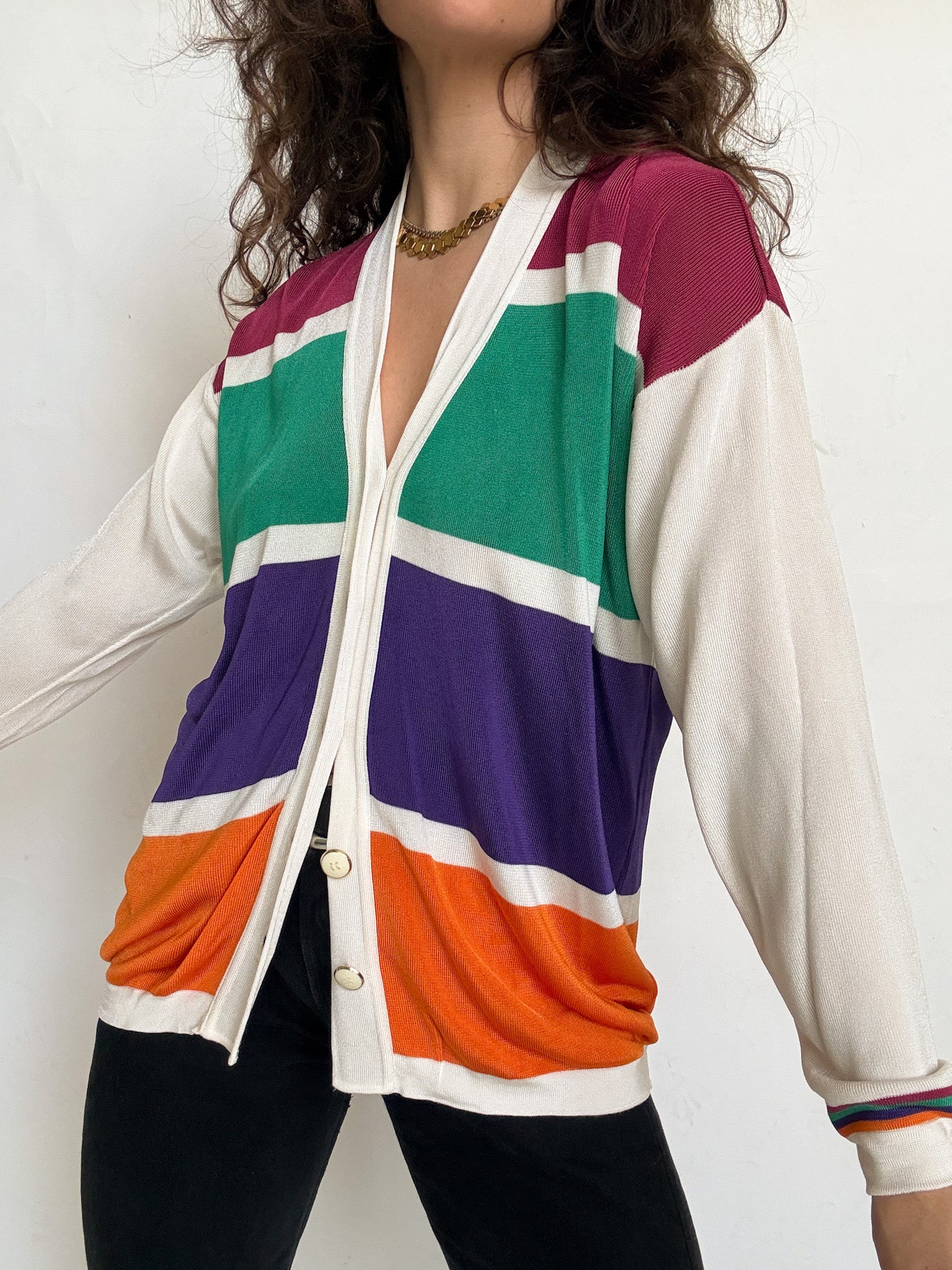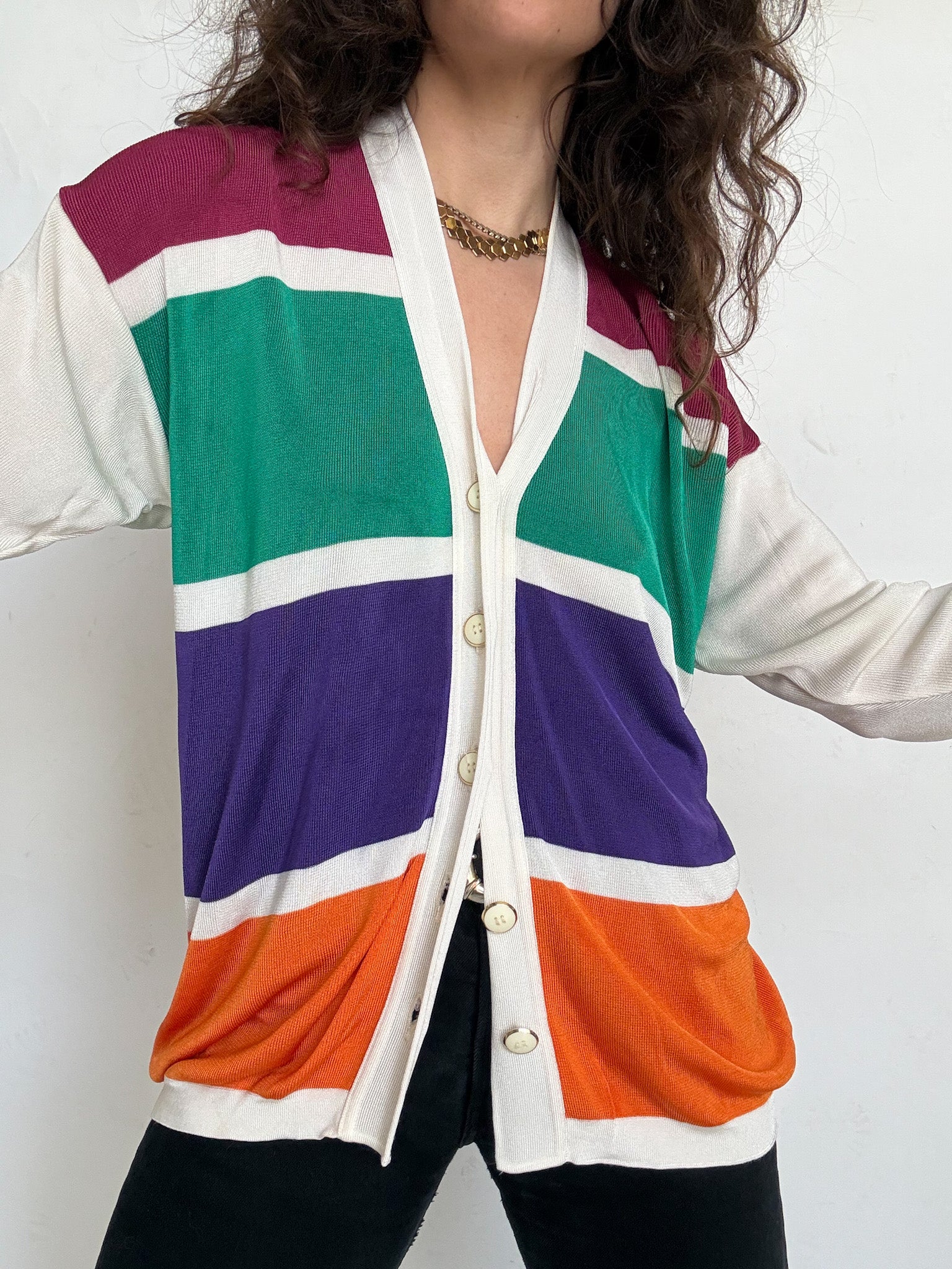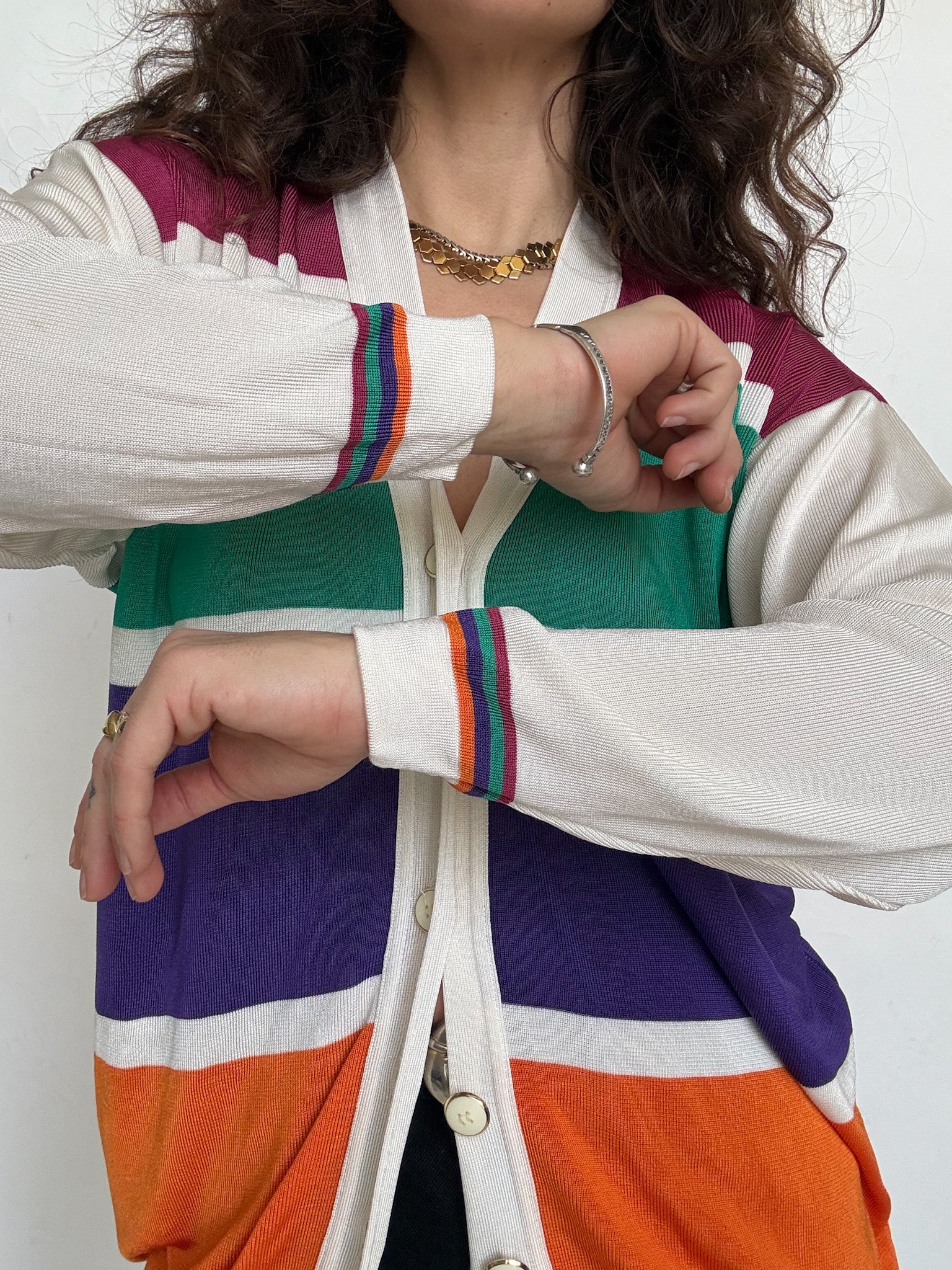 Chosen for its bold colour palette and fluid drape, this cardigan immediately brings energy to a silhouette. The ultra soft viscose fabric feels light and flexible on the body, making it as comfortable as it is striking. A statement vintage piece selected for its vibrant colours, its movement and the effortless way it elevates even the simplest look.