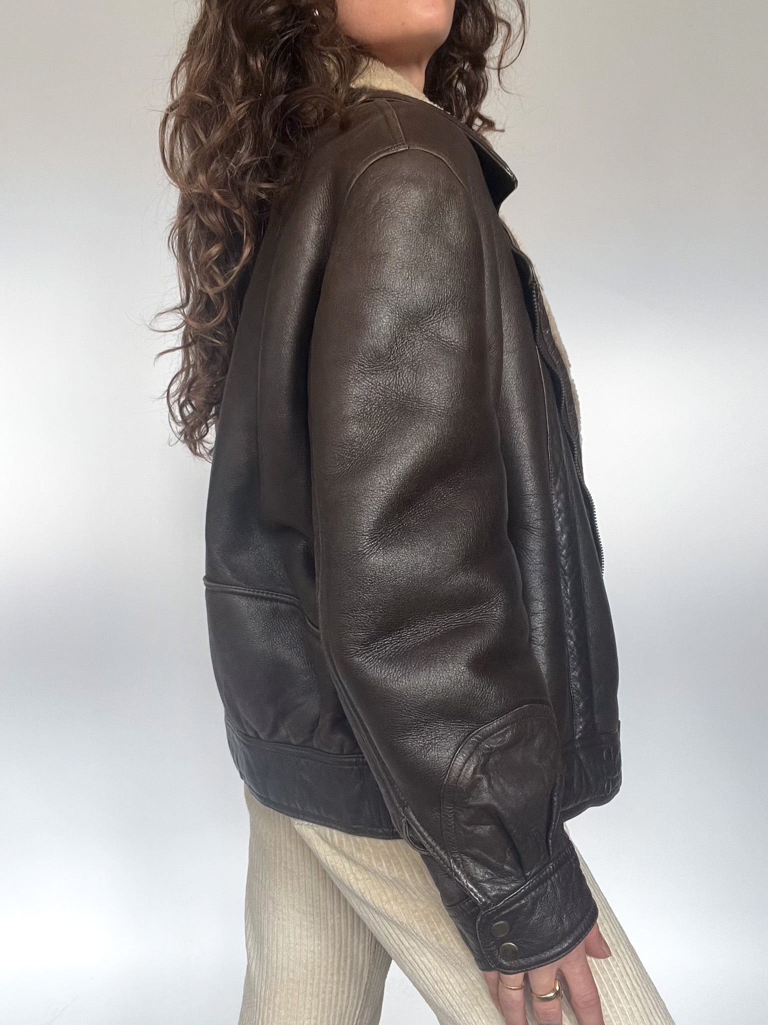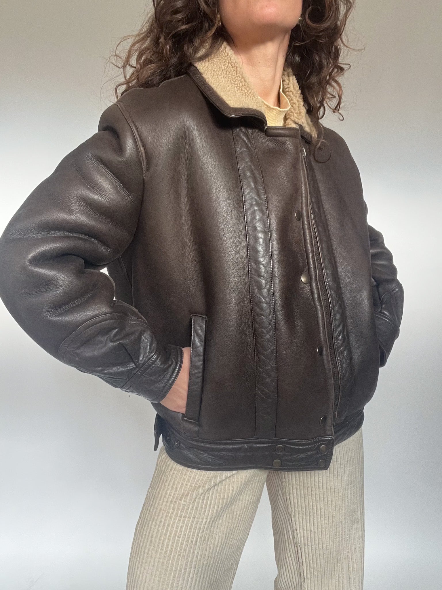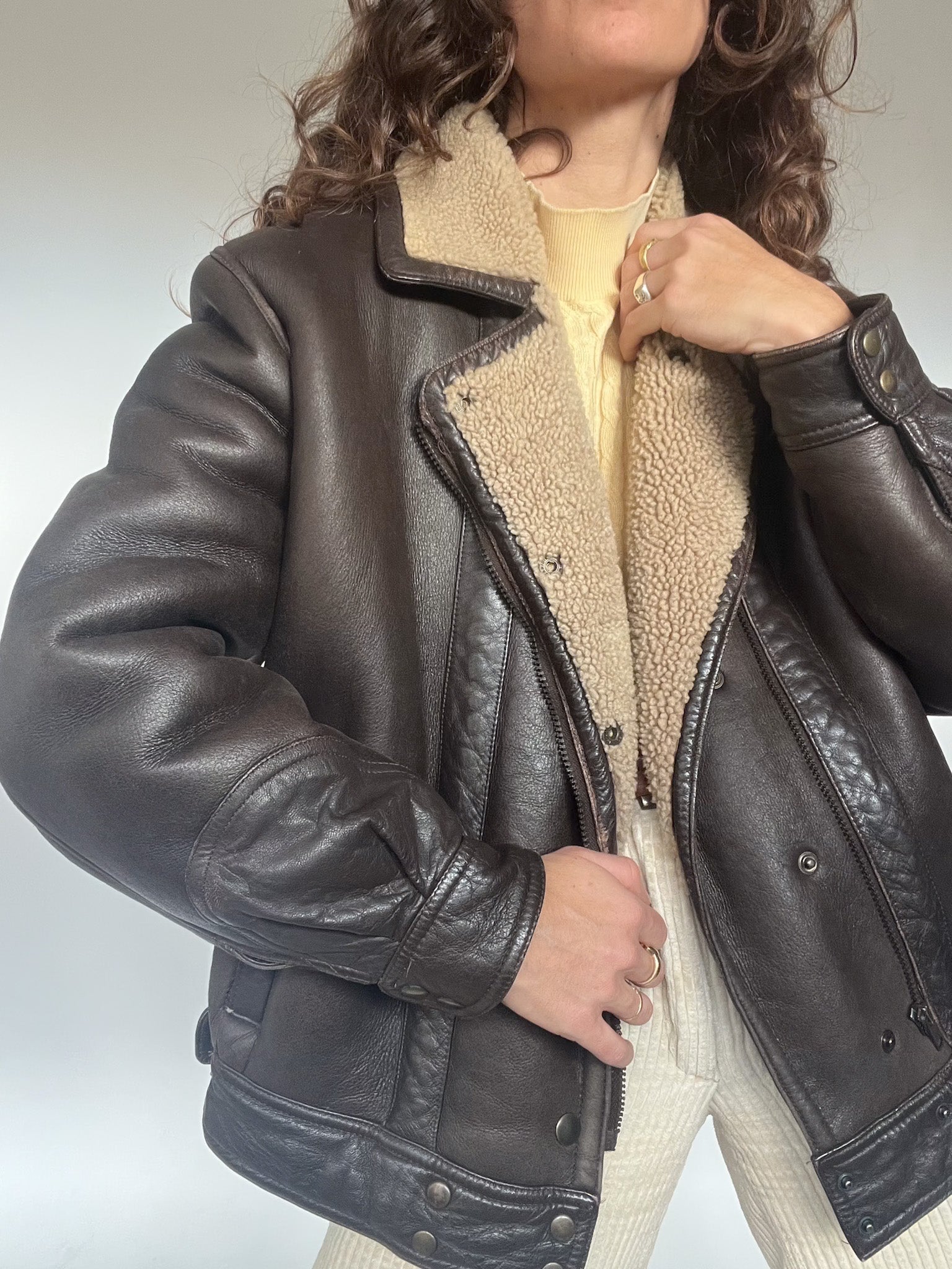 Crafted from thick, dark chocolate leather with a warm cream shearling interior, it delivers that unmistakable vintage structure: strong shoulders, deep pockets, and a cropped-yet-oversized fit that feels both timeless and statement-making.