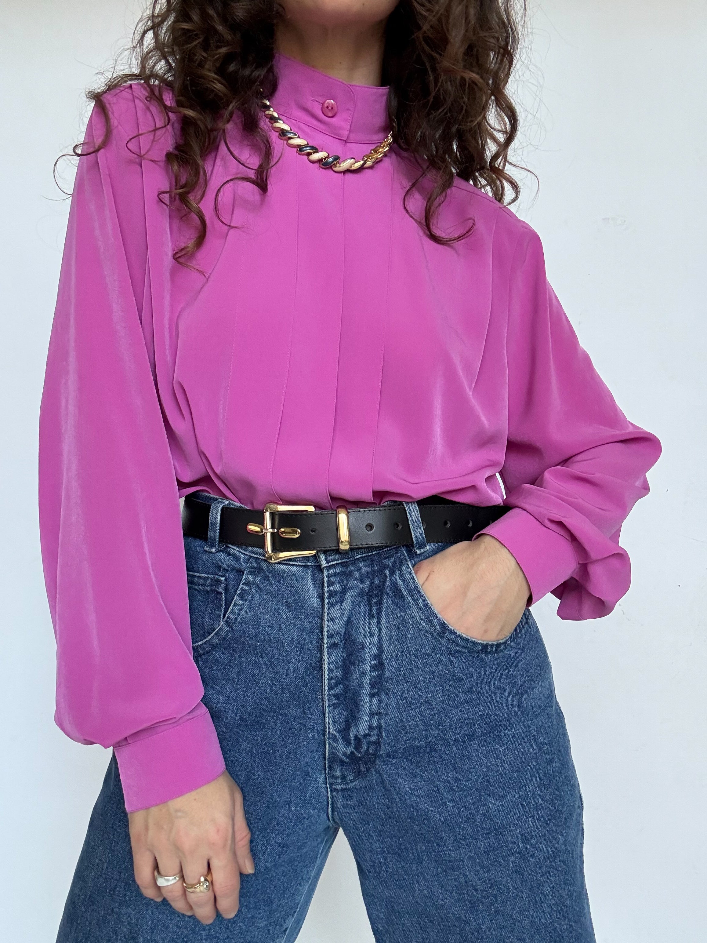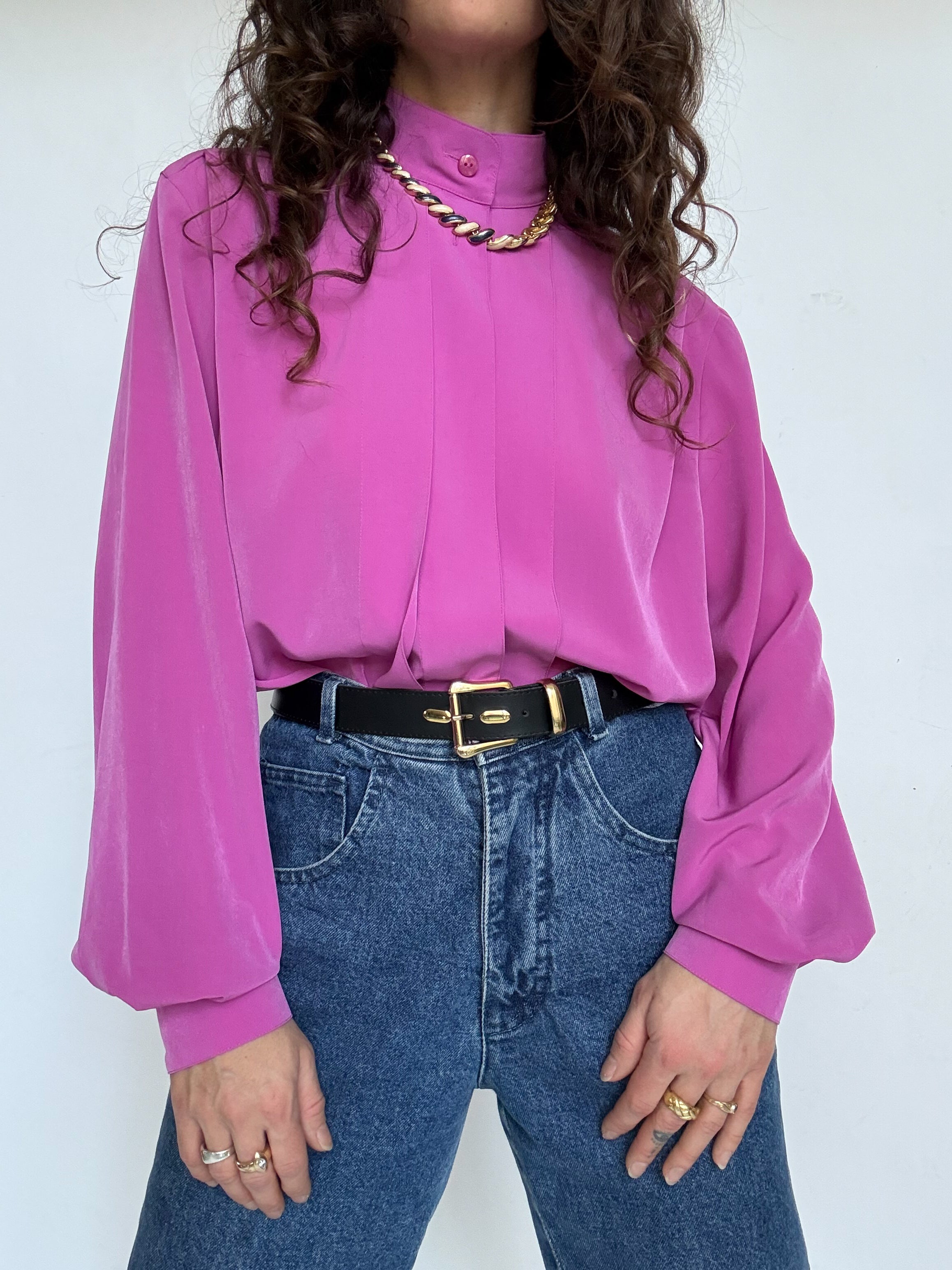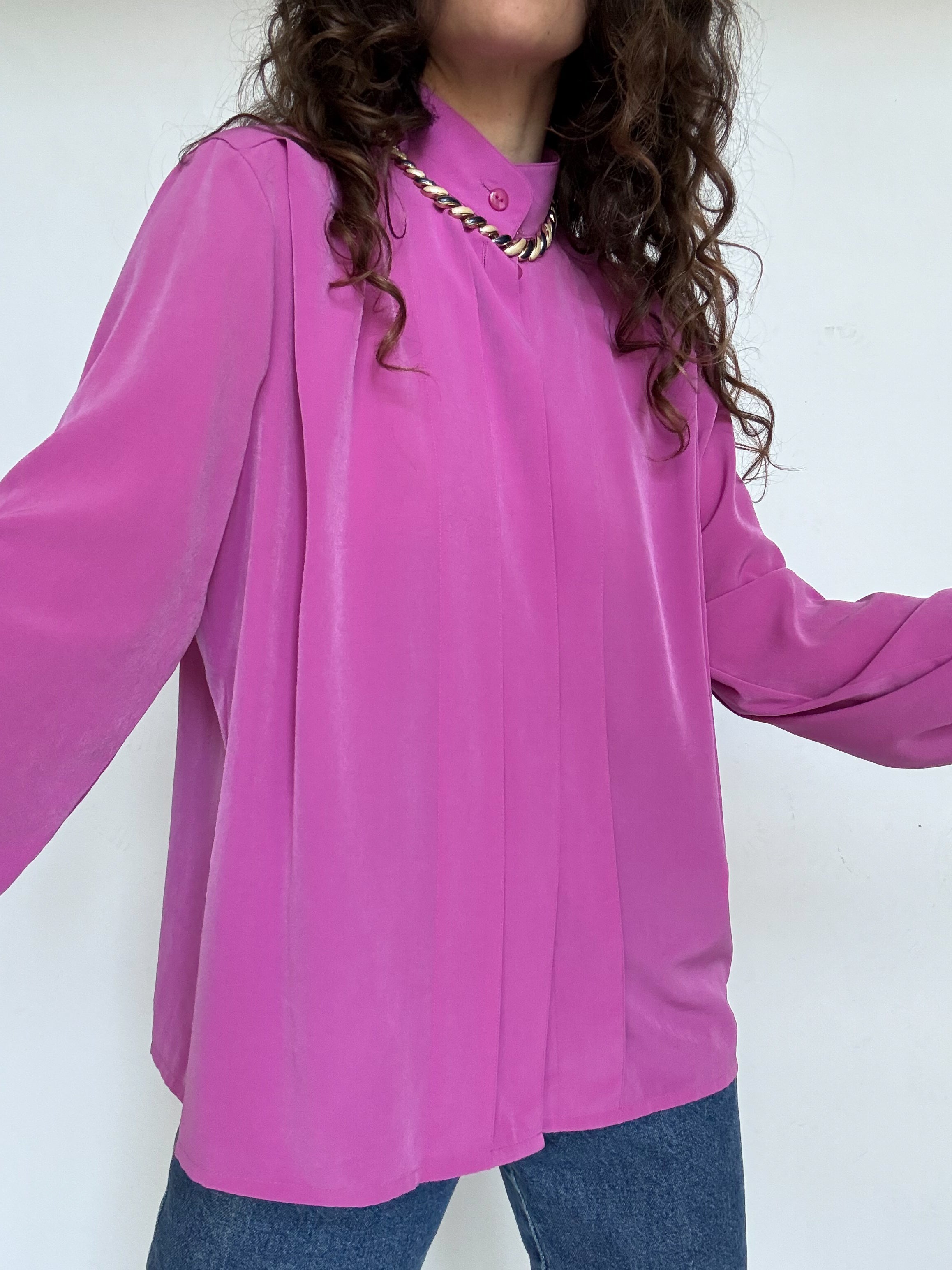 Chosen for its vibrant fuchsia color that instantly catches the eye, this blouse is a beautiful example of bold yet elegant vintage design. The delicate pleated details along the front add structure and refinement, while the fluid fabric creates a graceful movement when worn. A striking and sophisticated piece that effortlessly elevates a simple outfit.