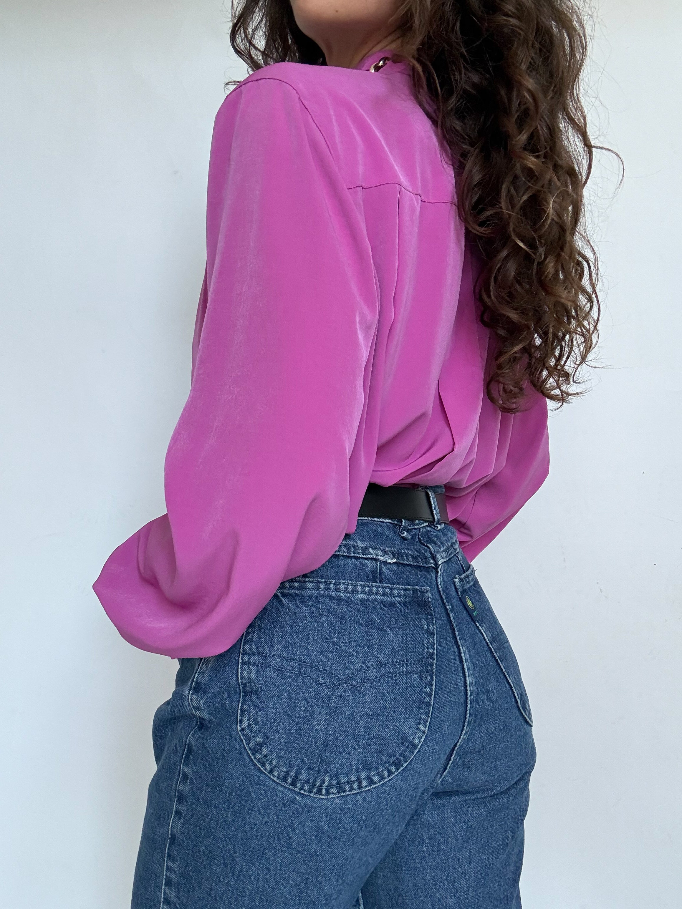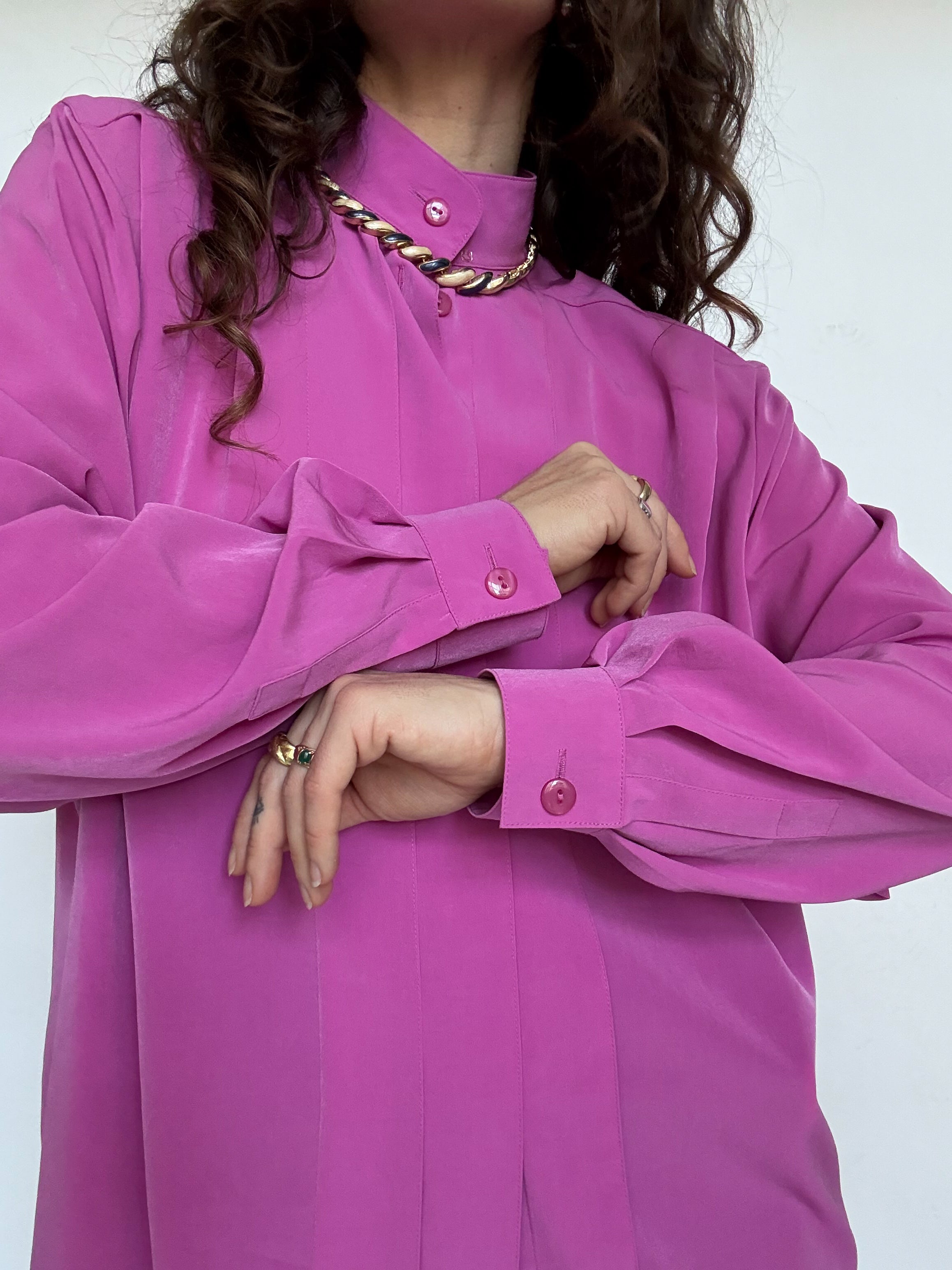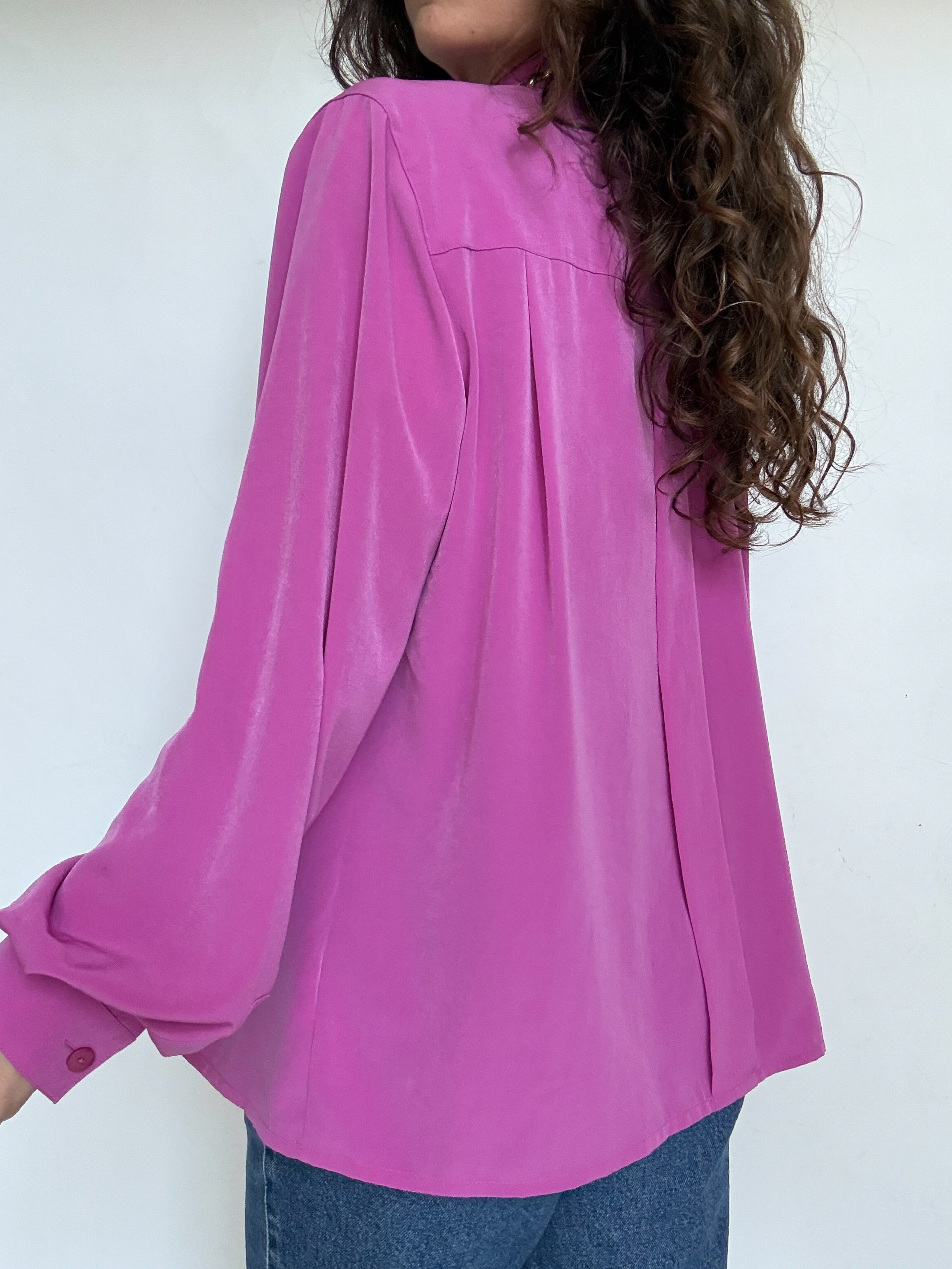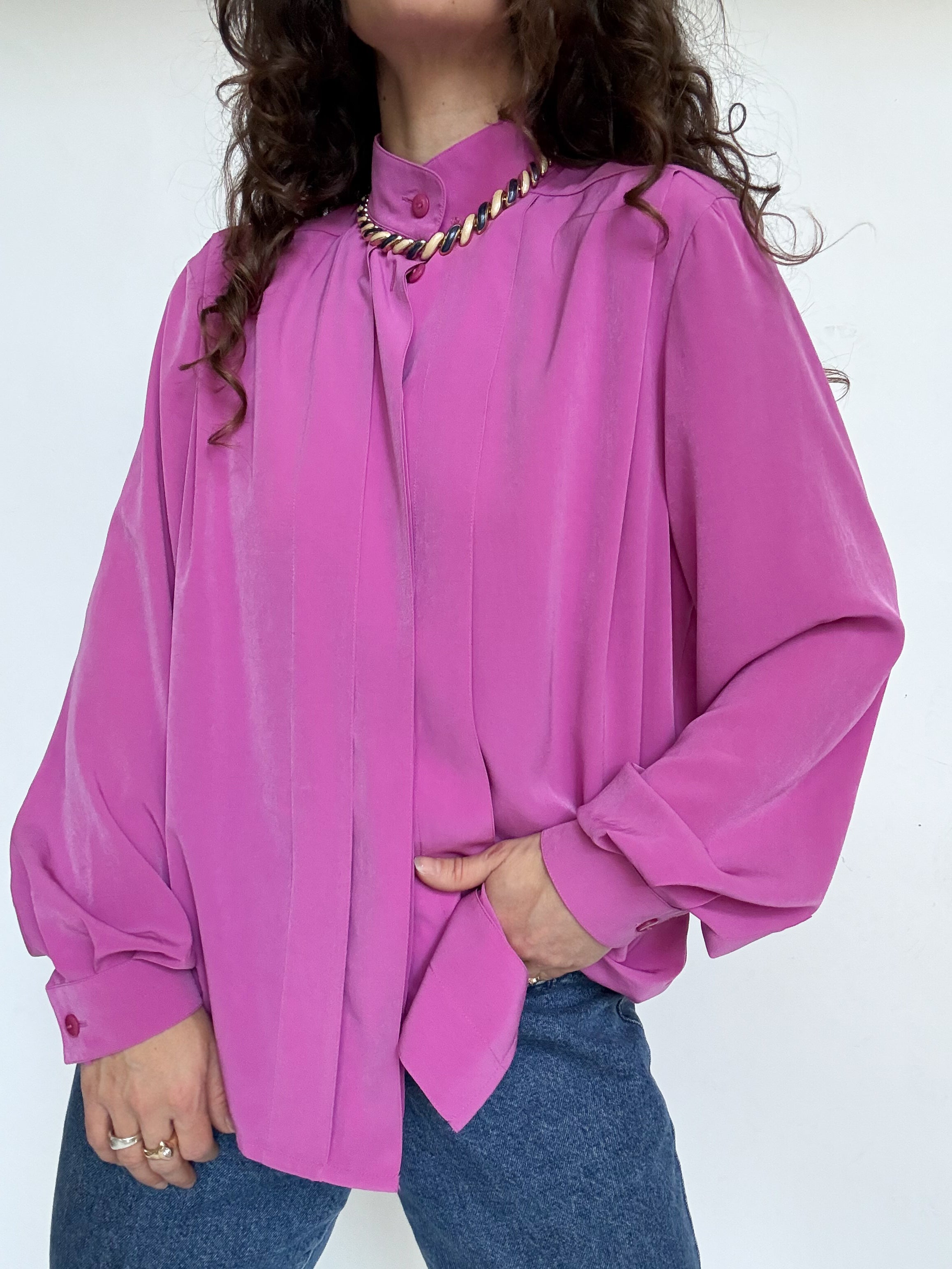 Chosen for its vibrant fuchsia color that instantly catches the eye, this blouse is a beautiful example of bold yet elegant vintage design. The delicate pleated details along the front add structure and refinement, while the fluid fabric creates a graceful movement when worn. A striking and sophisticated piece that effortlessly elevates a simple outfit.