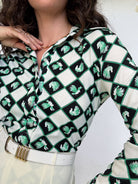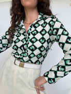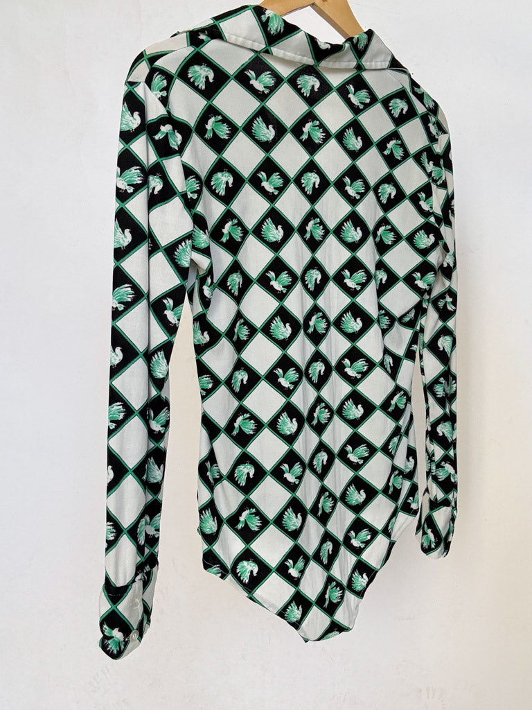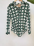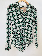 - Special features: Body design, graphic green and white pattern, structured fit, snap closure, long sleeves