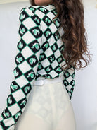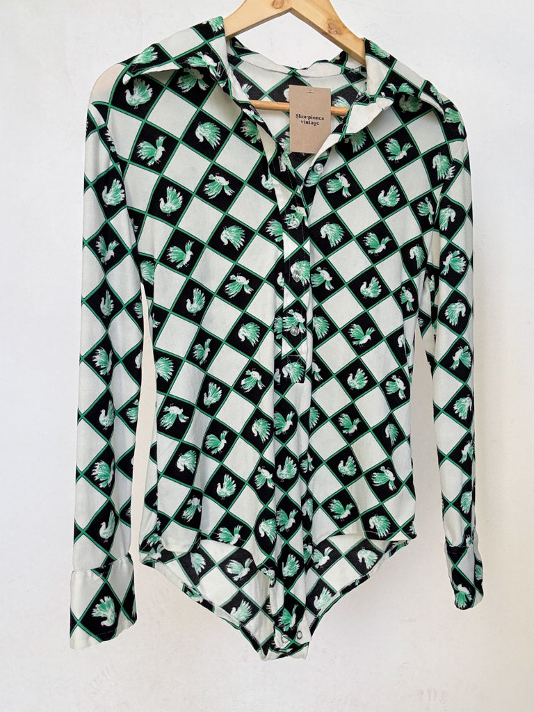 Chosen for its striking graphic pattern that instantly catches the eye and gives the piece a bold, confident identity. The body fit enhances the silhouette while keeping everything perfectly in place, creating a clean and structured look. I selected it for its originality and strong character, a piece that allows you to stand out effortlessly while embracing a distinctive vintage aesthetic.