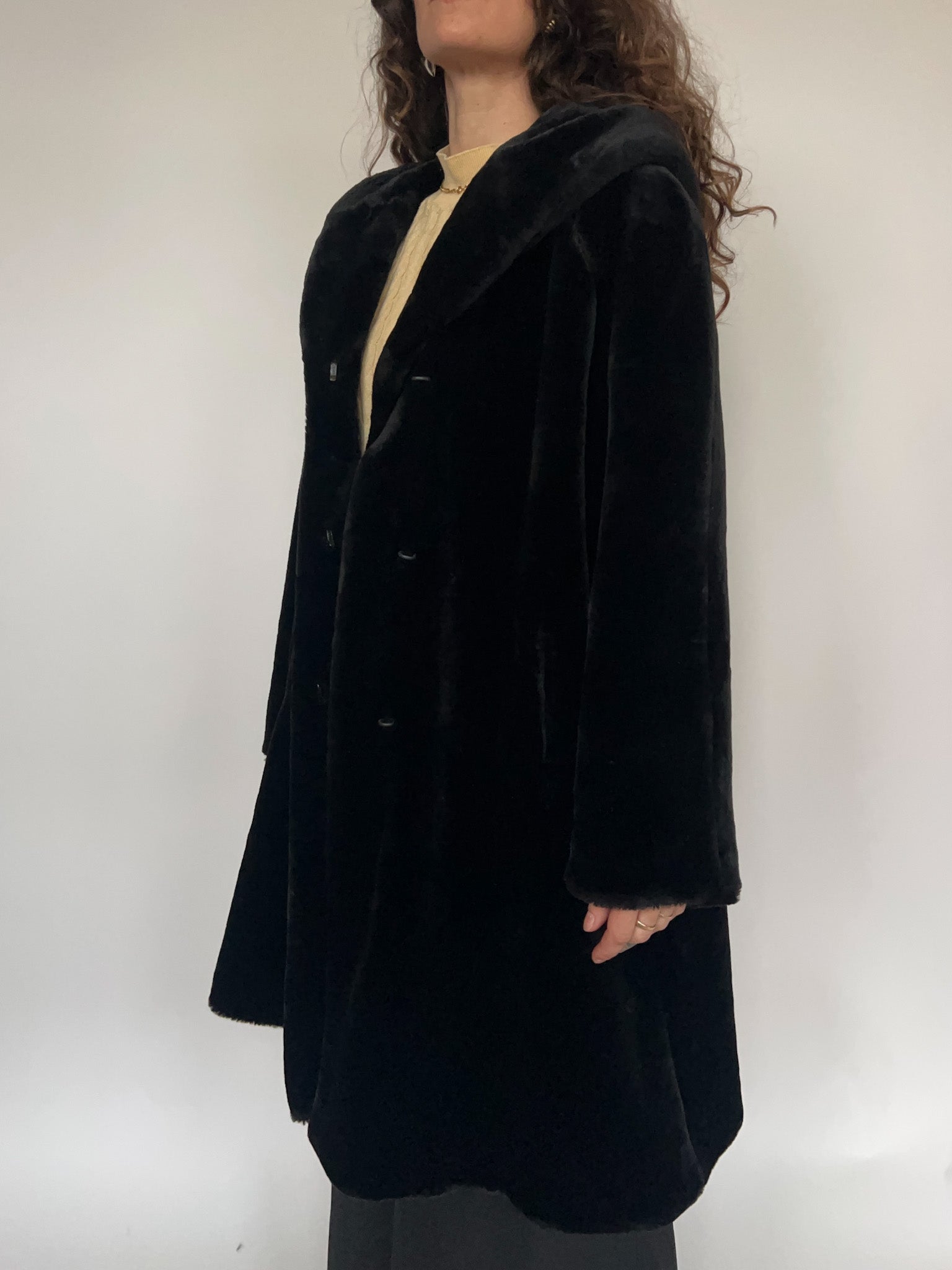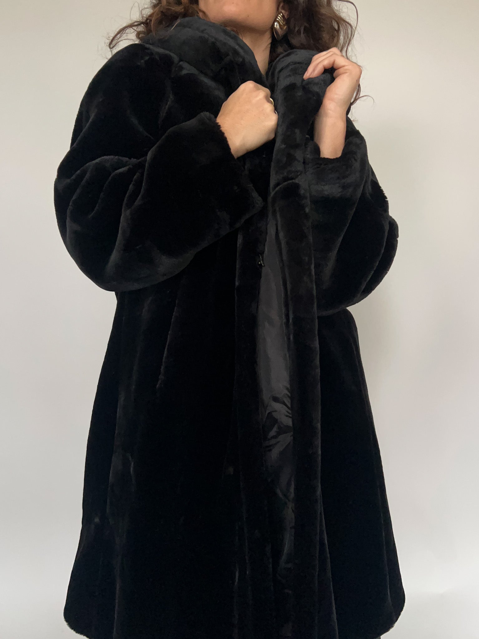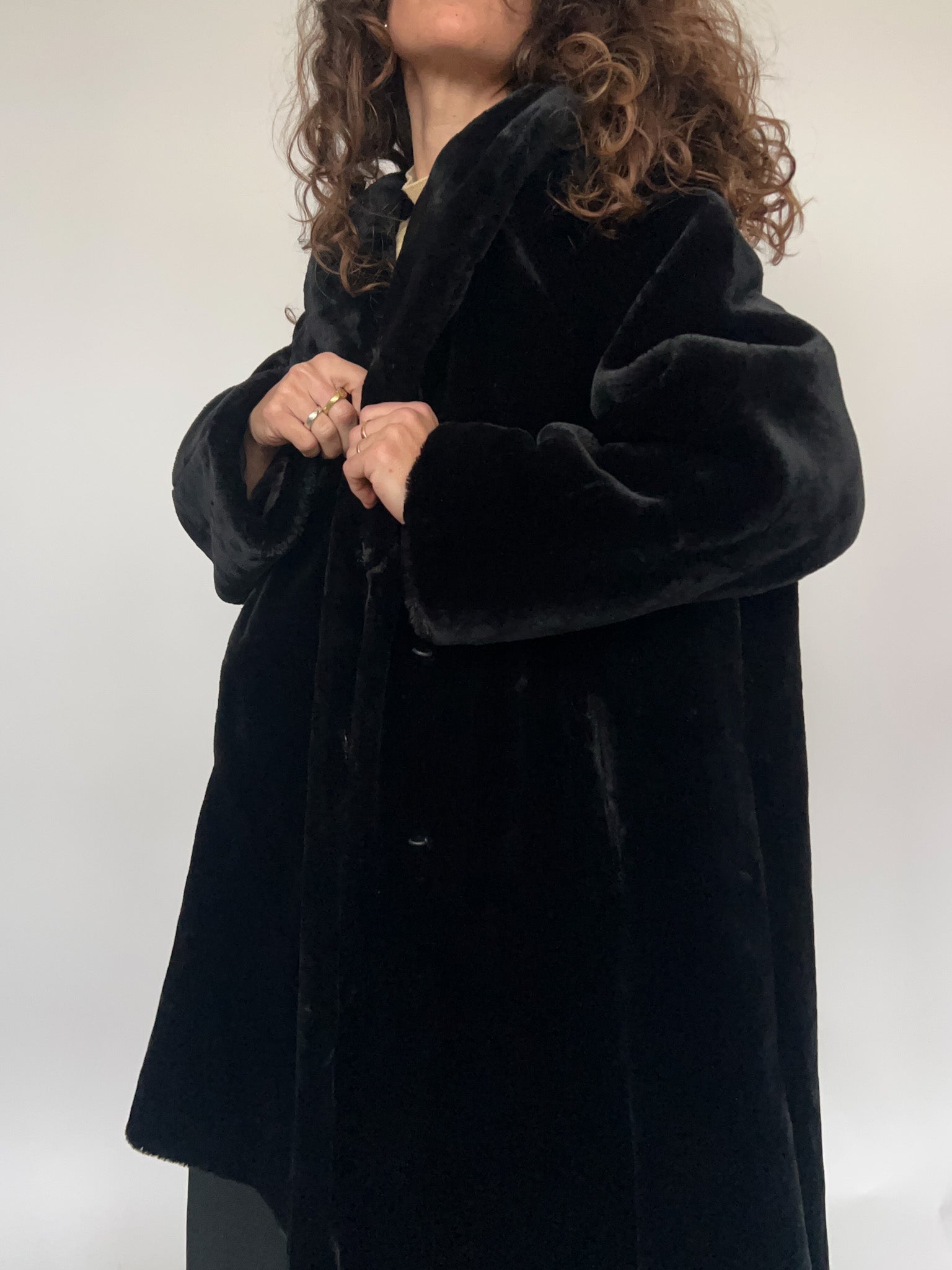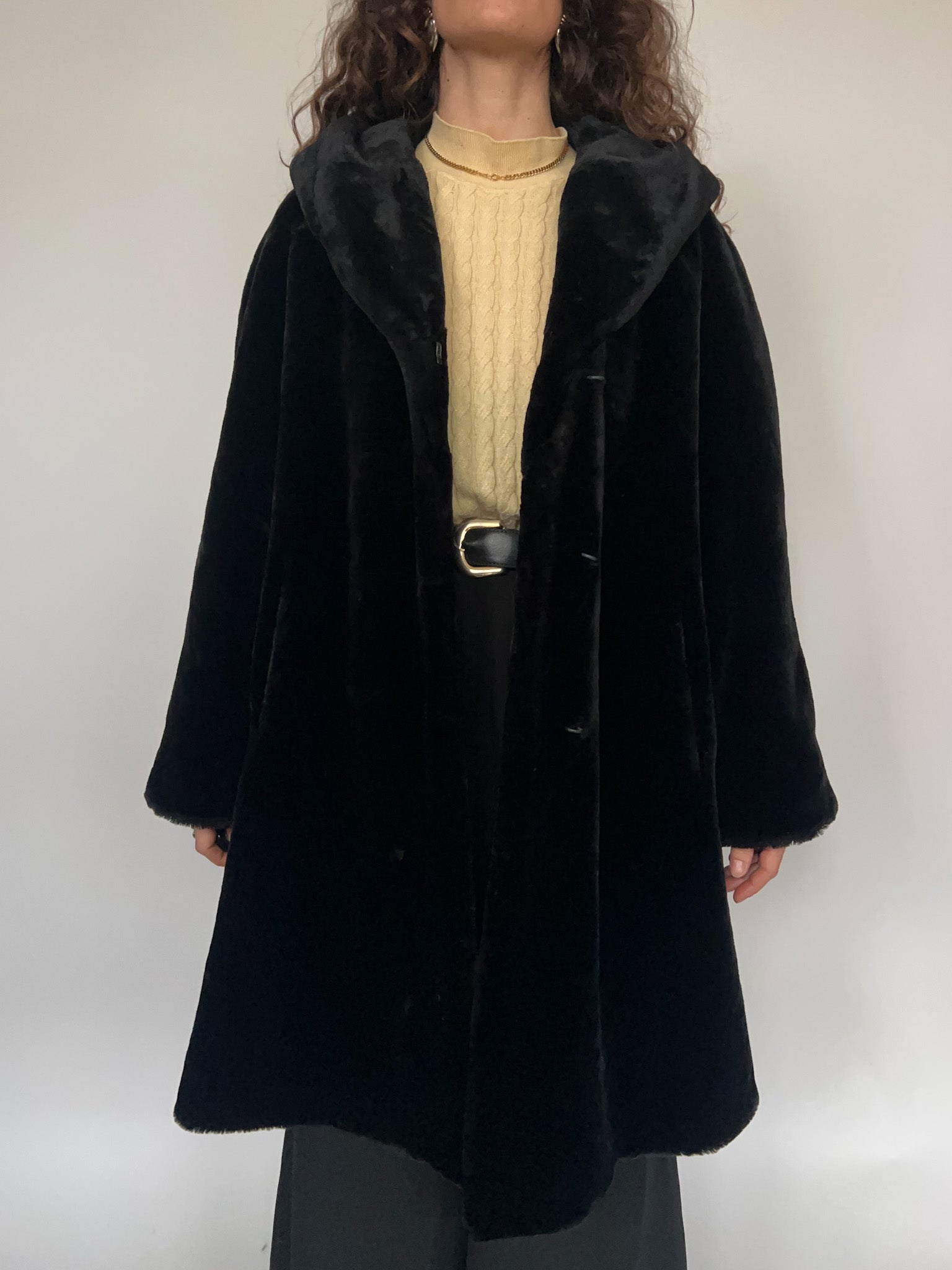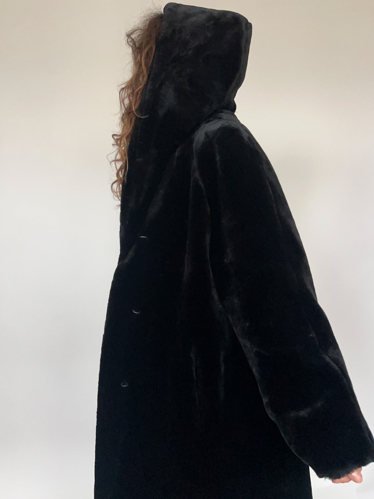 A timeless vintage faux fur coat designed with a clean, elegant silhouette and a softly structured hood that adds both character and comfort. Its deep black tone enhances the richness of the texture, creating a refined presence that feels effortless yet powerful. The straight cut allows the coat to fall beautifully on the body, offering ease of movement while maintaining a strong visual impact.