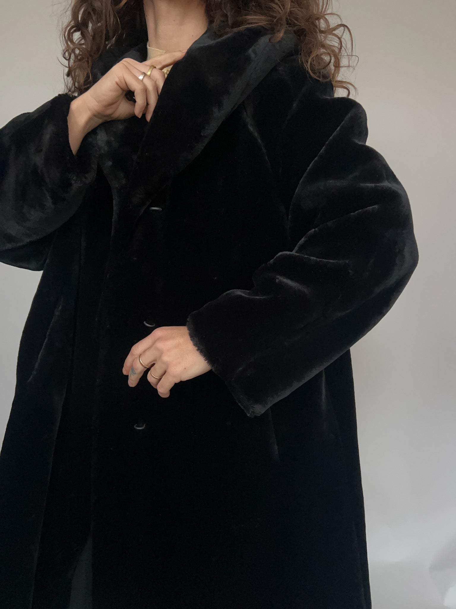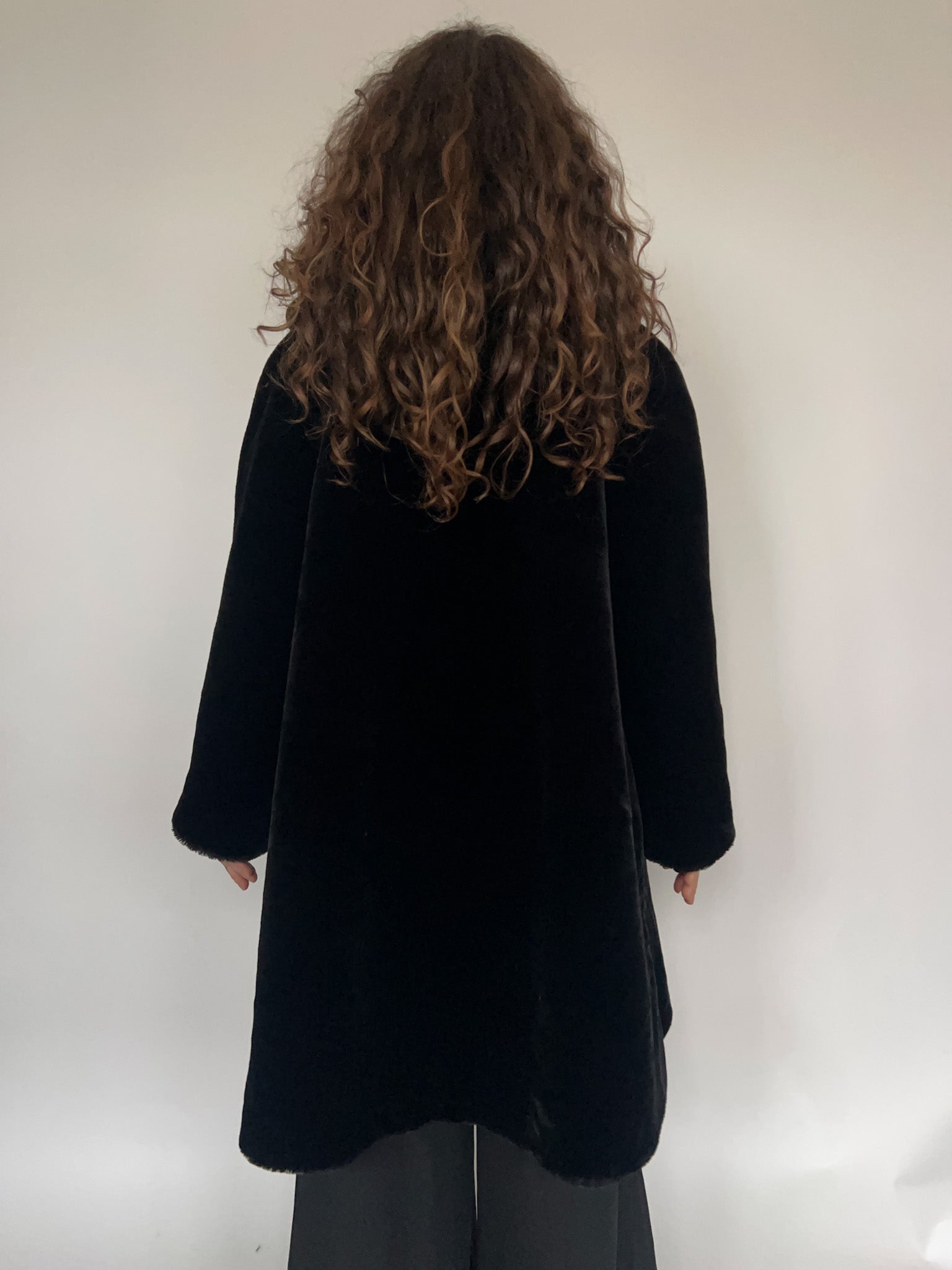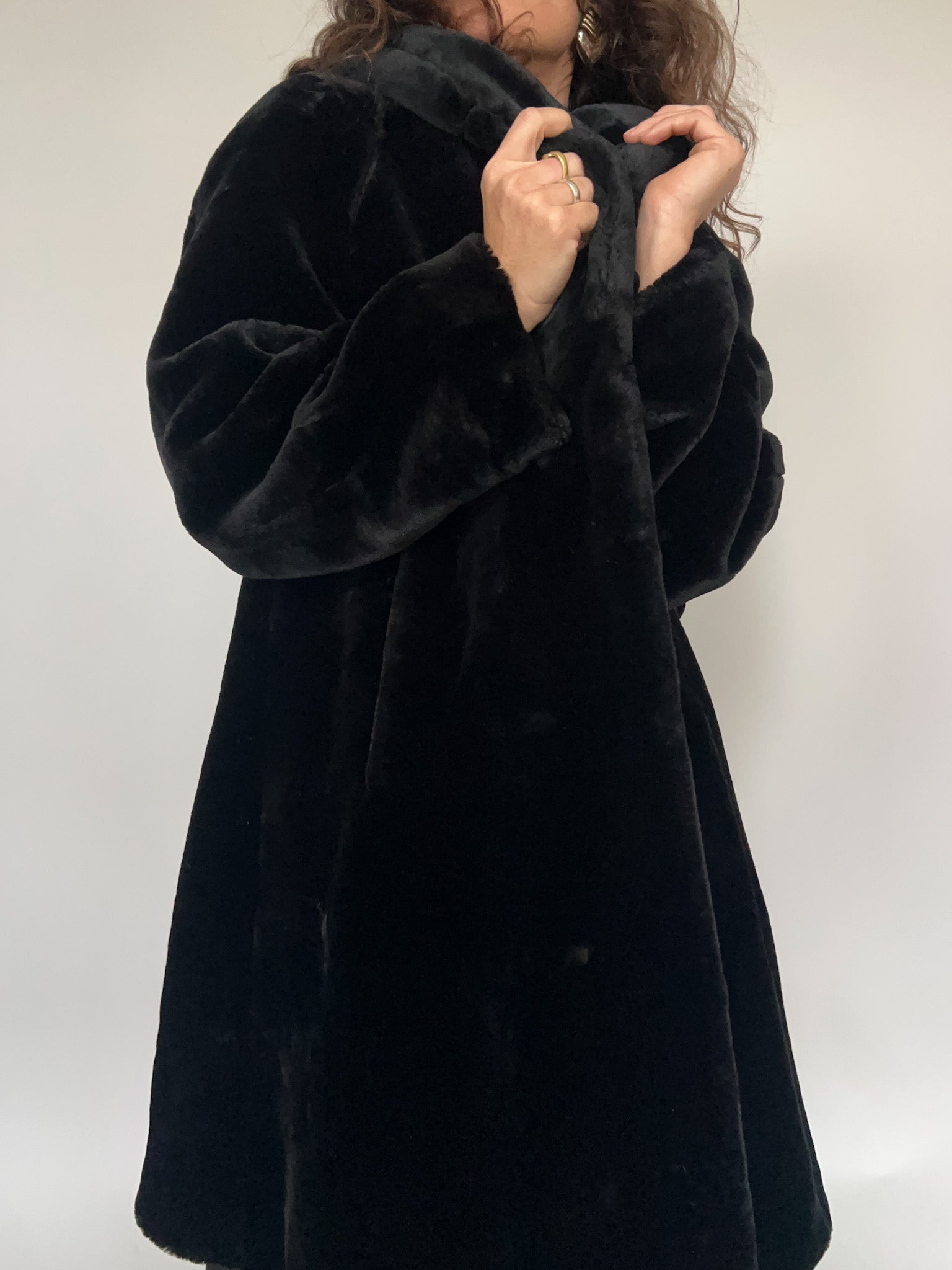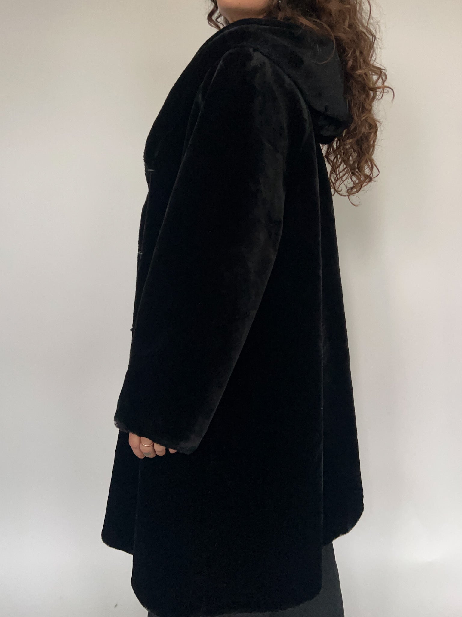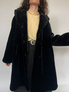 A timeless vintage faux fur coat designed with a clean, elegant silhouette and a softly structured hood that adds both character and comfort. Its deep black tone enhances the richness of the texture, creating a refined presence that feels effortless yet powerful. The straight cut allows the coat to fall beautifully on the body, offering ease of movement while maintaining a strong visual impact.