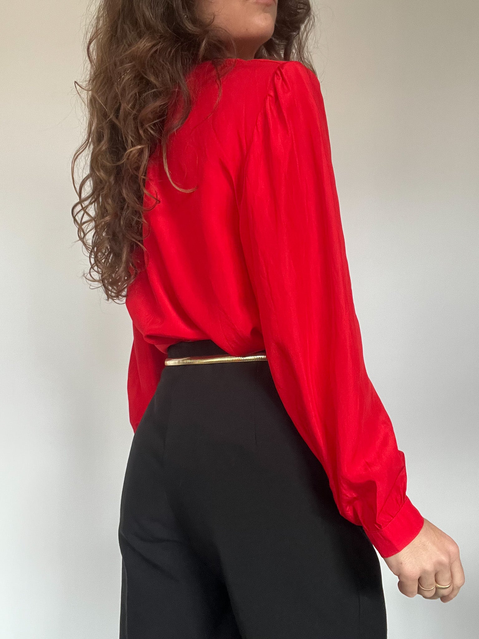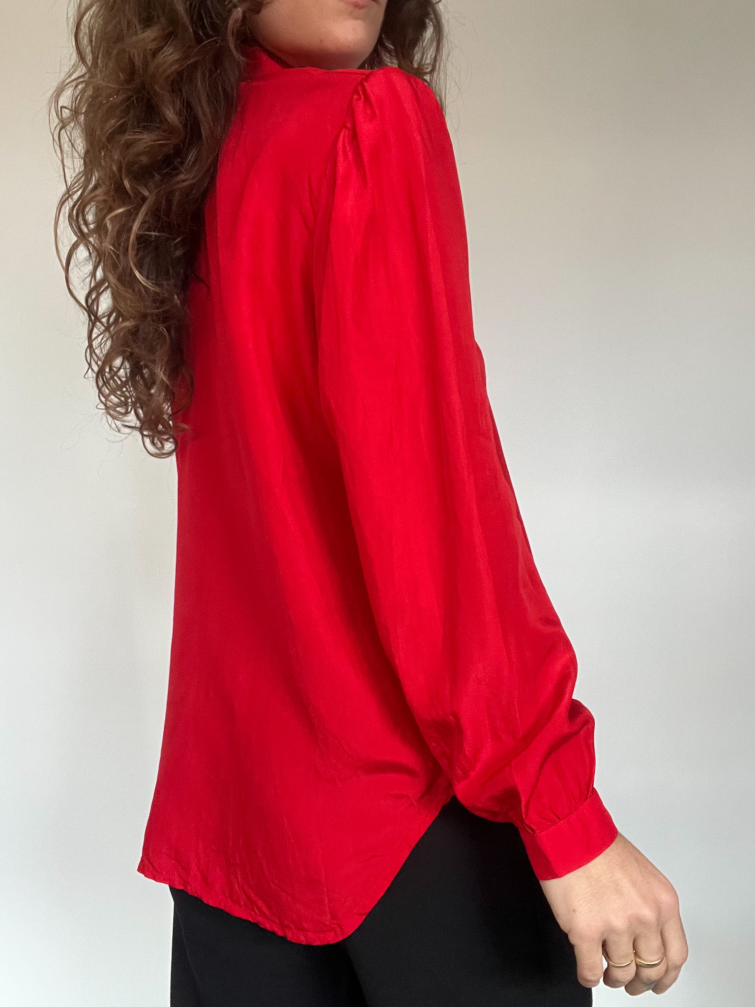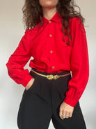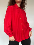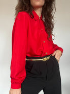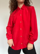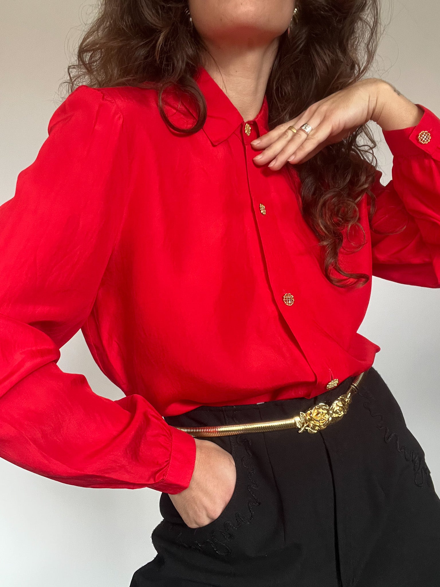 This striking red shirt from the 1990s is defined by its powerful presence and refined details. The vibrant red tone is intense yet elegant, instantly drawing the eye, while the fluid fabric suggests a silk composition that gives the piece a soft, luminous drape. Its classic cut is elevated by the standout red buttons, bold and lightning sharp, adding a subtle yet confident statement to the overall silhouette. Chosen for its strong colour and exceptional button details, this shirt perfectly embodies the Skorpiones Vintage spirit. It is a piece made for women who are not afraid to be seen, balancing femininity with strength and timeless appeal. Worn tucked into tailored trousers or styled more freely, it brings character and confidence to both day and evening looks.