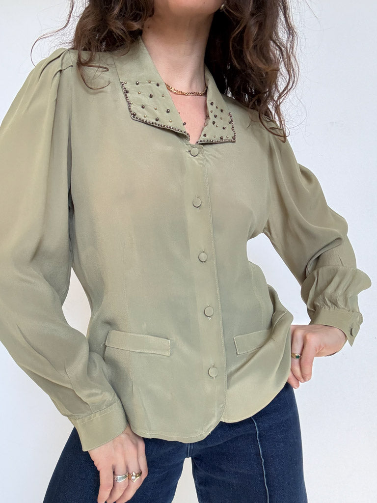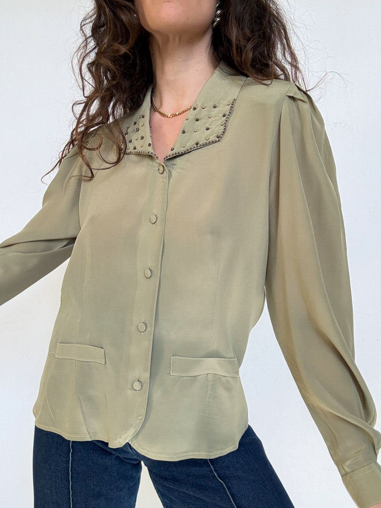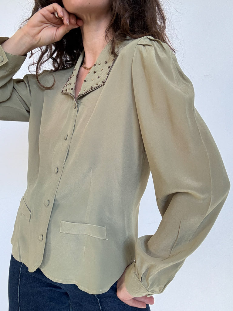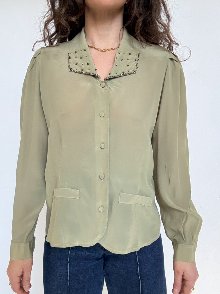 Vintage 90’s Sage Green Silk Embellished Blouse