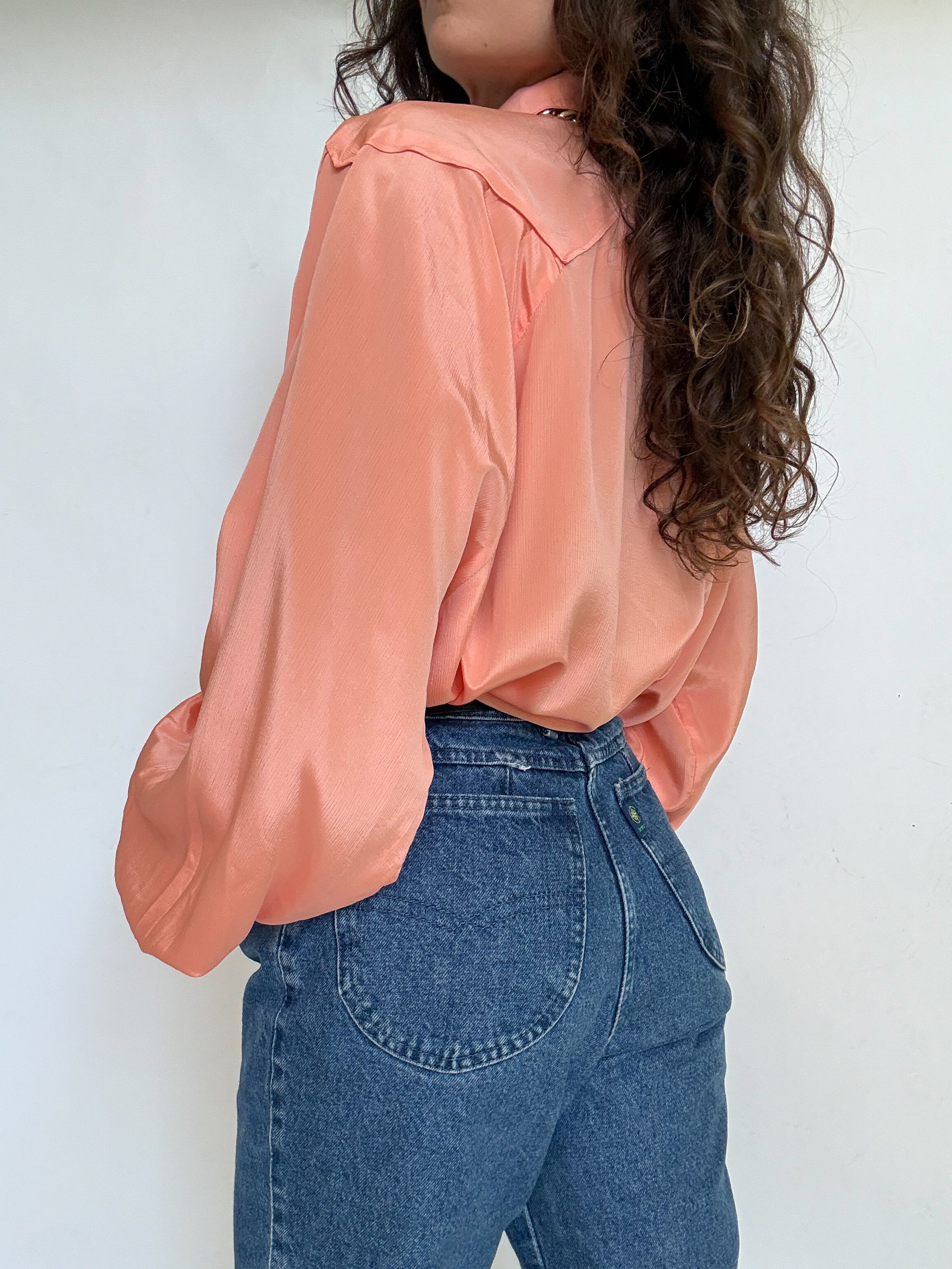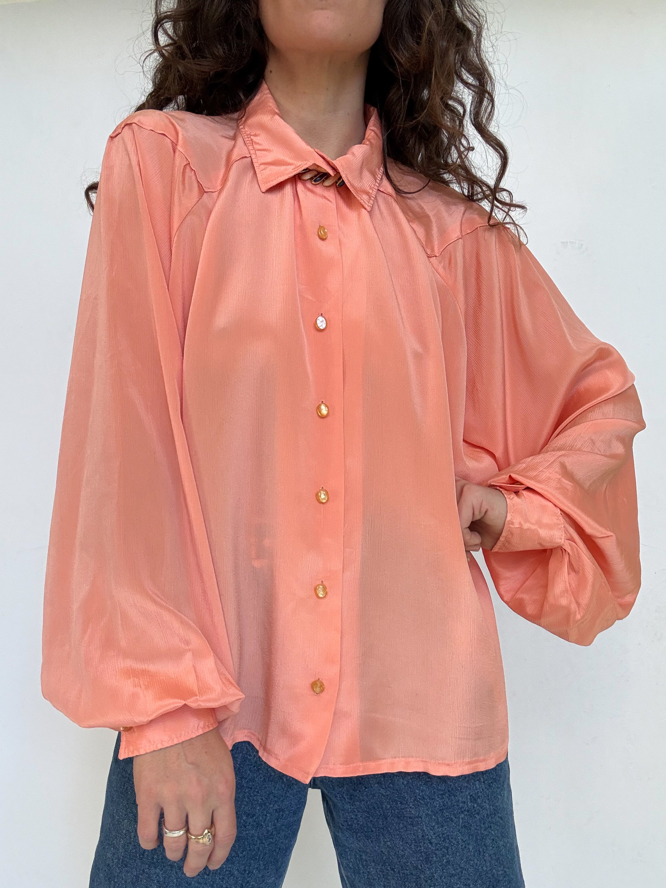 Chosen for its beautiful salmon tone and its softly shimmering satin finish, this blouse captures the effortless elegance of vintage pieces that instantly elevate a look. The fluid fabric and generous sleeves create a graceful silhouette that feels both relaxed and refined. A luminous and feminine piece that brings warmth and character to any outfit while remaining incredibly easy to style.