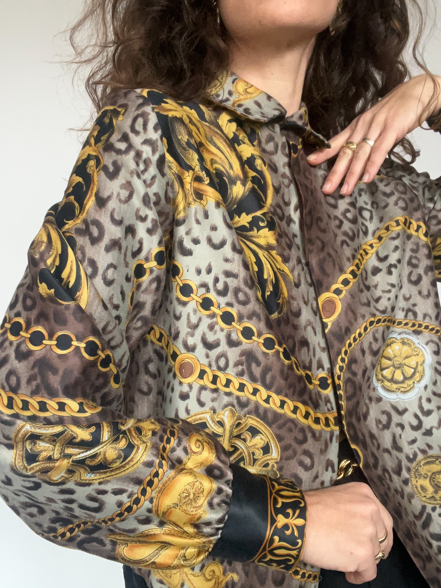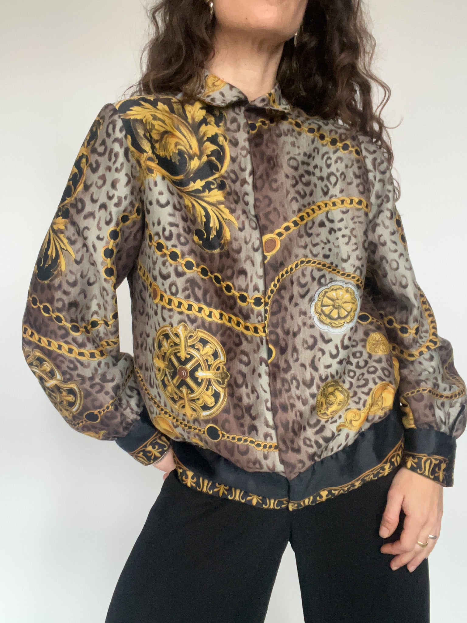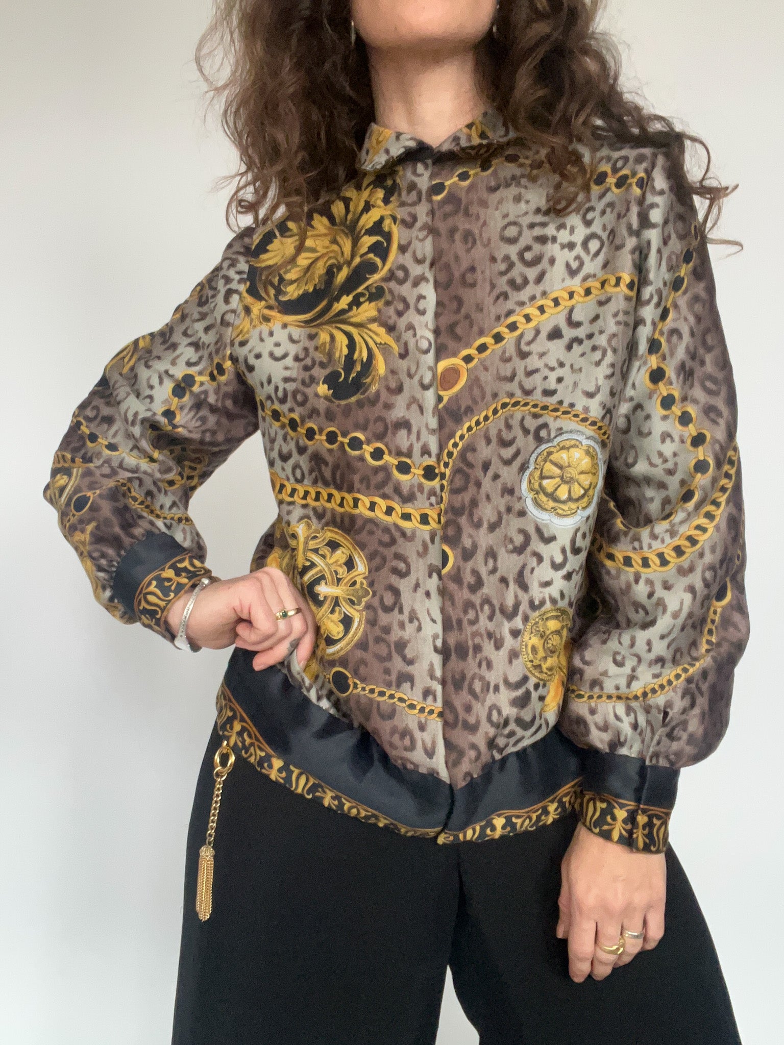 A bold and expressive vintage blouse that perfectly captures the daring elegance of the 90’s. Crafted in a sheer fabric, this piece plays with contrast through an intricate mix of chain motifs, ornamental medallions, and subtle leopard print layered on a soft neutral base. The black and gold accents ground the look, giving it a strong yet refined presence.