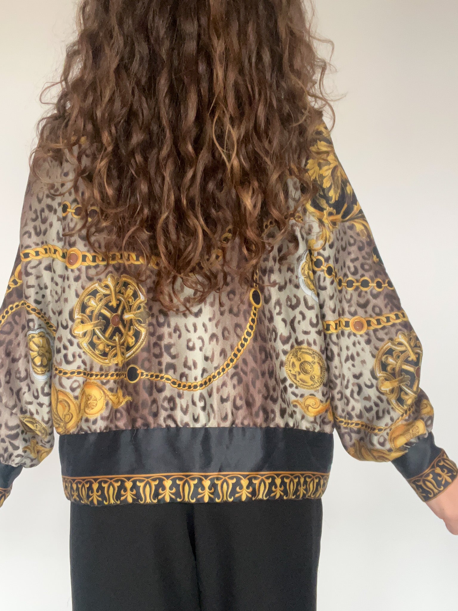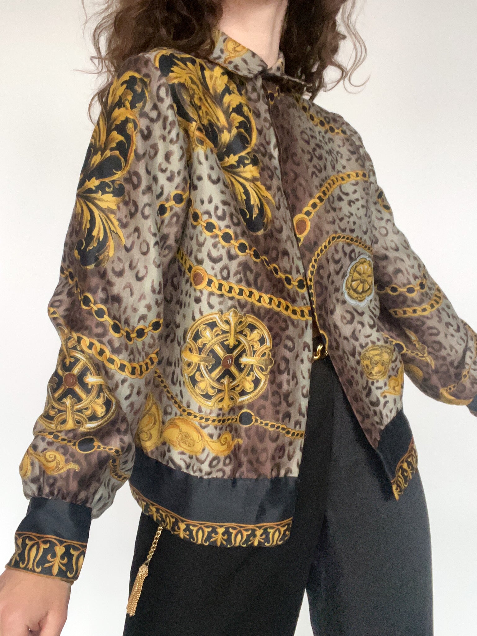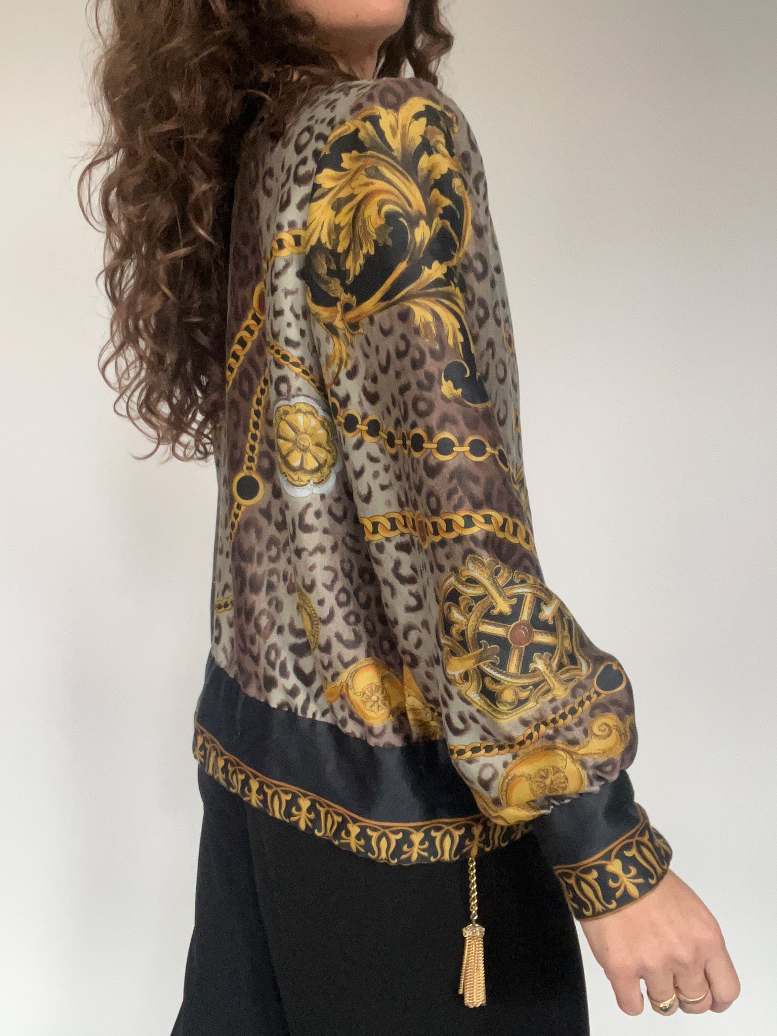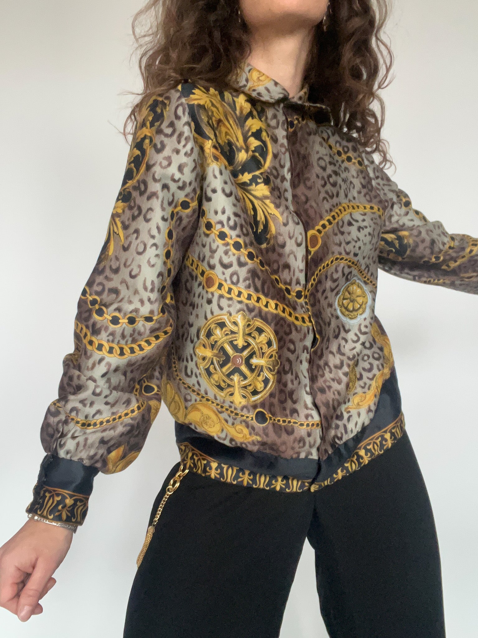 A bold and expressive vintage blouse that perfectly captures the daring elegance of the 90’s. Crafted in a sheer fabric, this piece plays with contrast through an intricate mix of chain motifs, ornamental medallions, and subtle leopard print layered on a soft neutral base. The black and gold accents ground the look, giving it a strong yet refined presence.