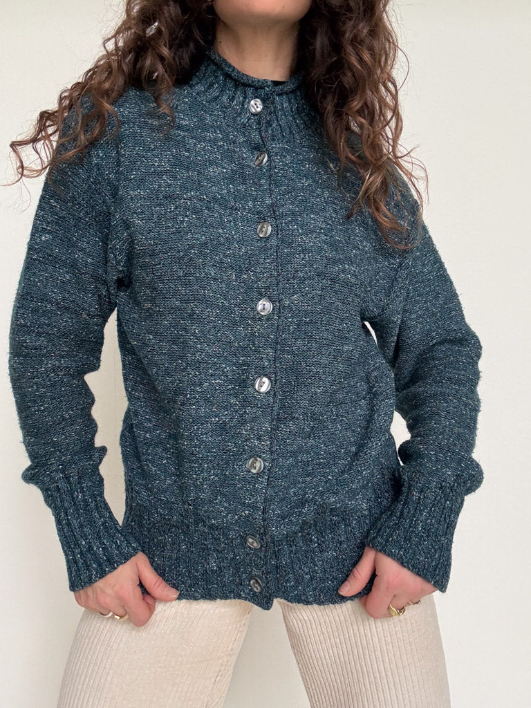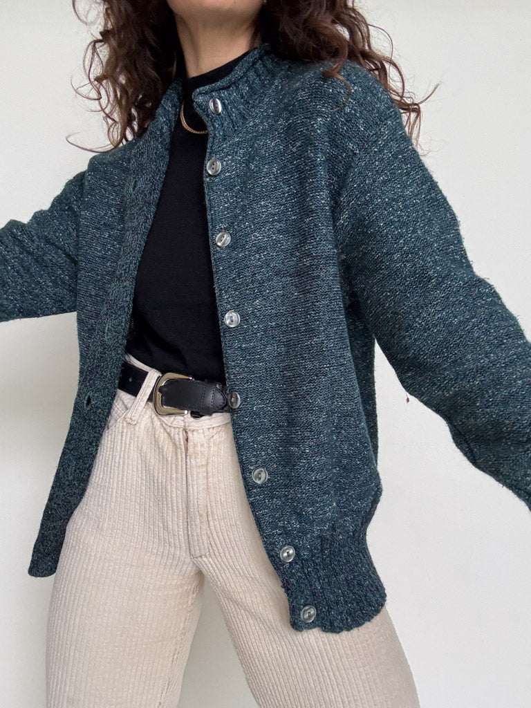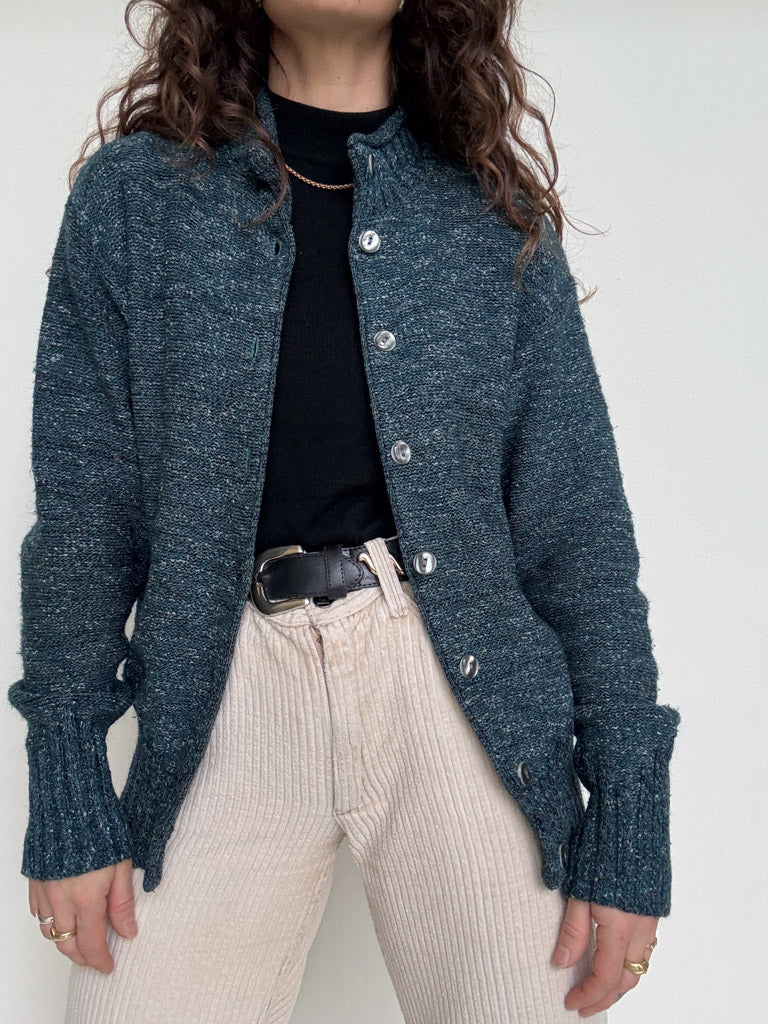 Chosen for its rich teal shade enhanced with subtle multicolored flecks, this cardigan stands out through its depth and texture. The wool composition gives it structure while remaining comfortable, and the slightly tailored cut makes it beautifully flattering whether worn open or fully buttoned. The silver tone buttons add a refined finish, turning this everyday knit into a quietly distinctive piece.