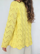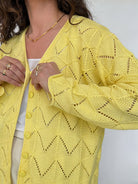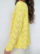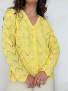 Chosen for its vibrant yellow shade that instantly brings light into any outfit. The openwork knit creates texture and movement, giving the piece a delicate yet expressive character. It is the kind of cardigan that feels both joyful and effortless, perfect to layer while adding a strong touch of personality.