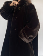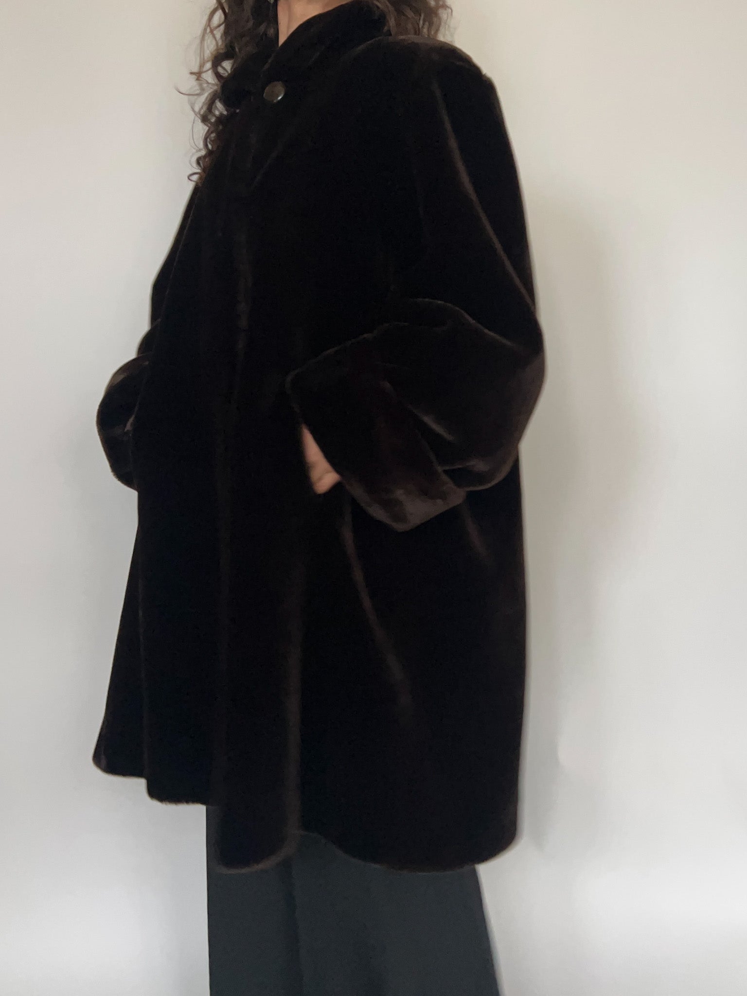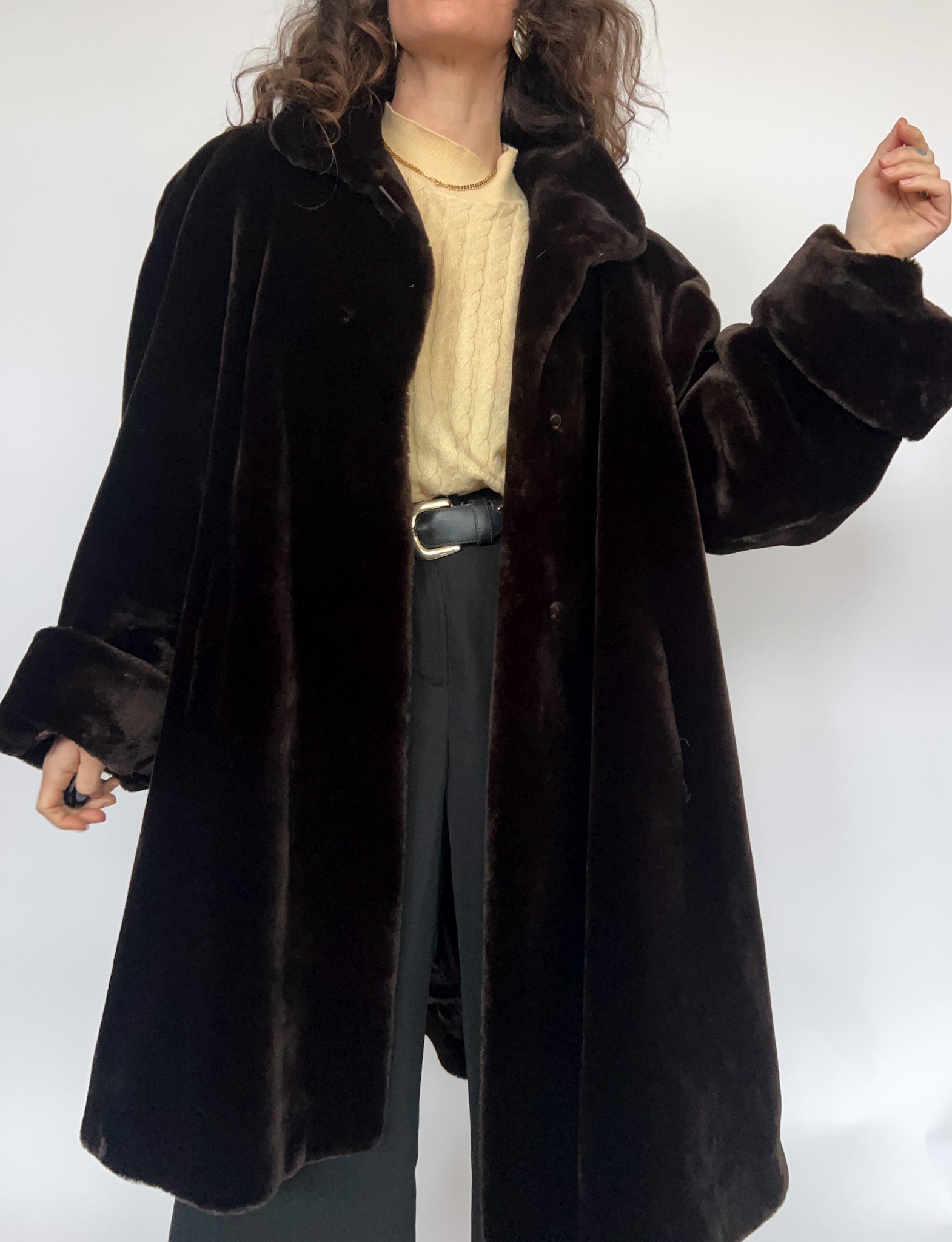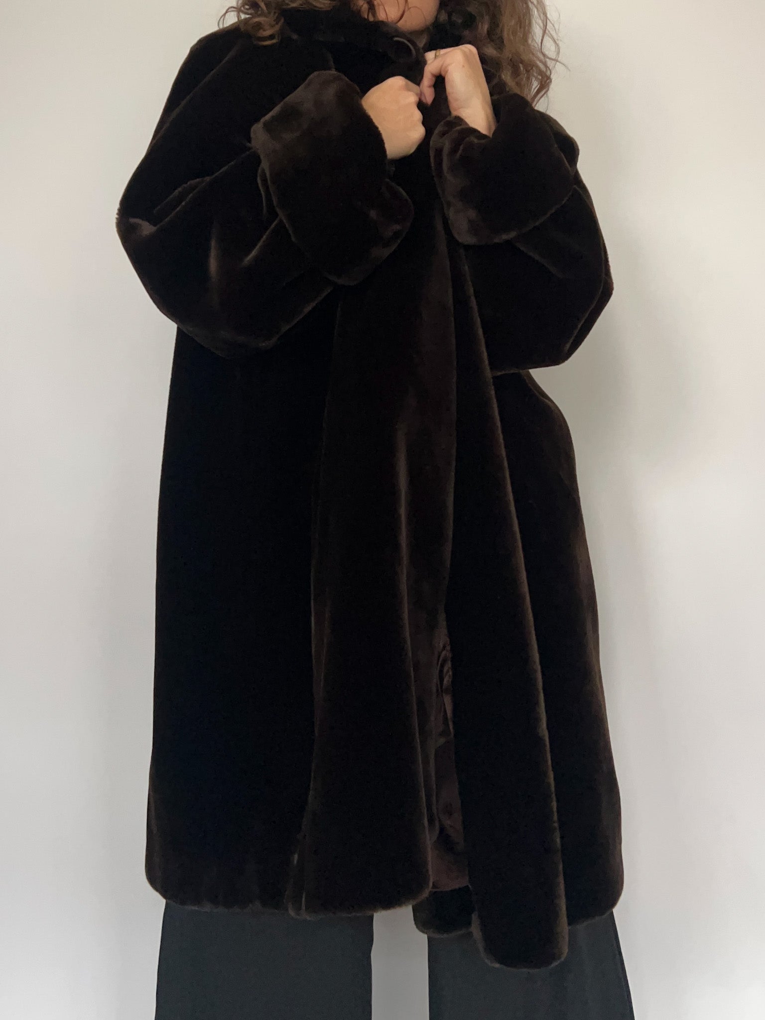 A striking vintage faux fur coat selected for its deep dark brown shade and its generous, enveloping silhouette. The texture is rich and plush, creating that effortless statement look that feels both bold and refined. Its long cut and softly rounded shoulders give it a strong presence, while the clean lines keep it timeless and elegant. This piece fully embodies the Skorpiones Vintage spirit: powerful, confident, and designed for women who want to stand out without compromise. Easy to style over tailored trousers, denim, or evening looks, it brings warmth, attitude, and unmistakable character to any wardrobe.