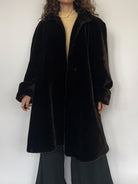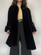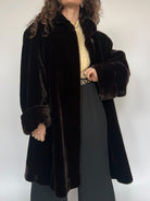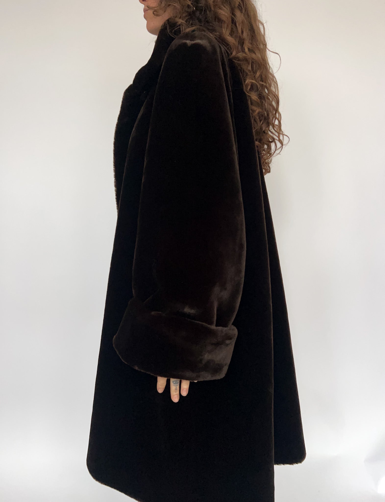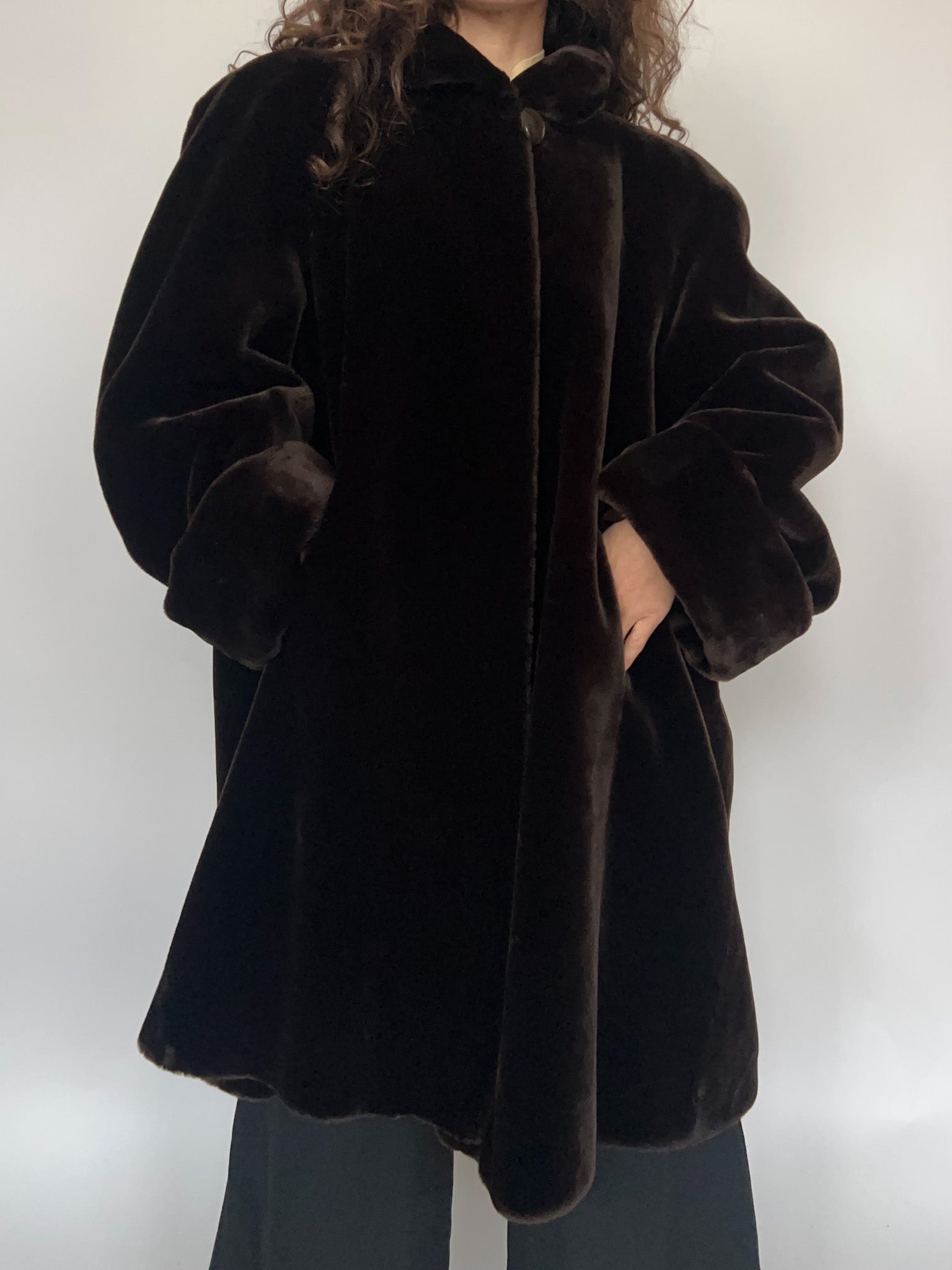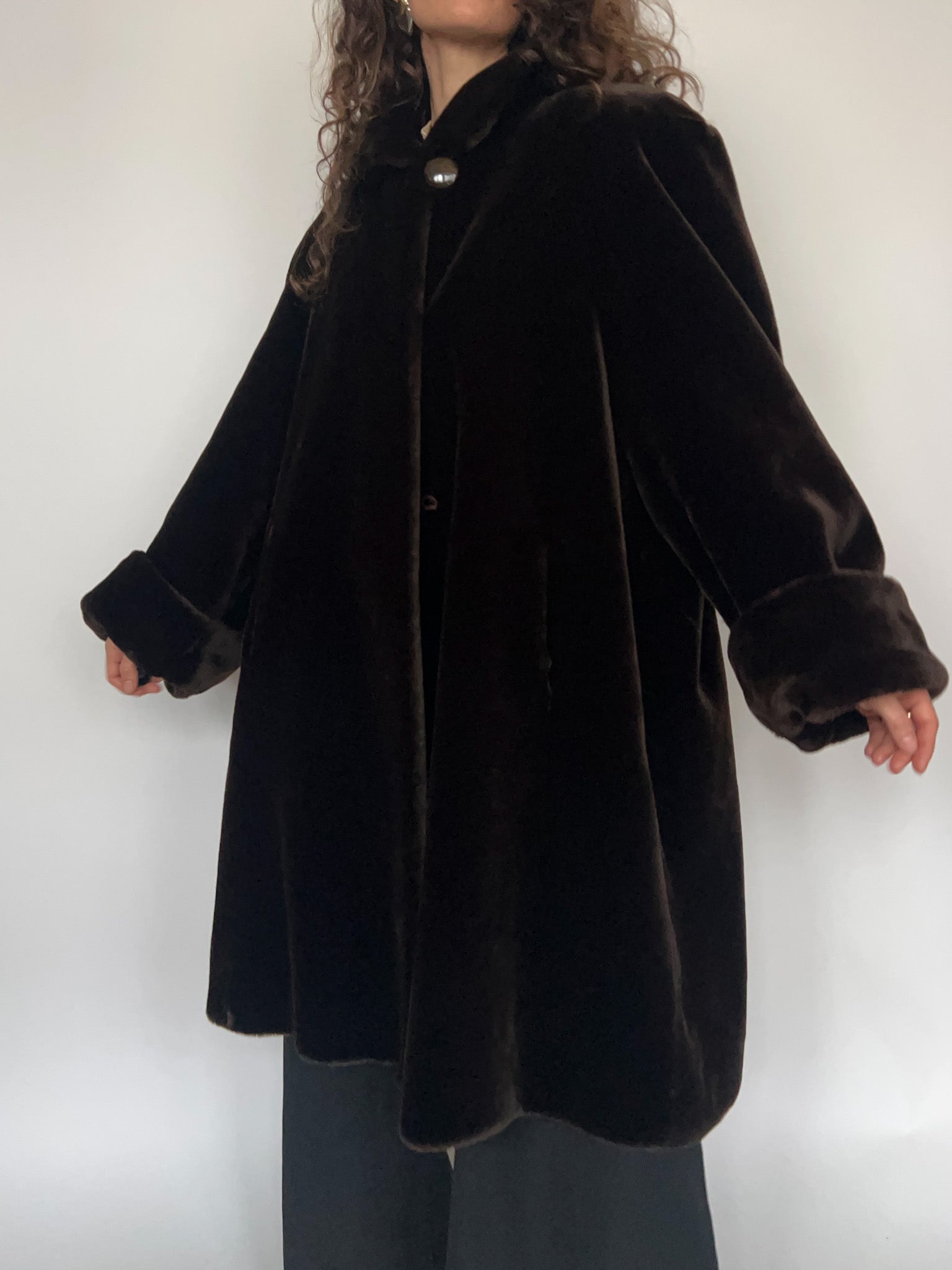 A striking vintage faux fur coat selected for its deep dark brown shade and its generous, enveloping silhouette. The texture is rich and plush, creating that effortless statement look that feels both bold and refined. Its long cut and softly rounded shoulders give it a strong presence, while the clean lines keep it timeless and elegant. This piece fully embodies the Skorpiones Vintage spirit: powerful, confident, and designed for women who want to stand out without compromise. Easy to style over tailored trousers, denim, or evening looks, it brings warmth, attitude, and unmistakable character to any wardrobe.