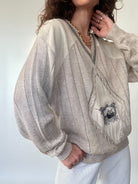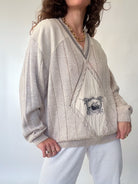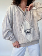 A beautifully crafted 80’s Italian knit, selected for its exceptional mix of textures and its soft, breathable feel. This sweater blends linen, viscose, and acrylic — giving it that fluid drape and lightweight comfort that makes it incredibly pleasant to wear. Its unique design features contrasting knit panels, delicate openwork details, and a central embroidered motif that gives the piece a truly distinctive character. Relaxed yet elegant, it embodies the Skorpiones Vintage spirit: expressive, timeless, and crafted with intention. An effortless statement piece you’ll reach for again and again.