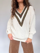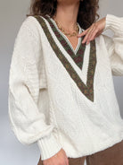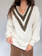 A true 80’s gem blending British countryside charm and vintage craftsmanship. This cream cable knit sweater features a beautifully detailed V-neck embroidered with forest green and burgundy accents, creating a striking contrast that draws the eye upward. Made from a soft wool-acrylic blend, it offers both warmth and comfort with a relaxed, slightly oversized fit. A perfect piece for layering on cooler days — effortlessly cozy yet undeniably elegant.