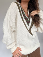 - Special features: Cable knit texture, embroidered V-neck detail, cream base with green and burgundy accents, ribbed cuffs and hem