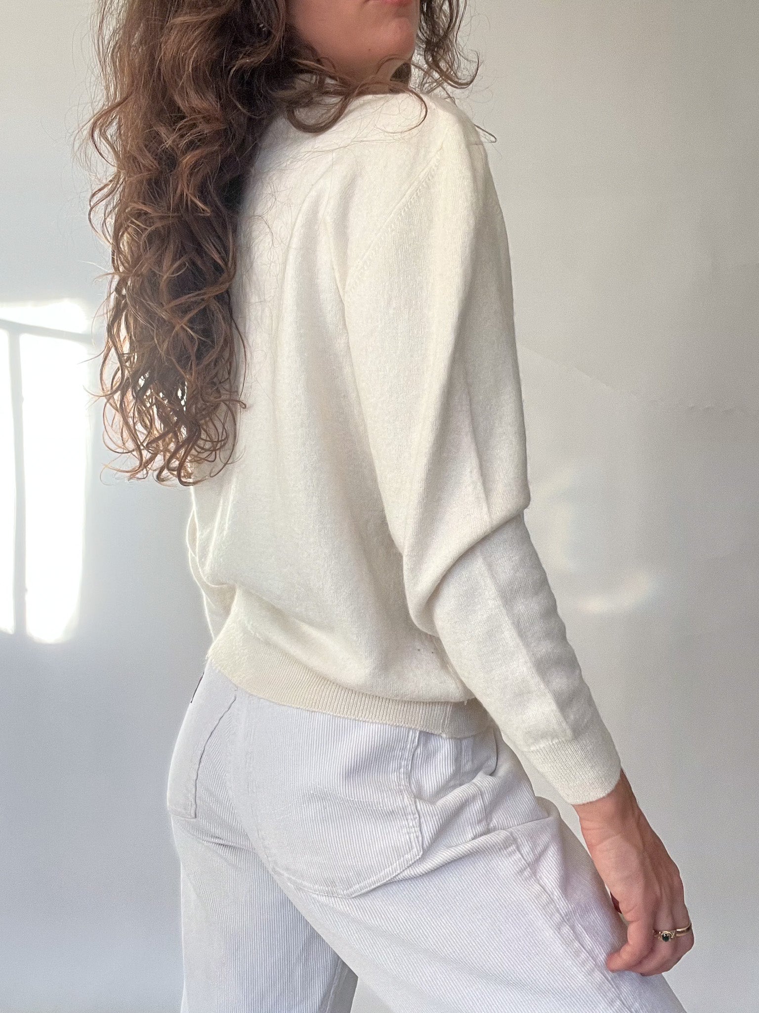 An exceptionally soft 80’s knit chosen for its luxurious feel and its sublime cream shade — one of those rare tones that instantly elevates an outfit with quiet elegance.