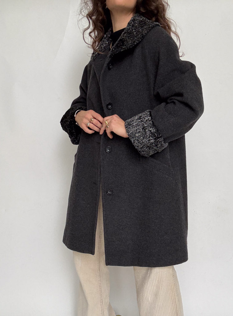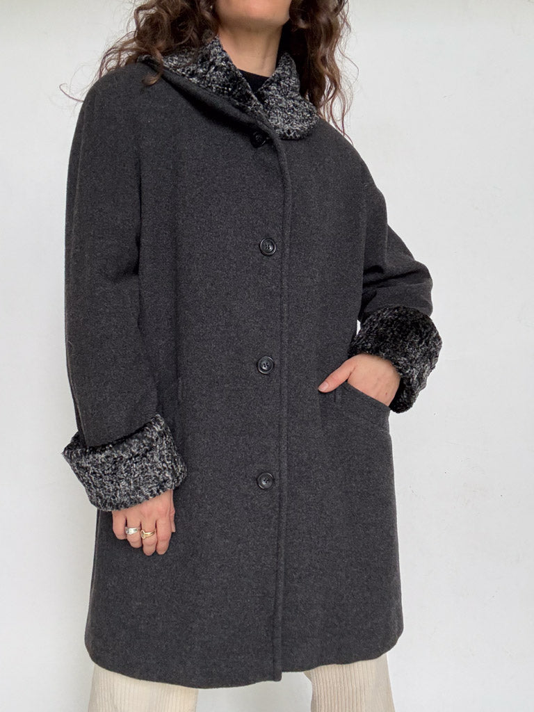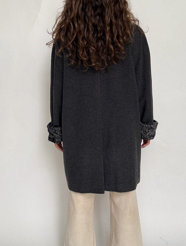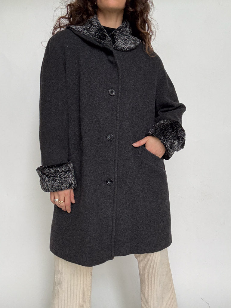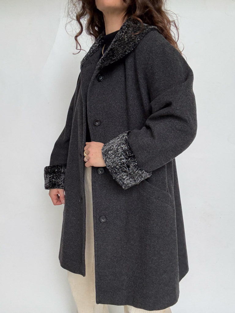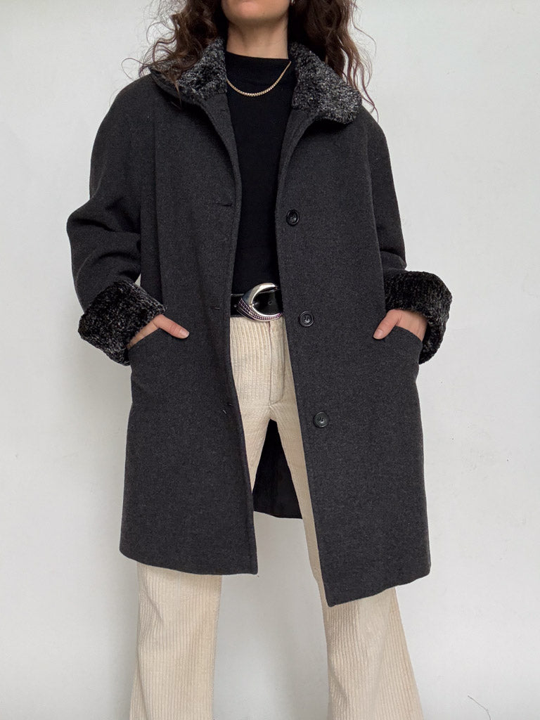 Chosen for its beautiful deep charcoal grey tone and its cinematic faux fur details at the collar and cuffs in black, silver and grey reflections. A timeless silhouette elevated by subtle texture contrasts. A coat that feels refined yet effortless.