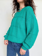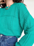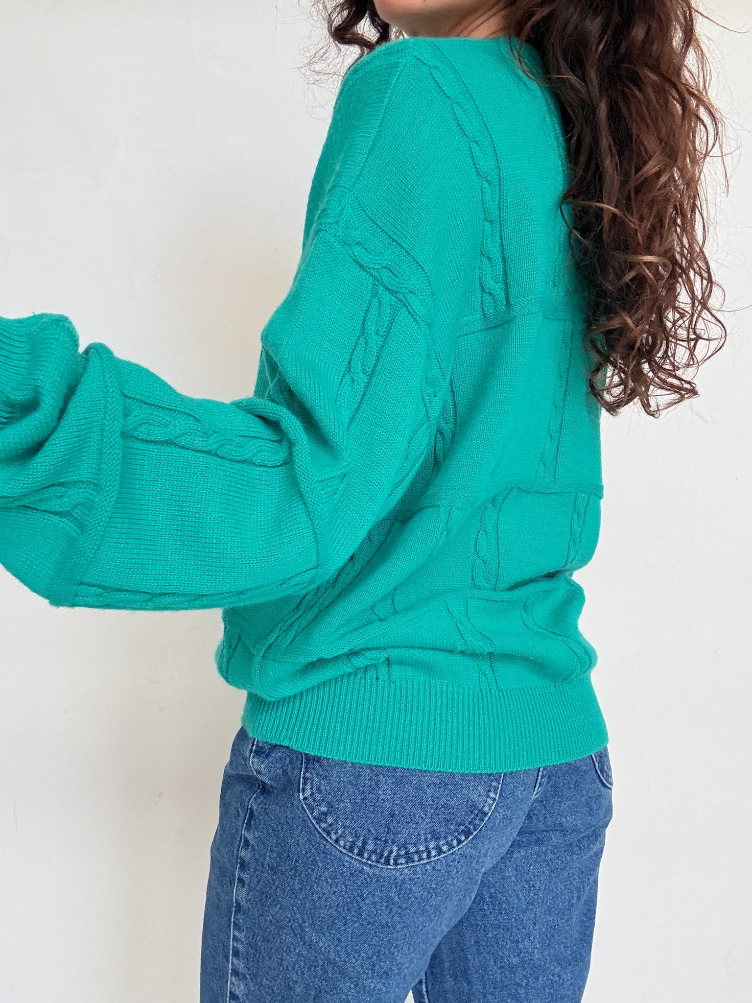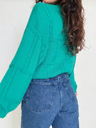 - Special features: Puffed sleeves, rich vibrant green tone, softly structured knit, ribbed cuffs