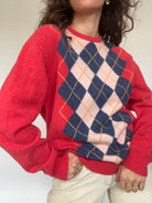 A striking Italian knit with undeniable 80’s flair. This red argyle sweater brings together bold color blocking and timeless pattern work in shades of navy, blush pink, and mustard. Its soft wool texture and perfectly relaxed cut make it both comfortable and refined — a piece that embodies Skorpiones Vintage’s love for statement classics with enduring elegance.