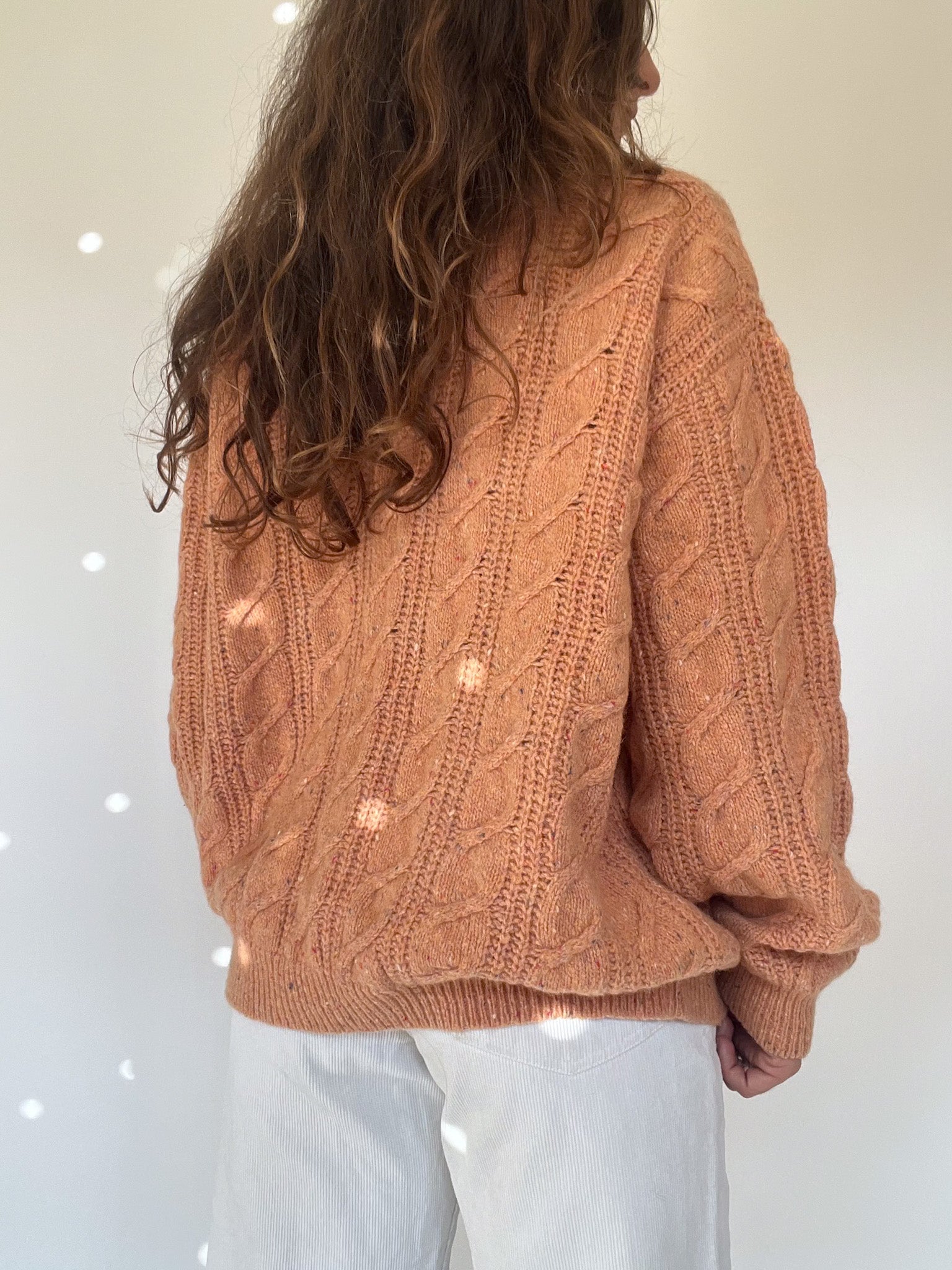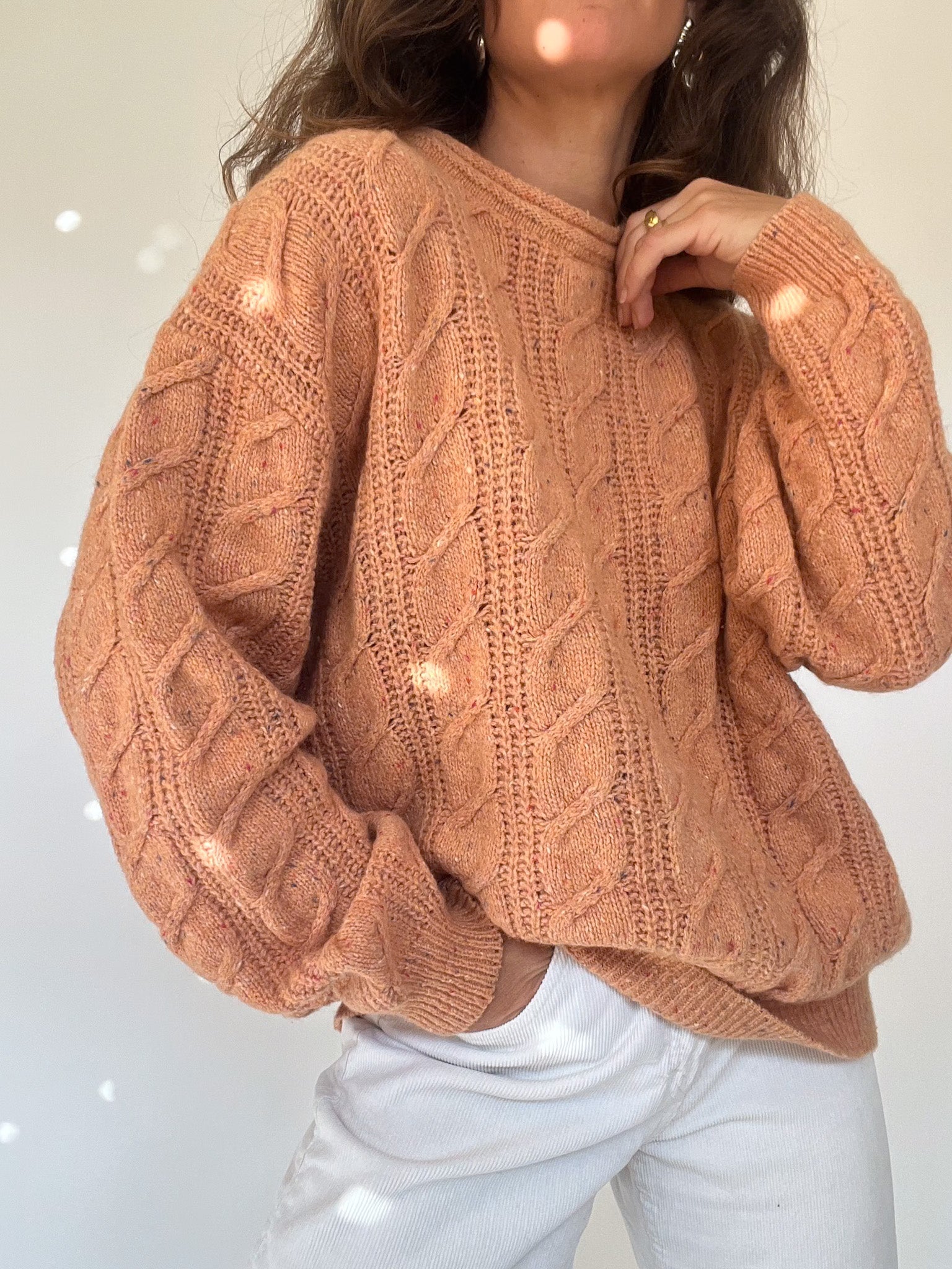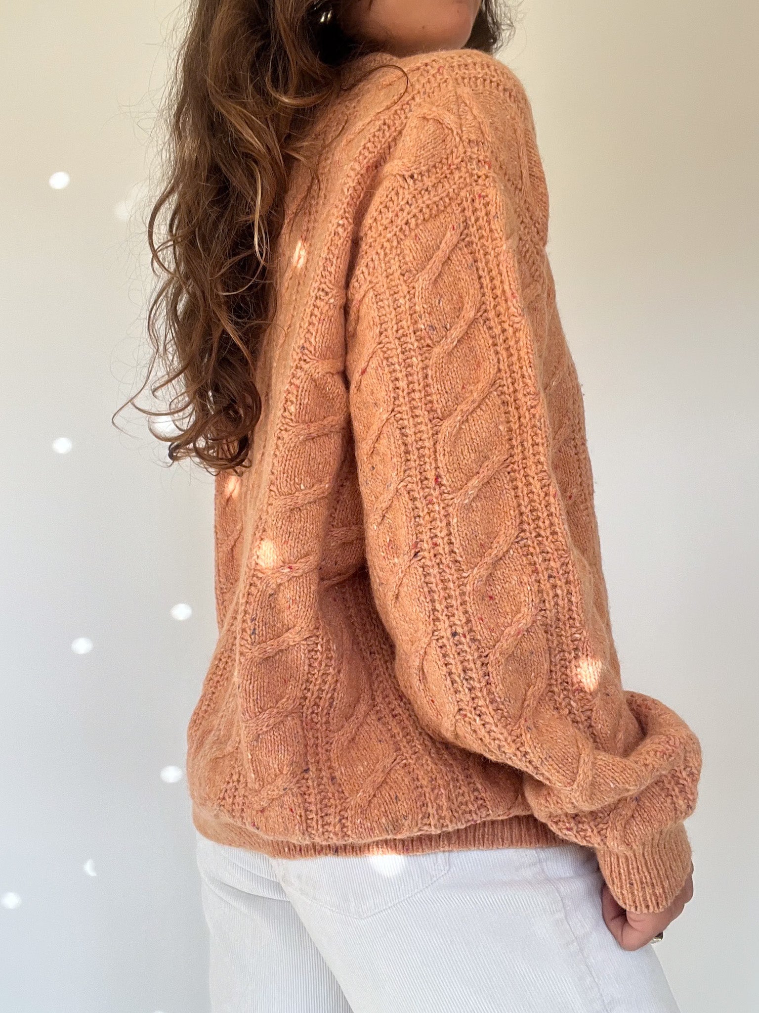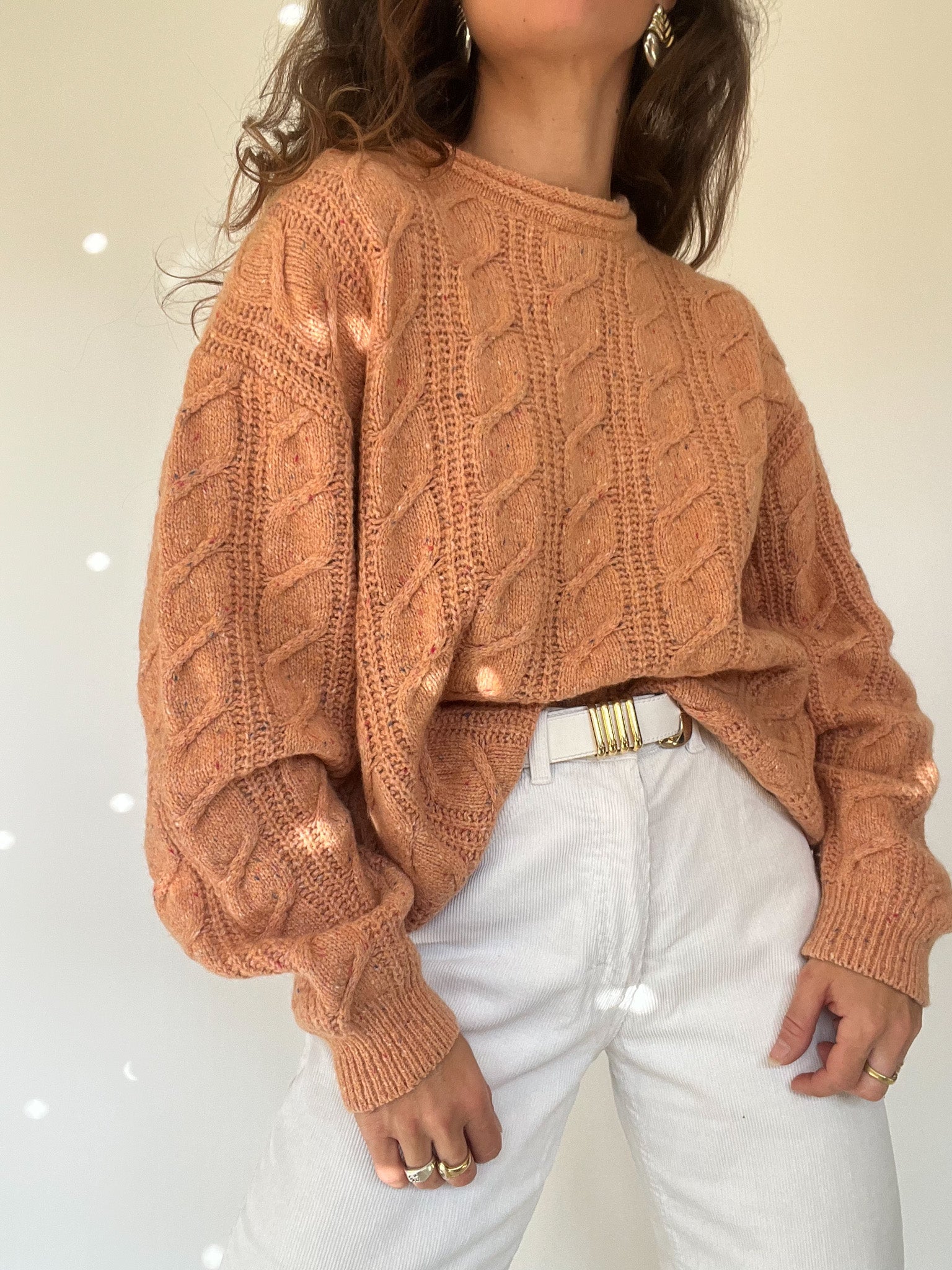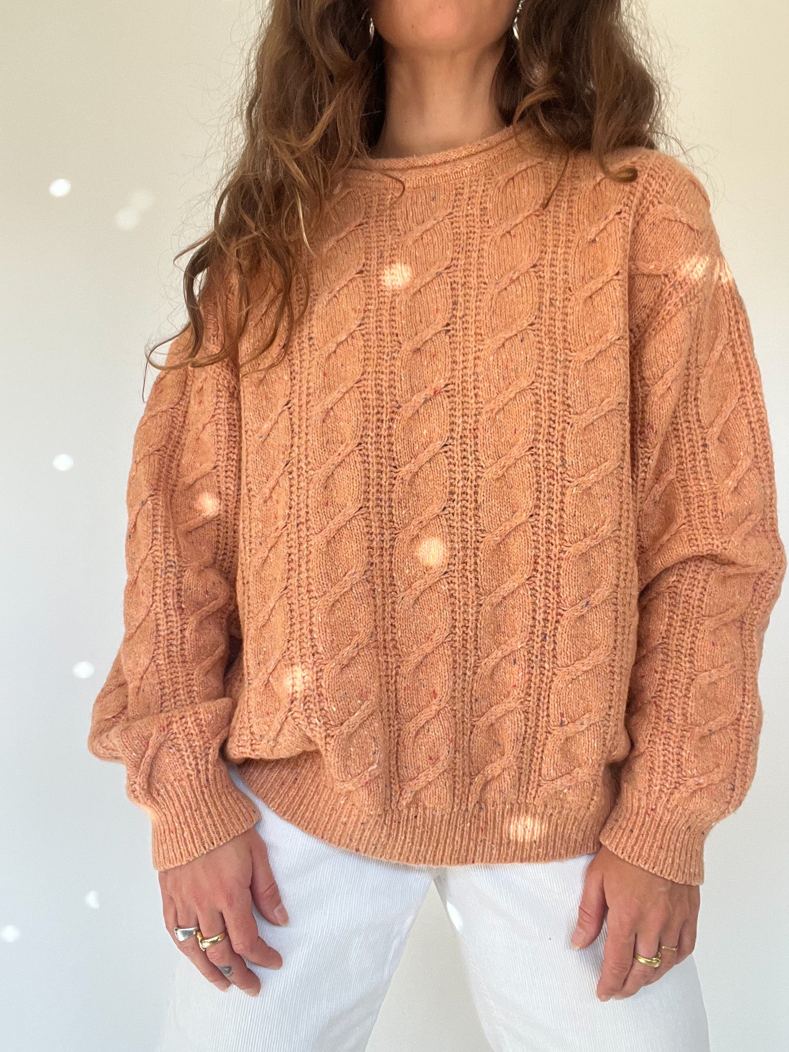 This thick textured cable knit sweater in warm peach tones is a celebration of vintage craftsmanship. With its slightly speckled yarn and oversized silhouette, it balances authenticity and coziness while elevating casual winter style.