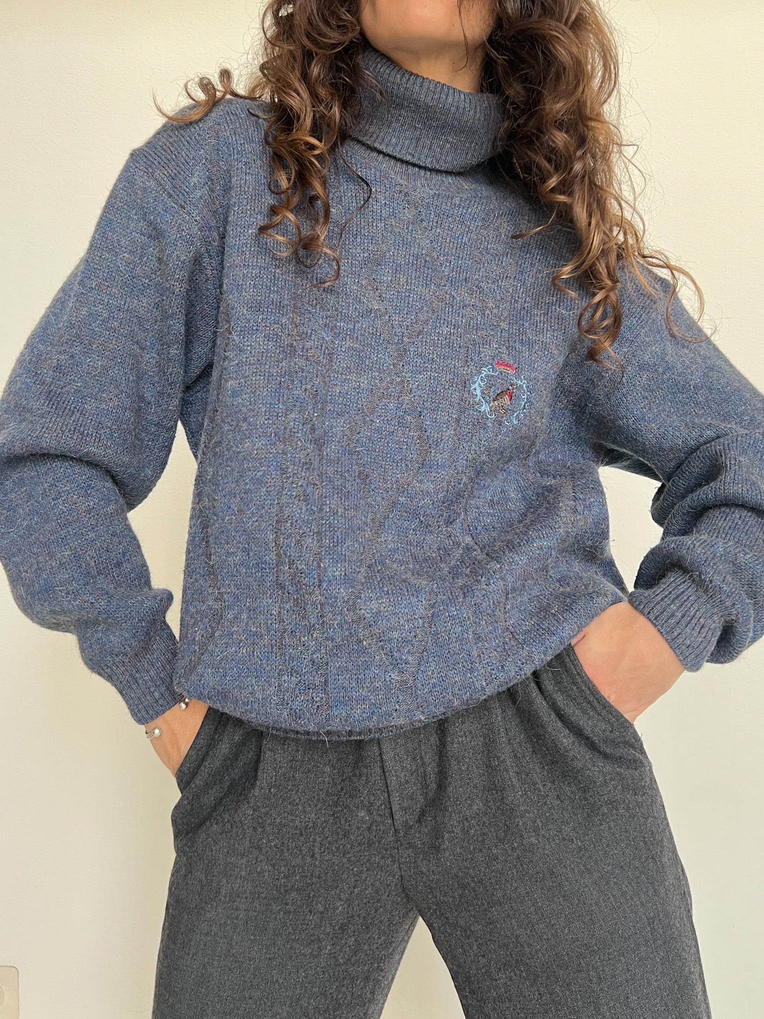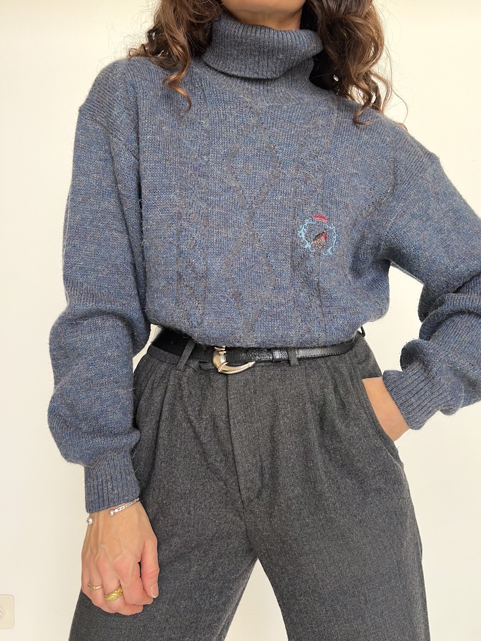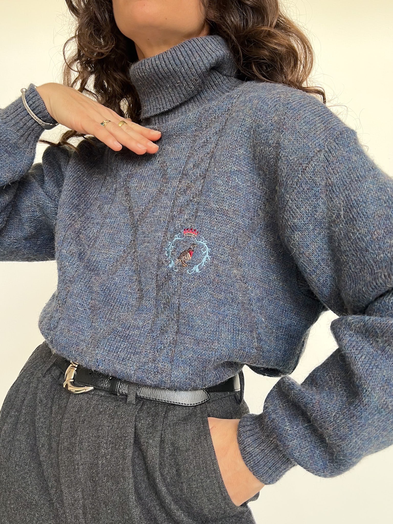 - Special features: Soft turtleneck, cozy knit texture, subtle embroidered detail, comfortable vintage fit