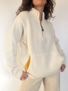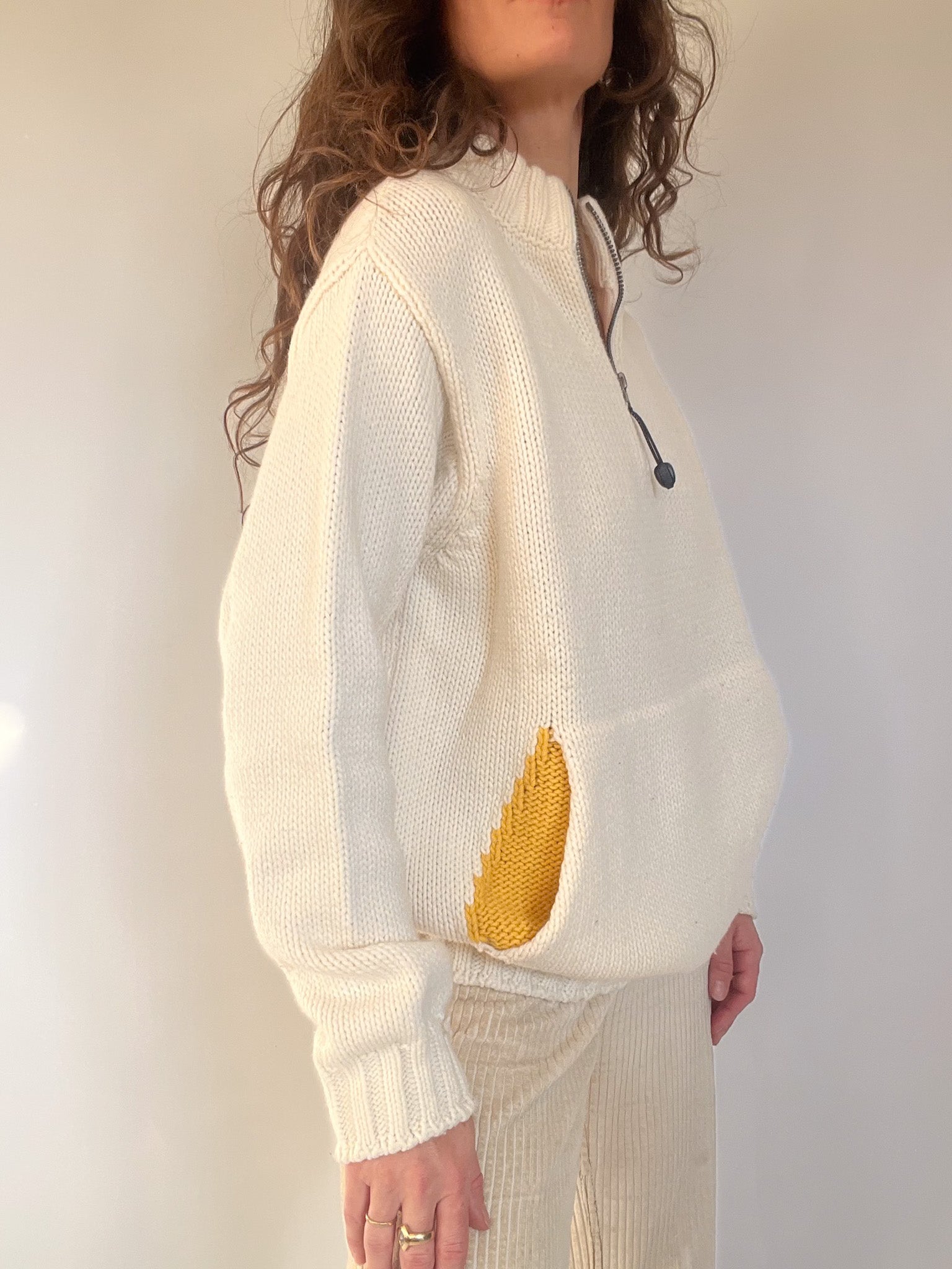• Special features: Half-zip collar, mustard knit side details, soft merino blend, relaxed sporty fit