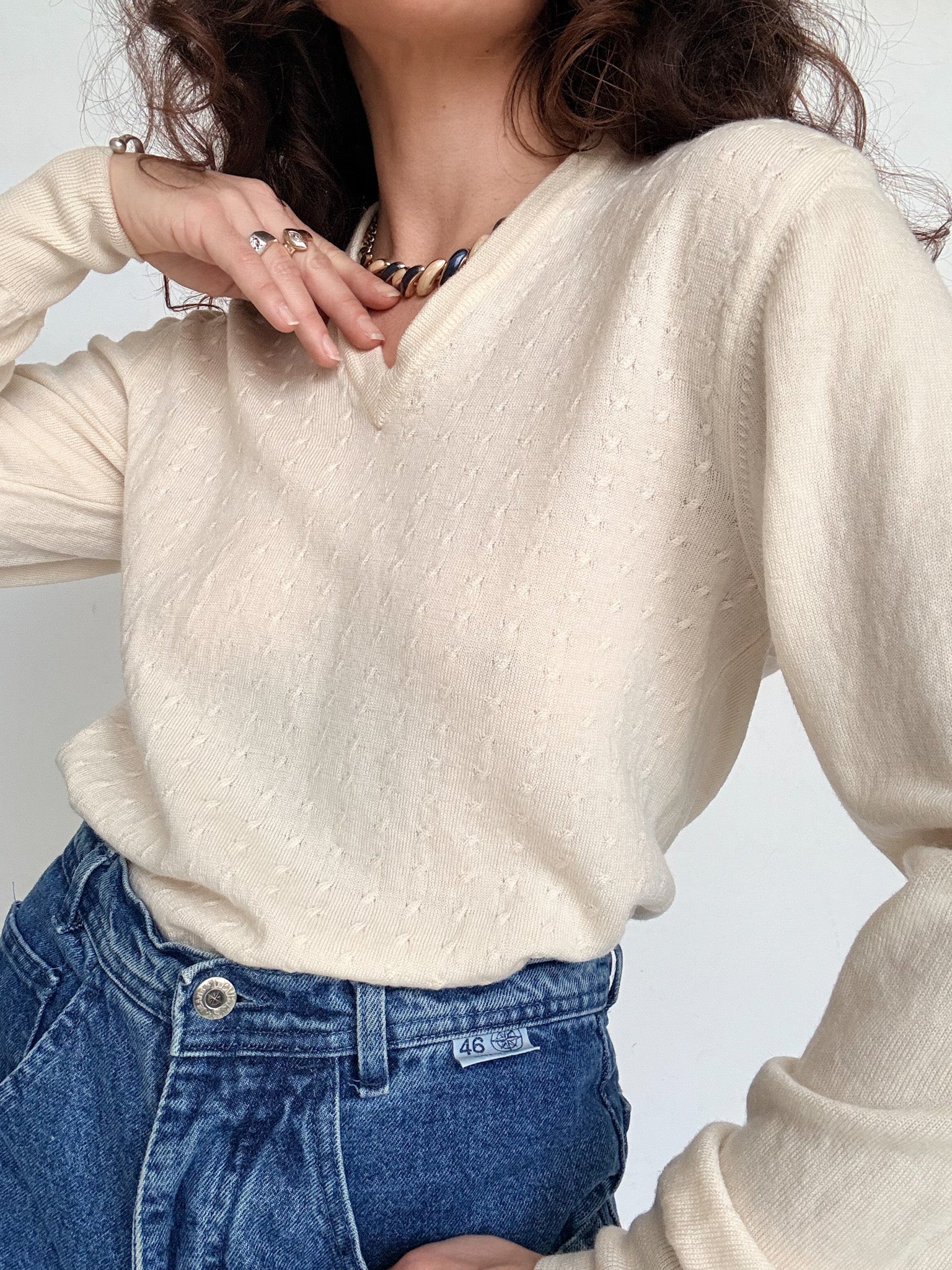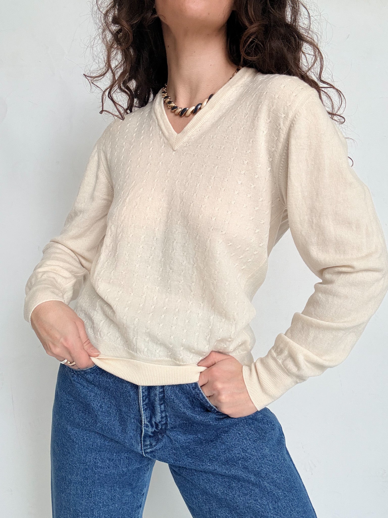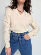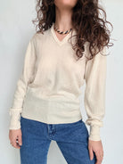 Chosen for its pure fabric quality and timeless simplicity, this piece is a true wardrobe essential. The soft cream tone and clean V-neck make it endlessly versatile, easy to wear on its own or layered under another knit for extra warmth. A discreet yet refined vintage pullover designed to follow you through seasons without ever feeling out of place.