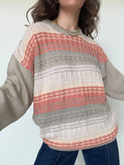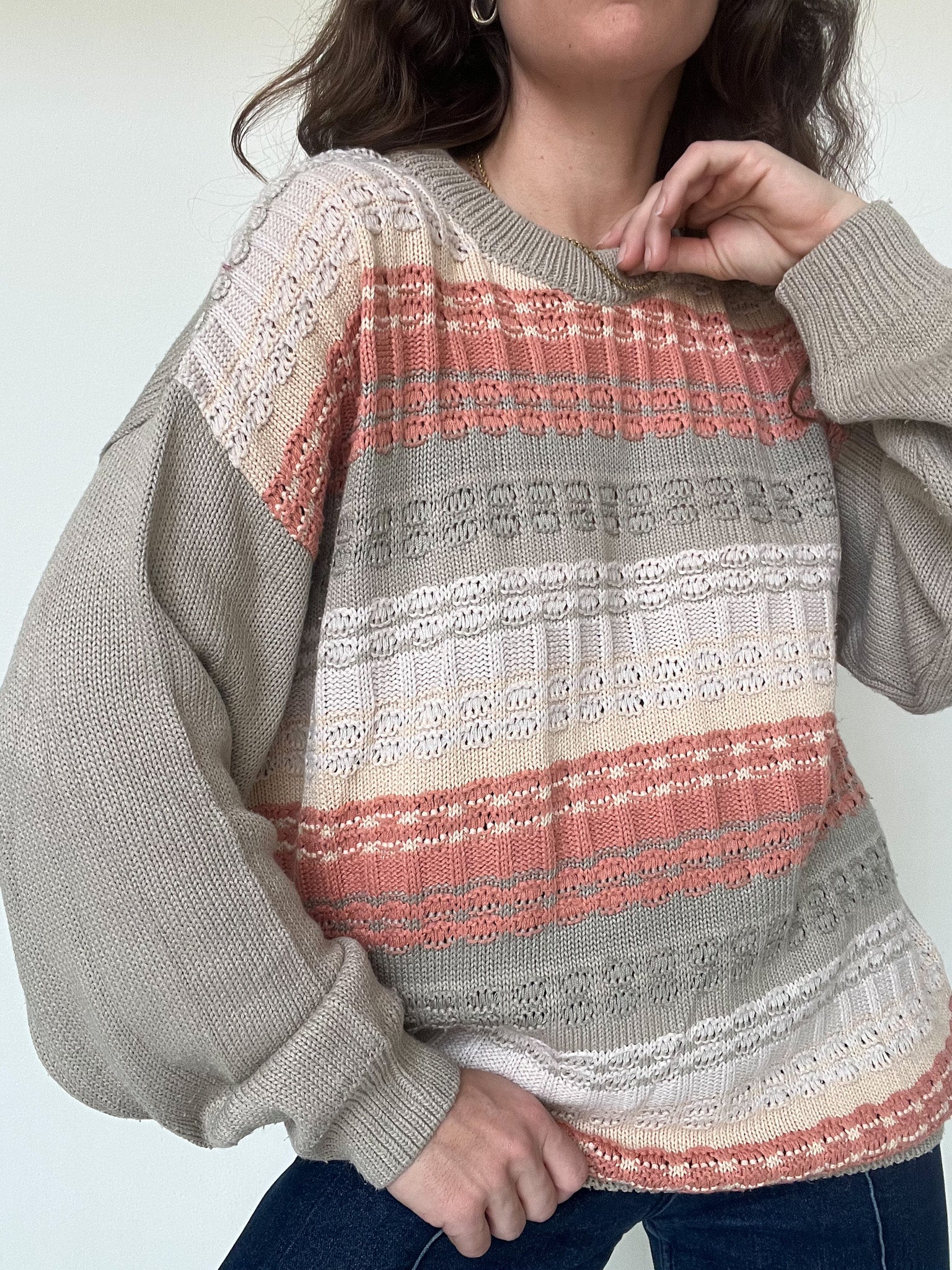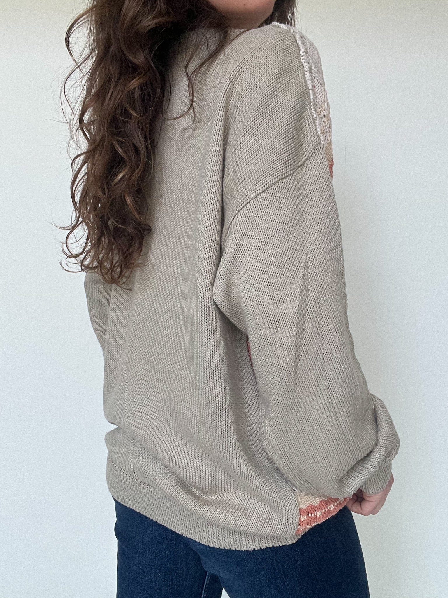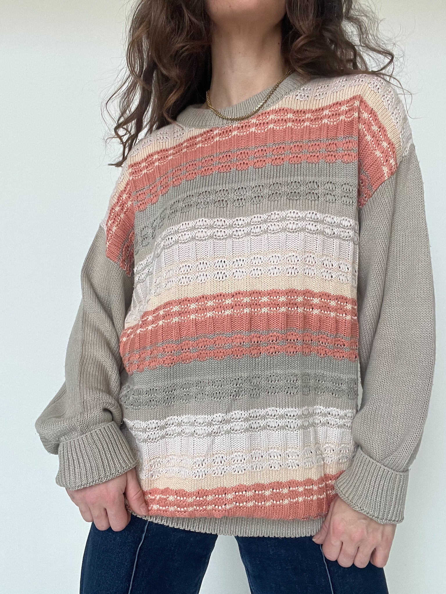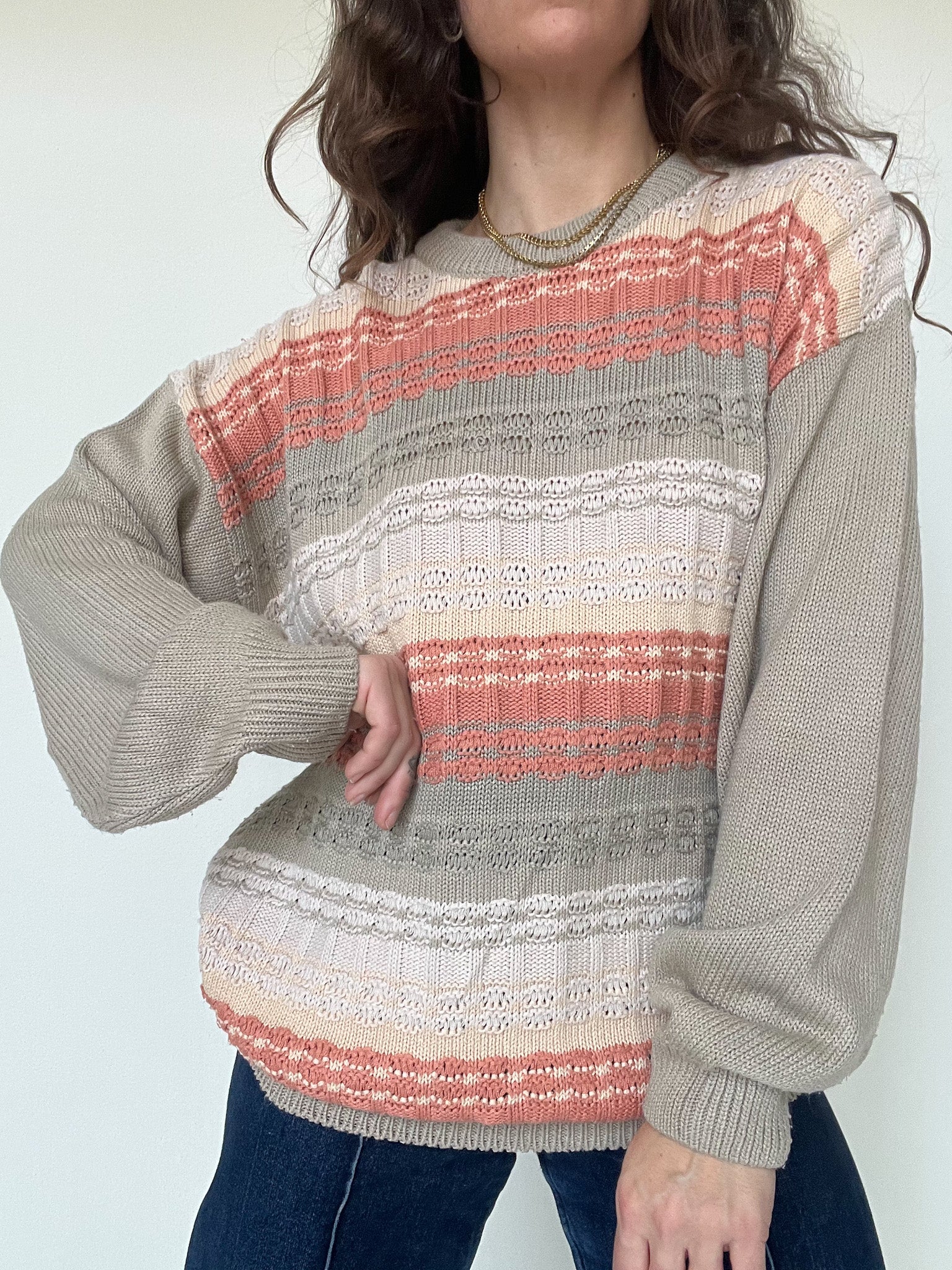 This vintage knit is all about softness and balance. The mix of beige, taupe and salmon tones creates a fresh yet cozy palette that feels light despite its winter weight. The textured knit plays with different stitches, giving depth and movement without overpowering the silhouette. Easy to wear, comforting and versatile, it works just as well layered in winter or casually thrown over the shoulders during cooler summer evenings. A refined everyday piece curated with intention. Skorpiones Vintage.