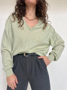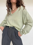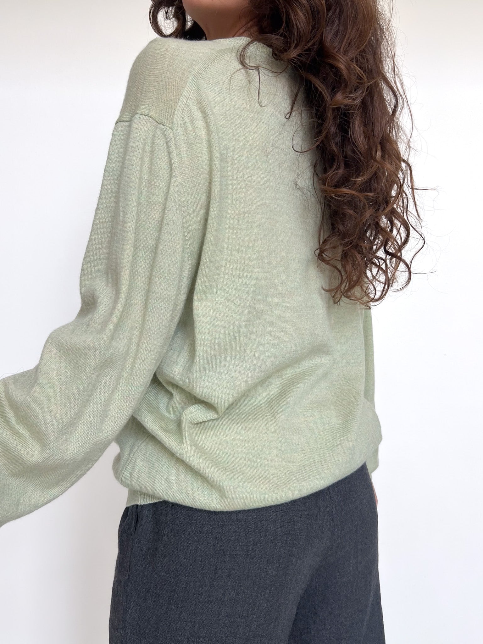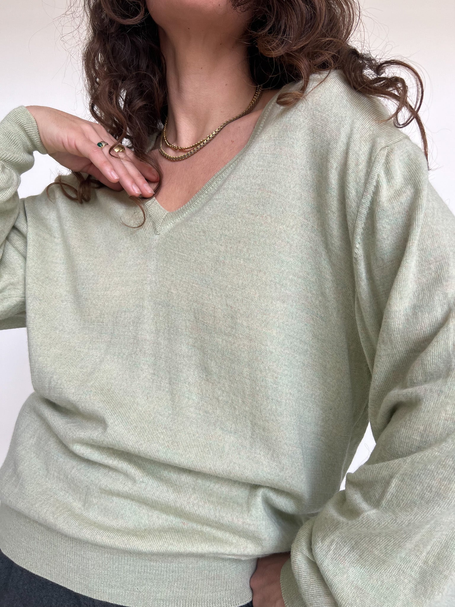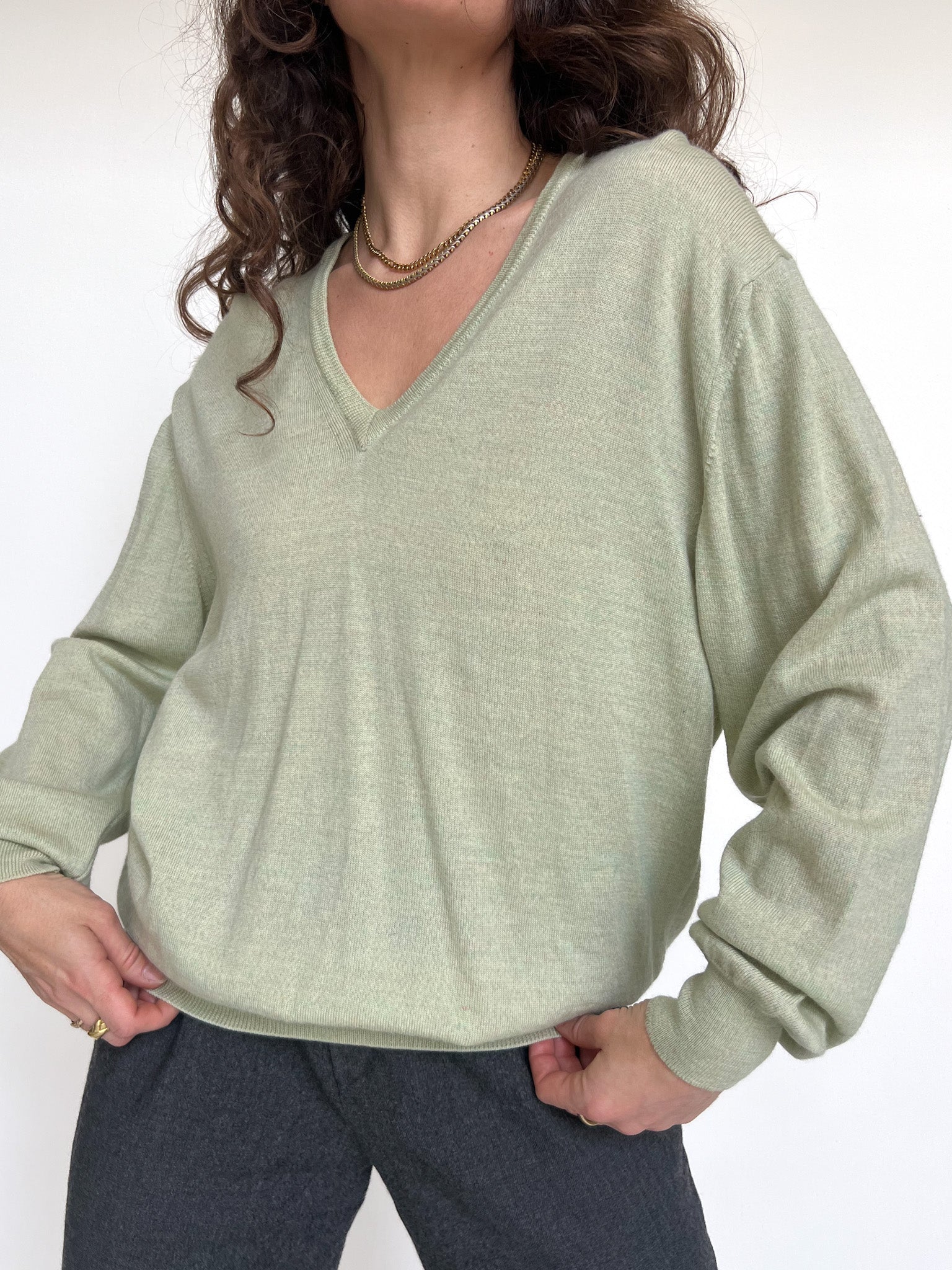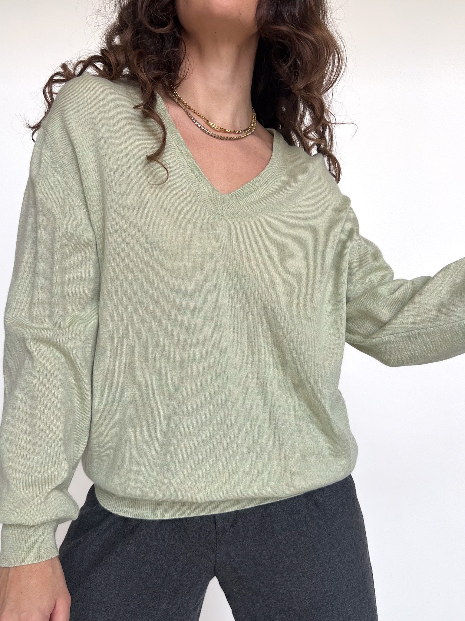 - Special features: Deep V-neckline, nuanced green tone with subtle rosy undertones, soft and high-quality knit