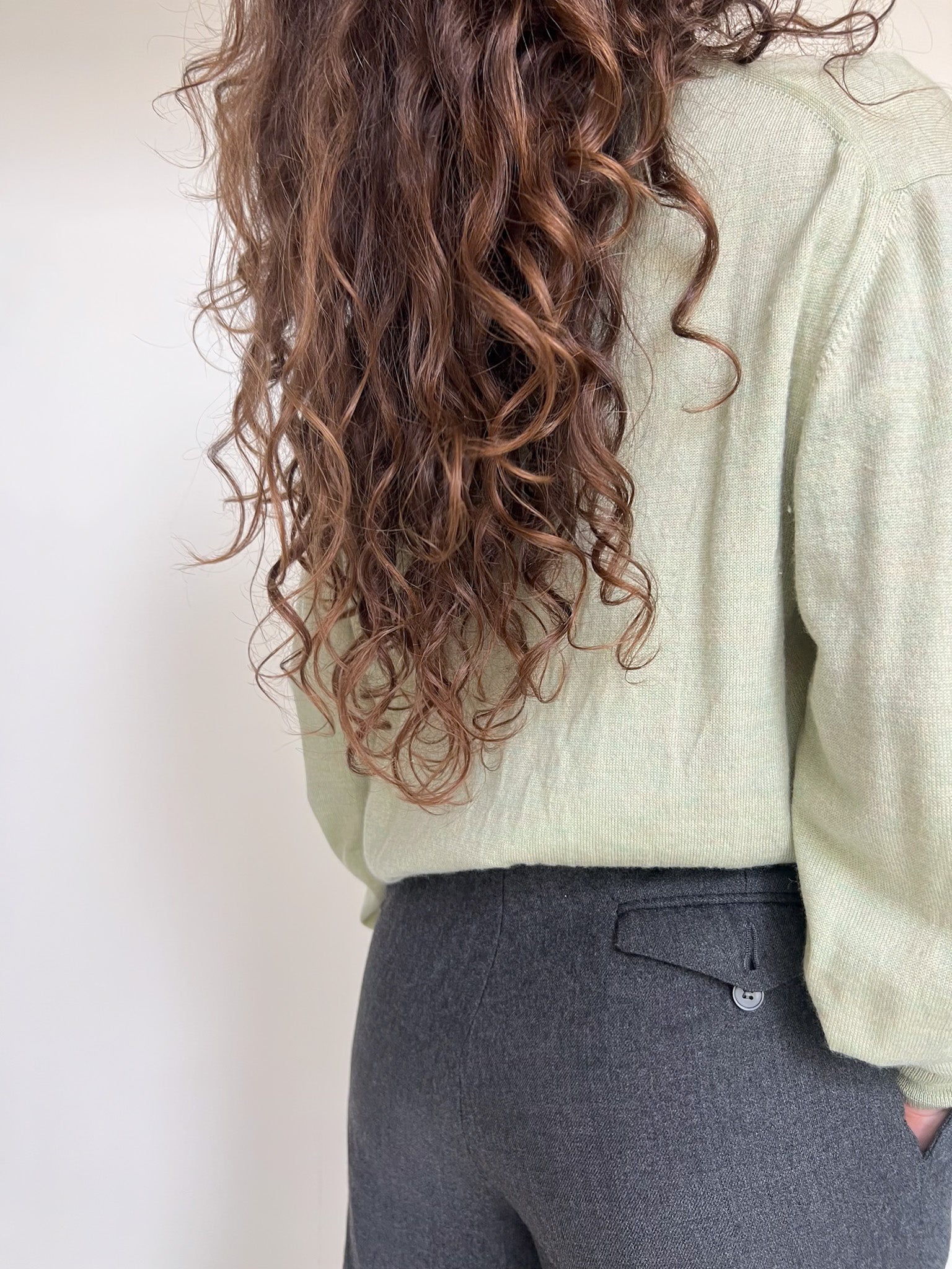 Chosen for its vibrant green shade and subtle depth of color, with soft rosy undertones woven into the knit that give it a unique visual richness. A piece that stands out for its exceptional quality and refined simplicity, effortless yet full of character when worn.
