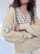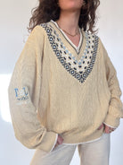 - Special features: Geometric V-neck pattern, white line details at cuffs and hem, soft cream knit, relaxed vintage fit