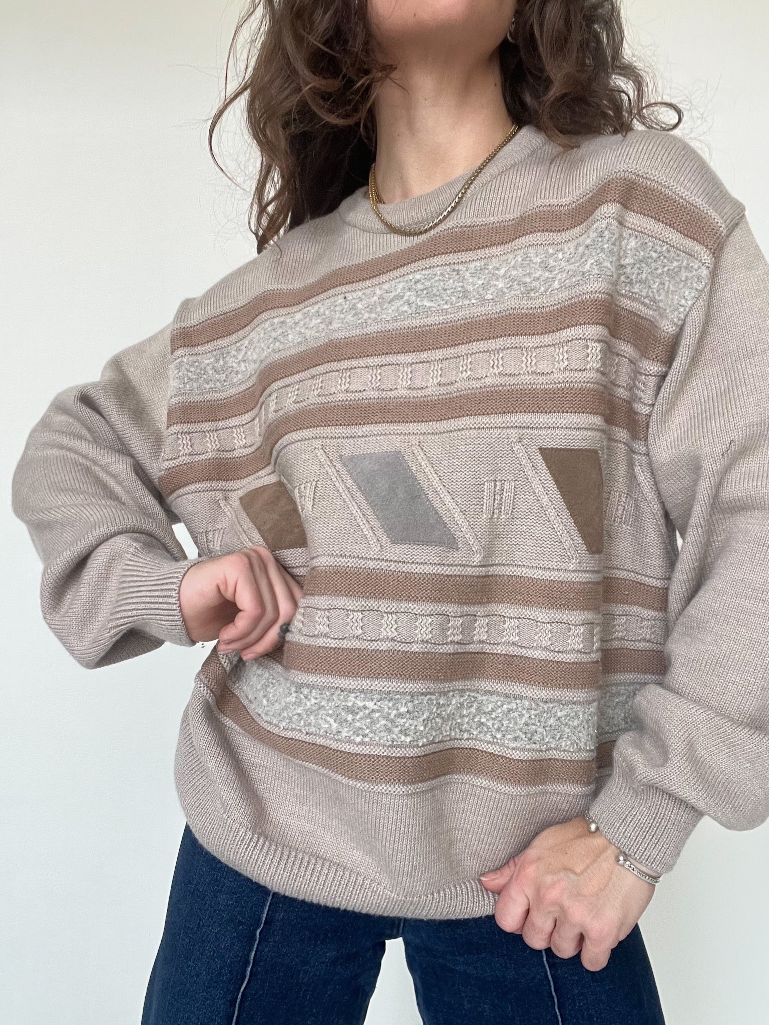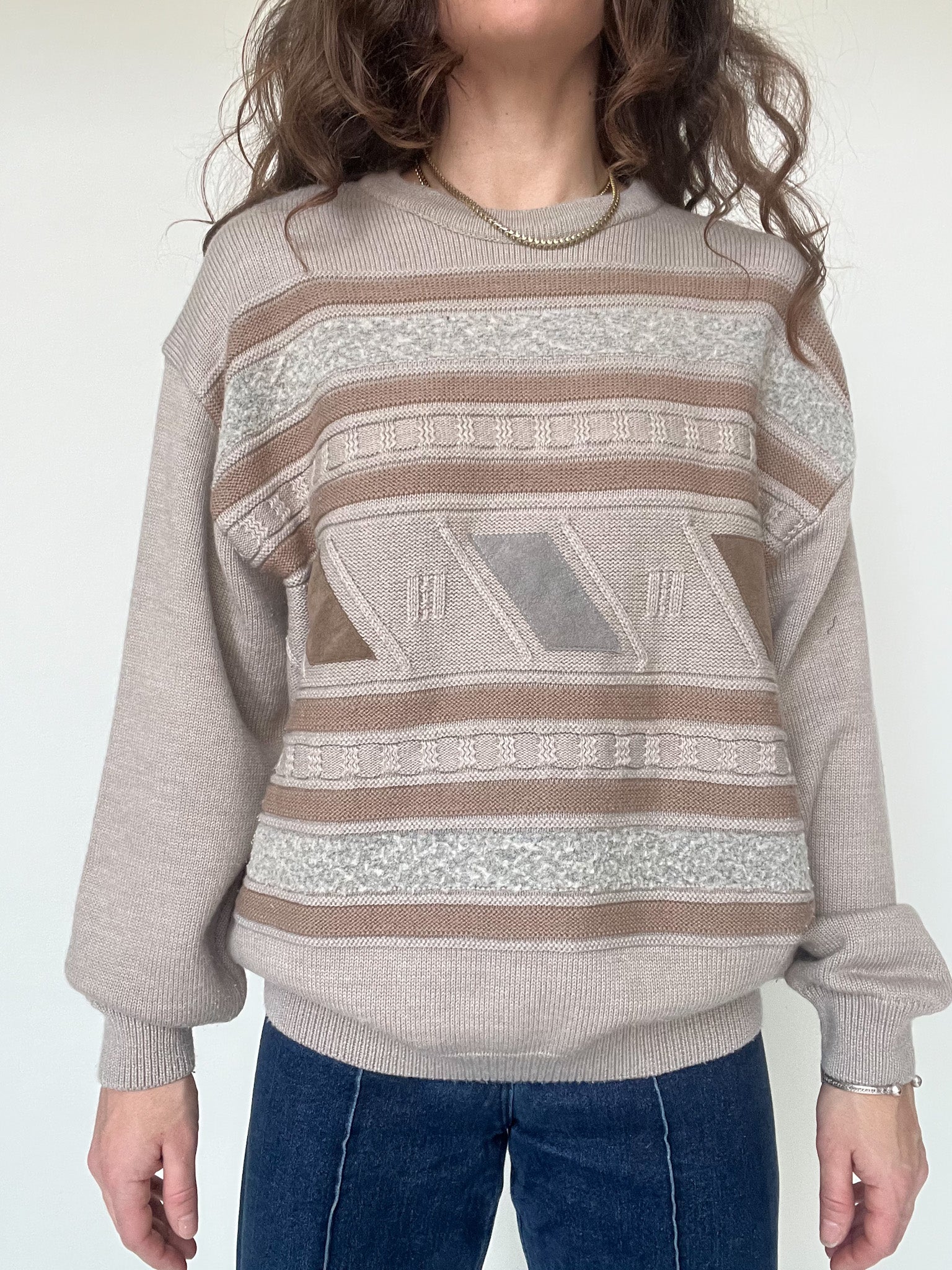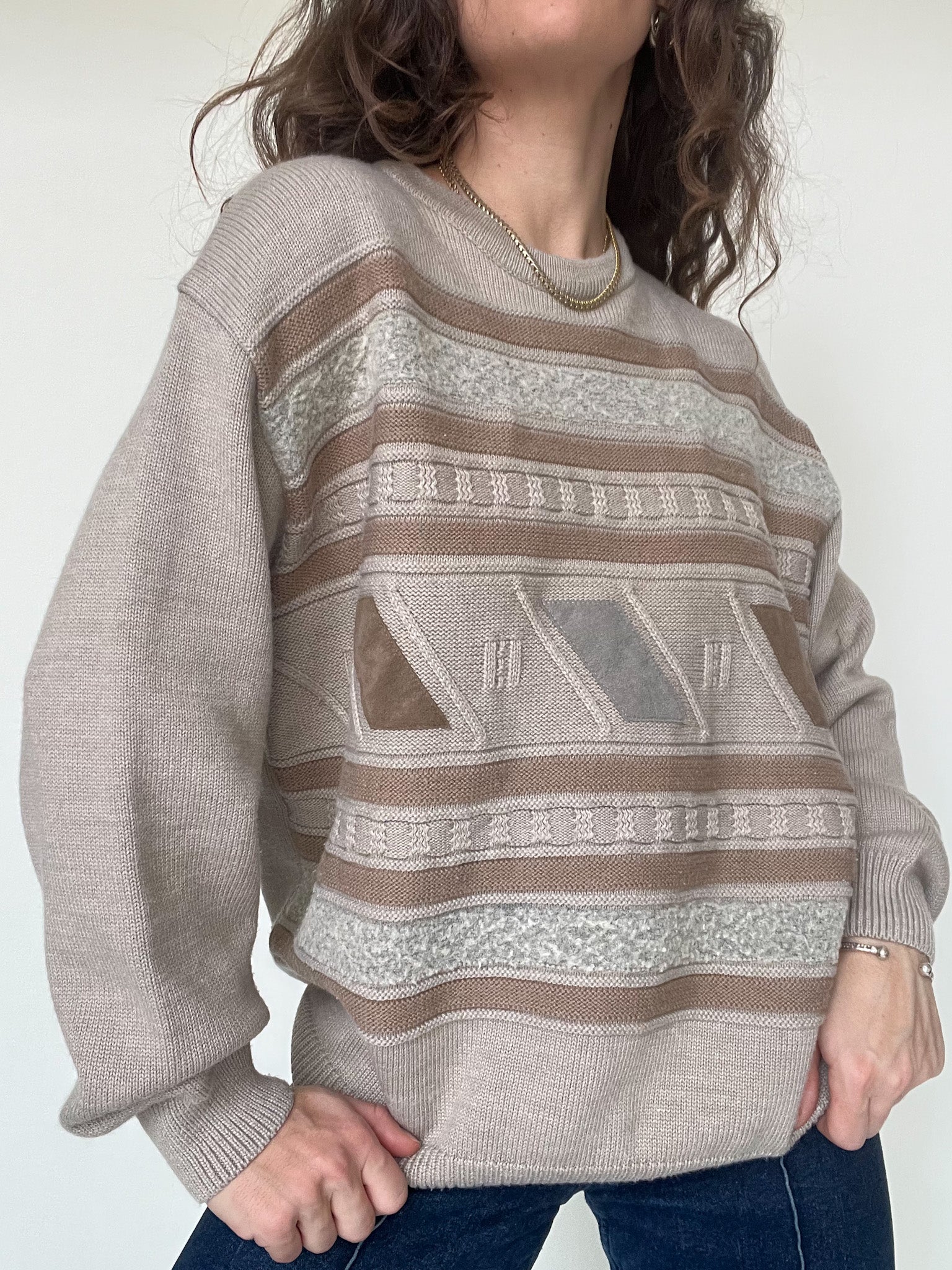 This vintage knit pullover stands out through its subtle pattern and beautifully soft color palette. Shades of beige, sand and light brown blend harmoniously, creating a calm and comforting visual rhythm.