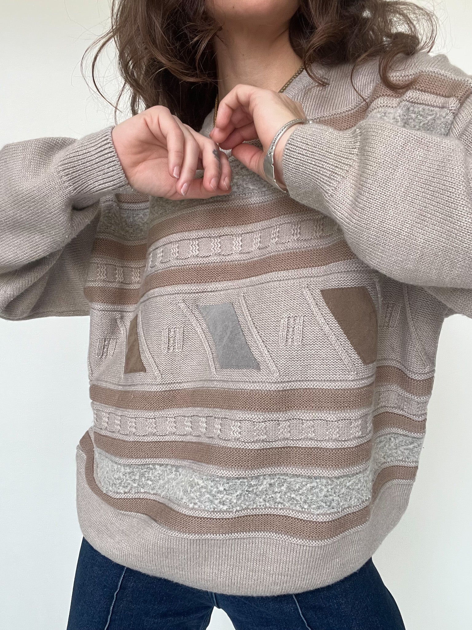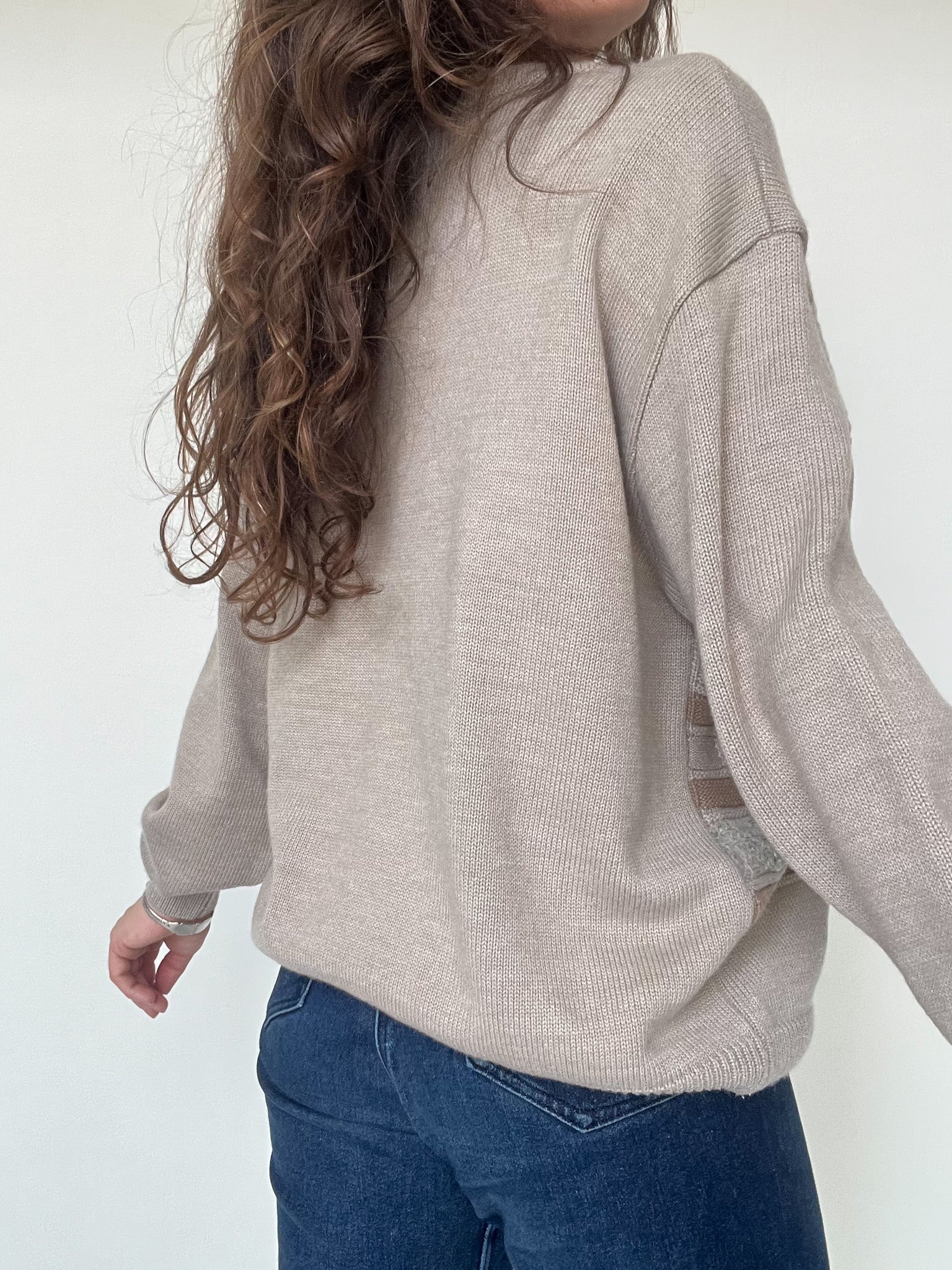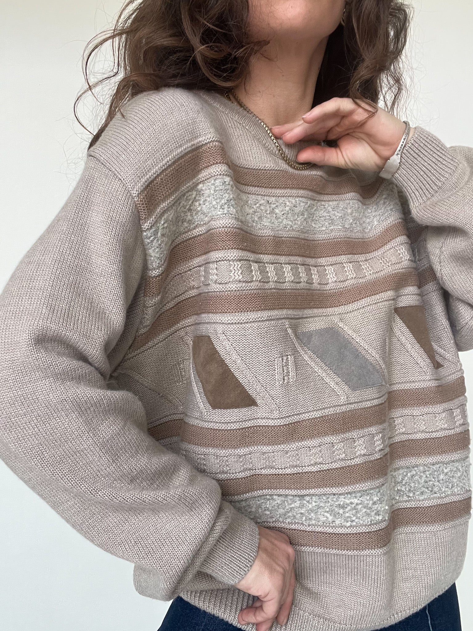 This vintage knit pullover stands out through its subtle pattern and beautifully soft color palette. Shades of beige, sand and light brown blend harmoniously, creating a calm and comforting visual rhythm.
