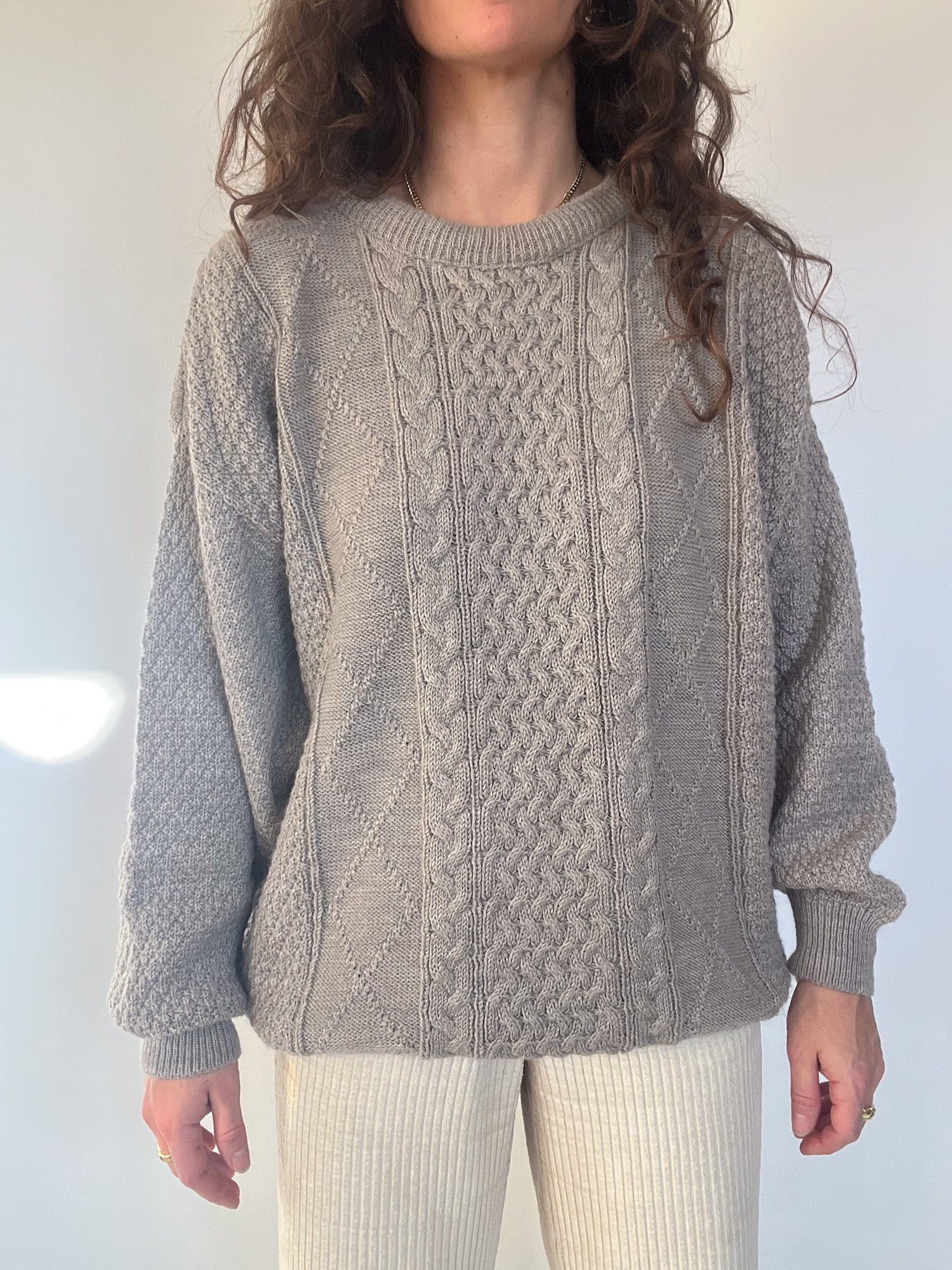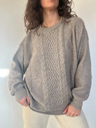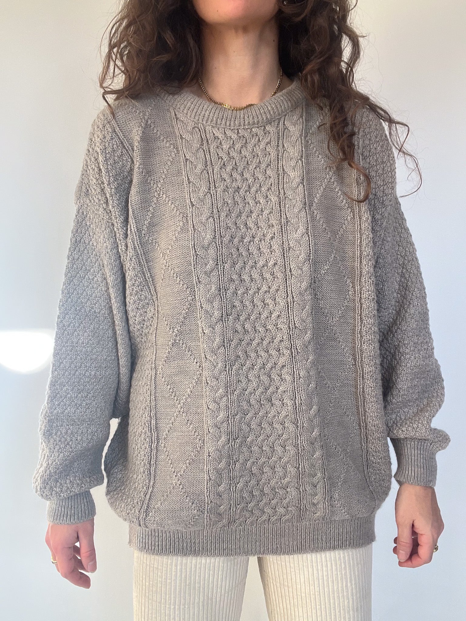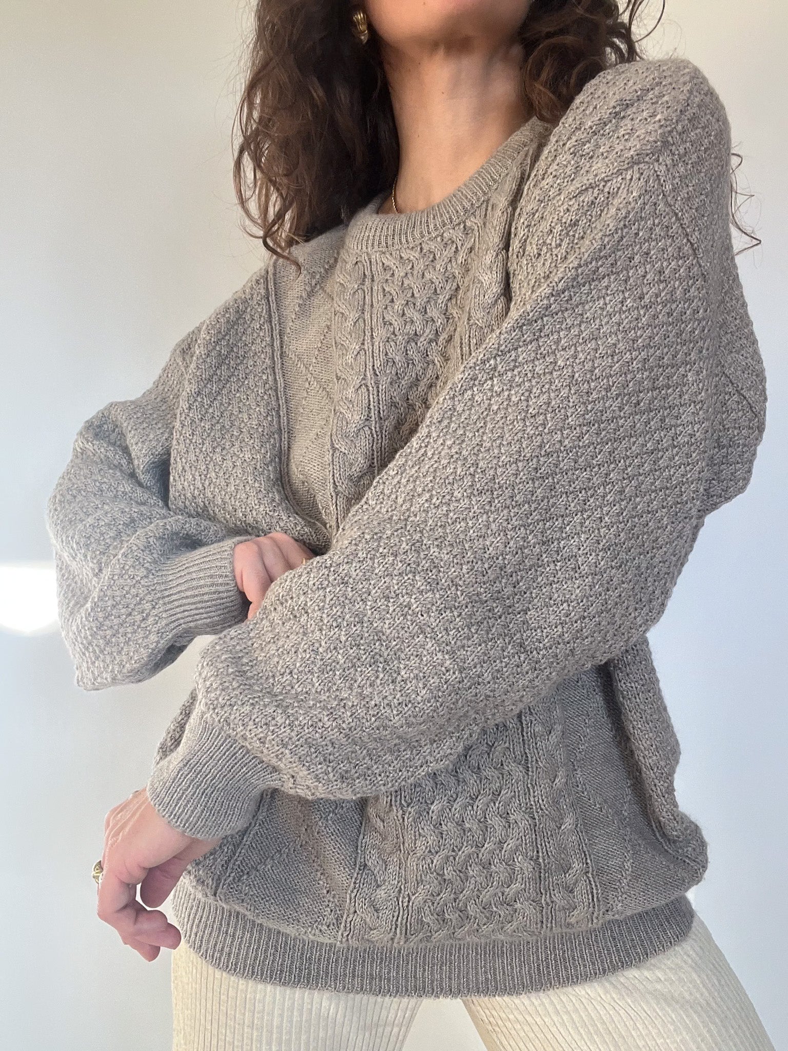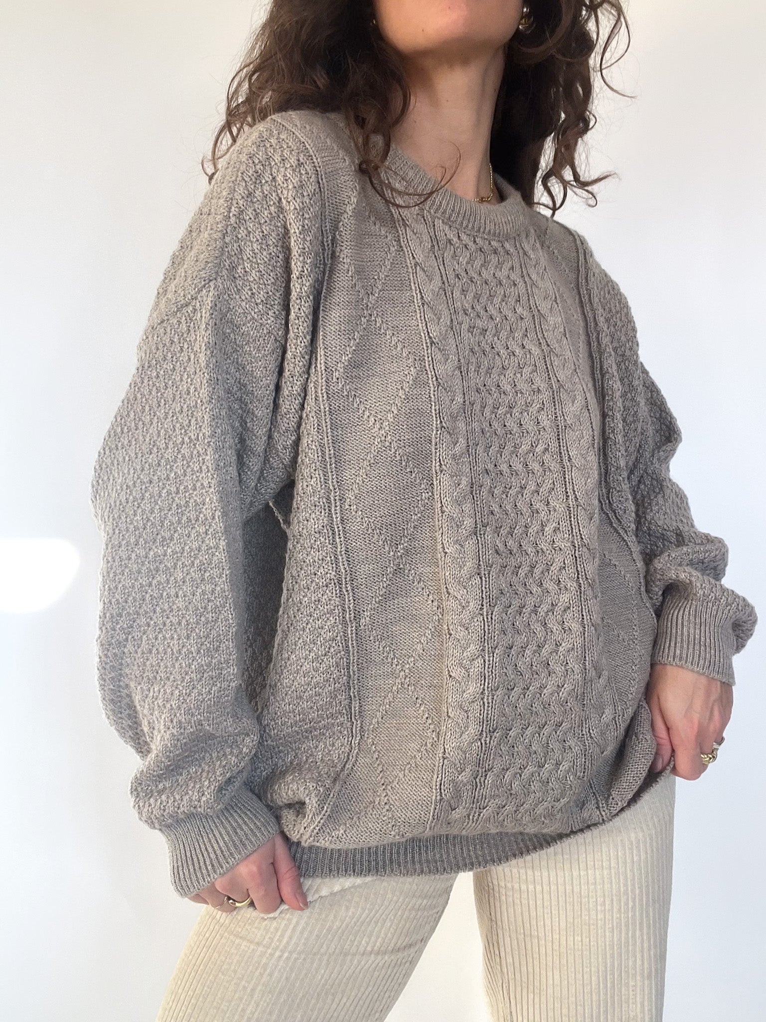 Selected for its cosy feel and beautiful textured knit, this Italian vintage sweater is all about comfort with a touch of quiet style. The taupe shade makes it easy to pair with anything, while the mix of cable and textured stitches gives it depth without being too much. Soft, warm, and effortlessly wearable — a simple favourite for everyday.