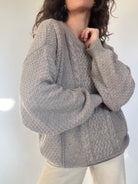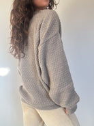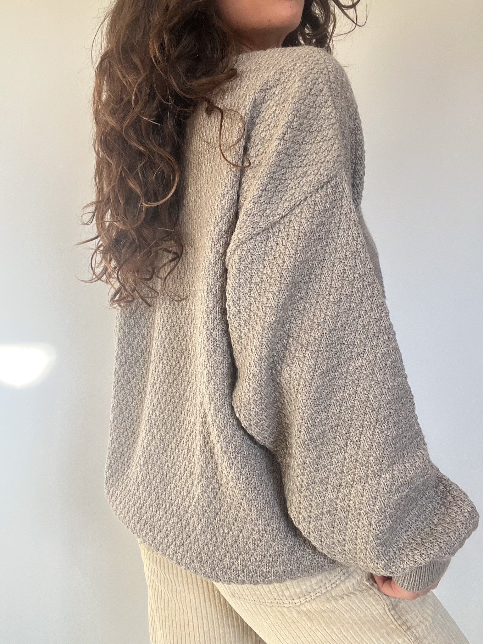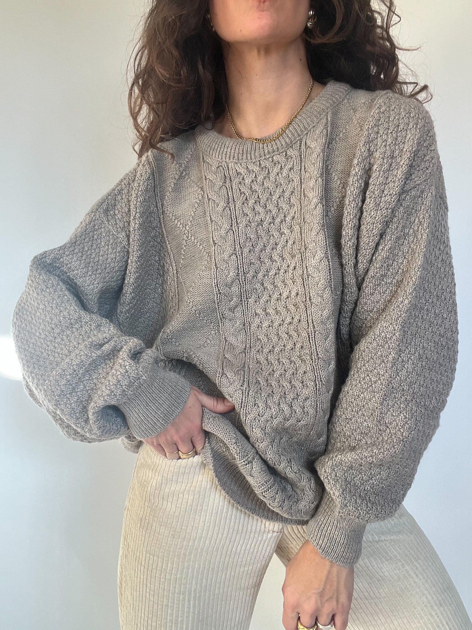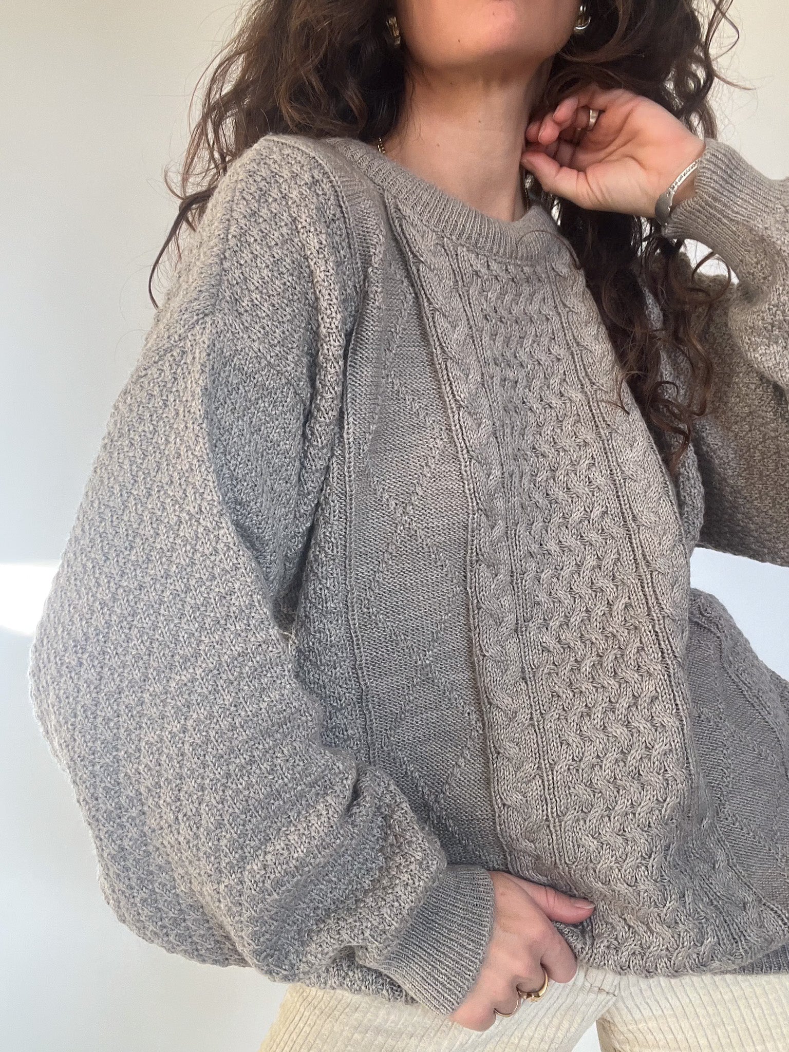 Selected for its cosy feel and beautiful textured knit, this Italian vintage sweater is all about comfort with a touch of quiet style. The taupe shade makes it easy to pair with anything, while the mix of cable and textured stitches gives it depth without being too much. Soft, warm, and effortlessly wearable — a simple favourite for everyday.