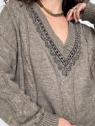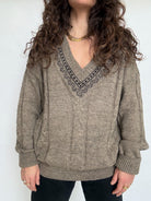 - Special features: Italian knit, deep V-neckline with patterned trim, cable knit texture, relaxed silhouette