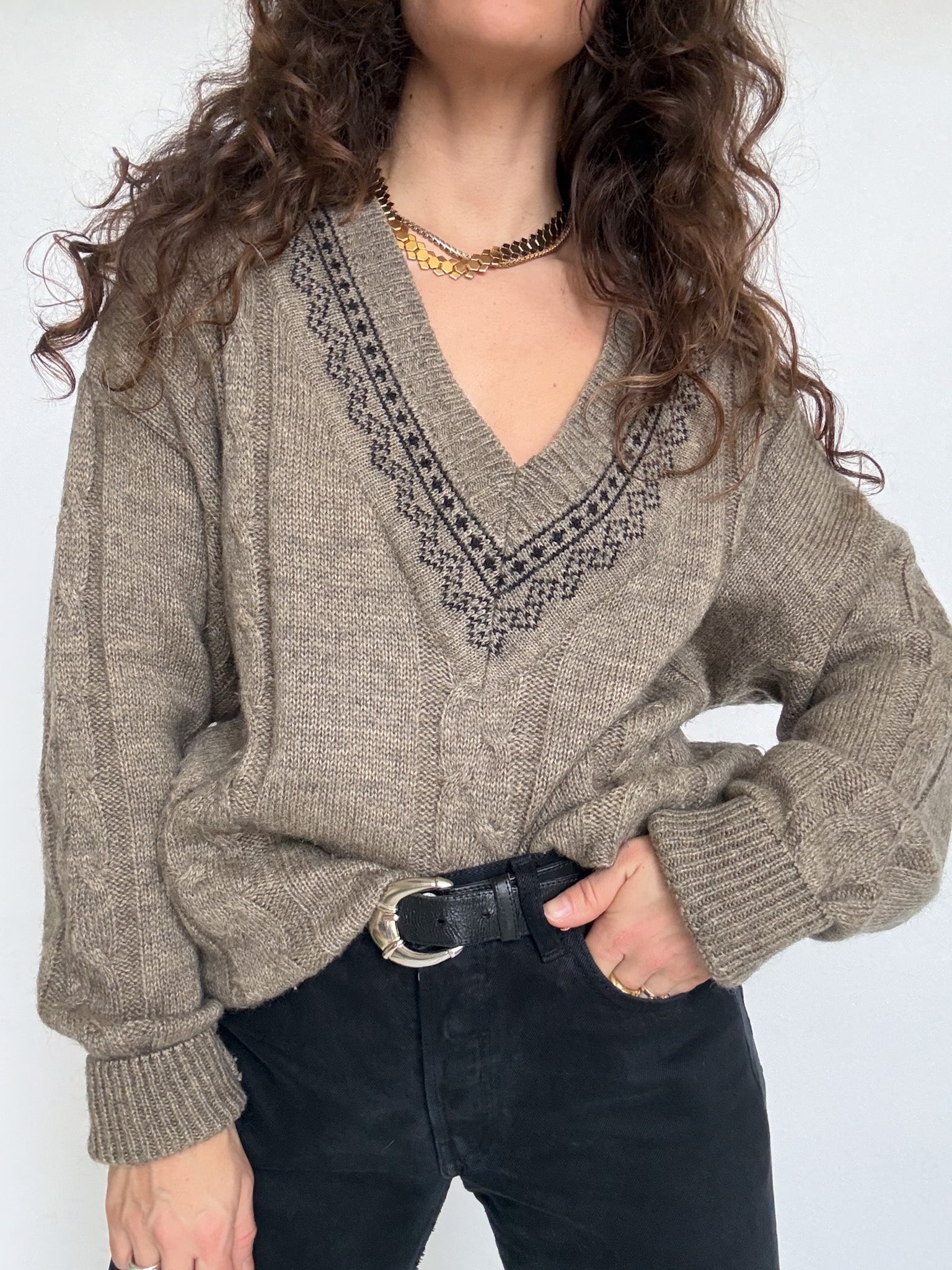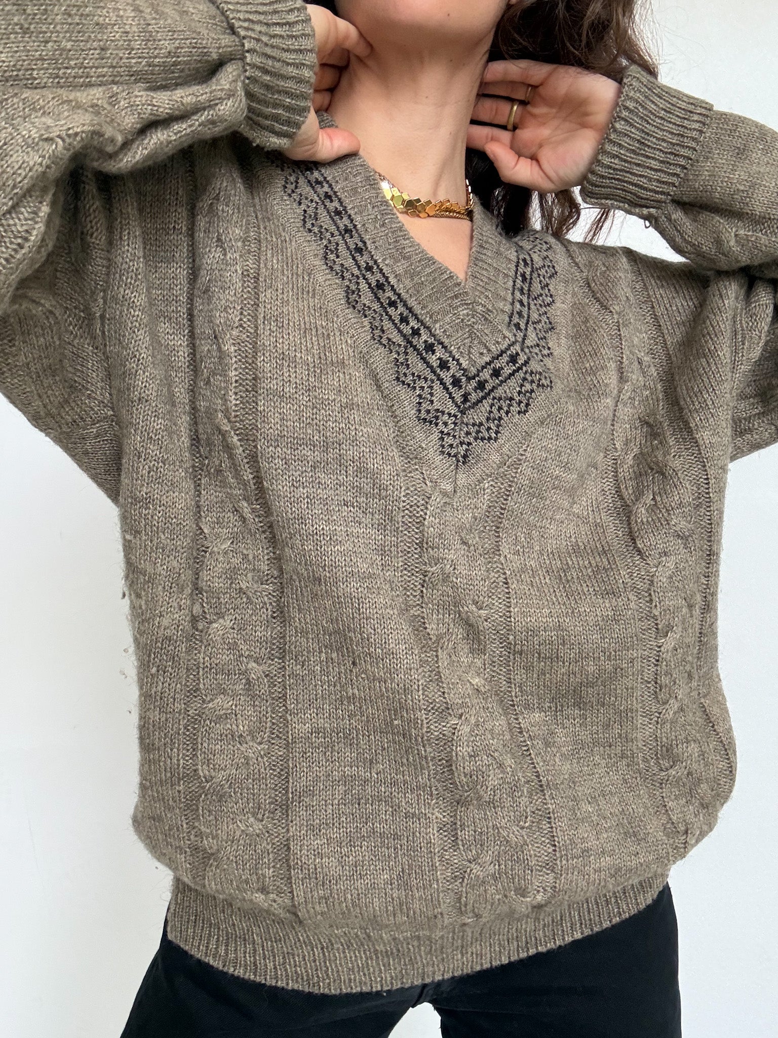 Chosen for its perfectly balanced V-neck and the subtle graphic detailing that frames the neckline with character. This knit stands out through its textured cable construction and its soft, earthy tone that feels both timeless and easy to style. The relaxed men’s cut gives it a natural confidence, whether worn loose or slightly structured. A strong vintage knit, selected for its details, comfort and quiet elegance.